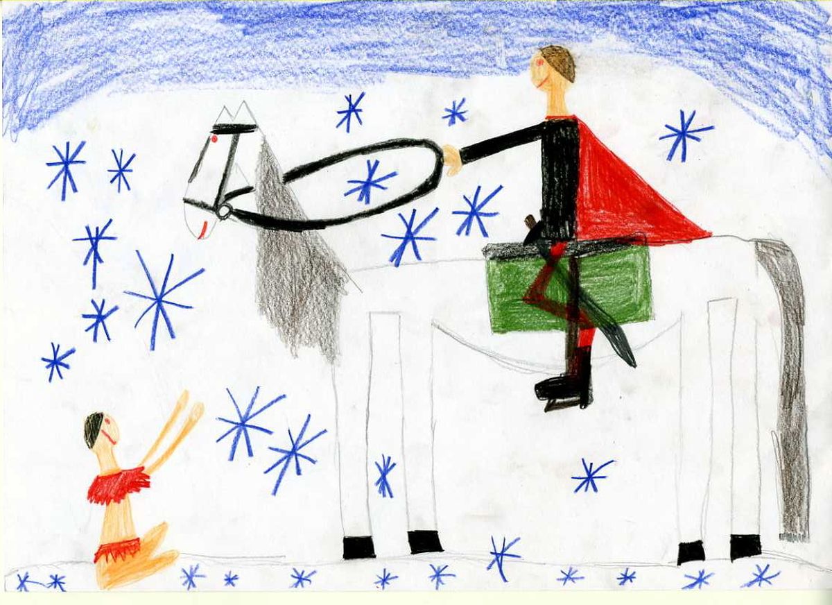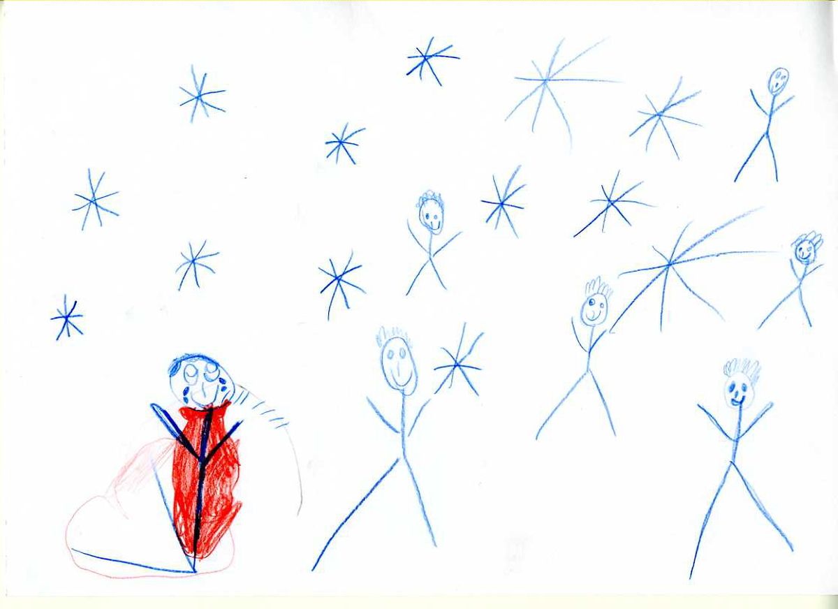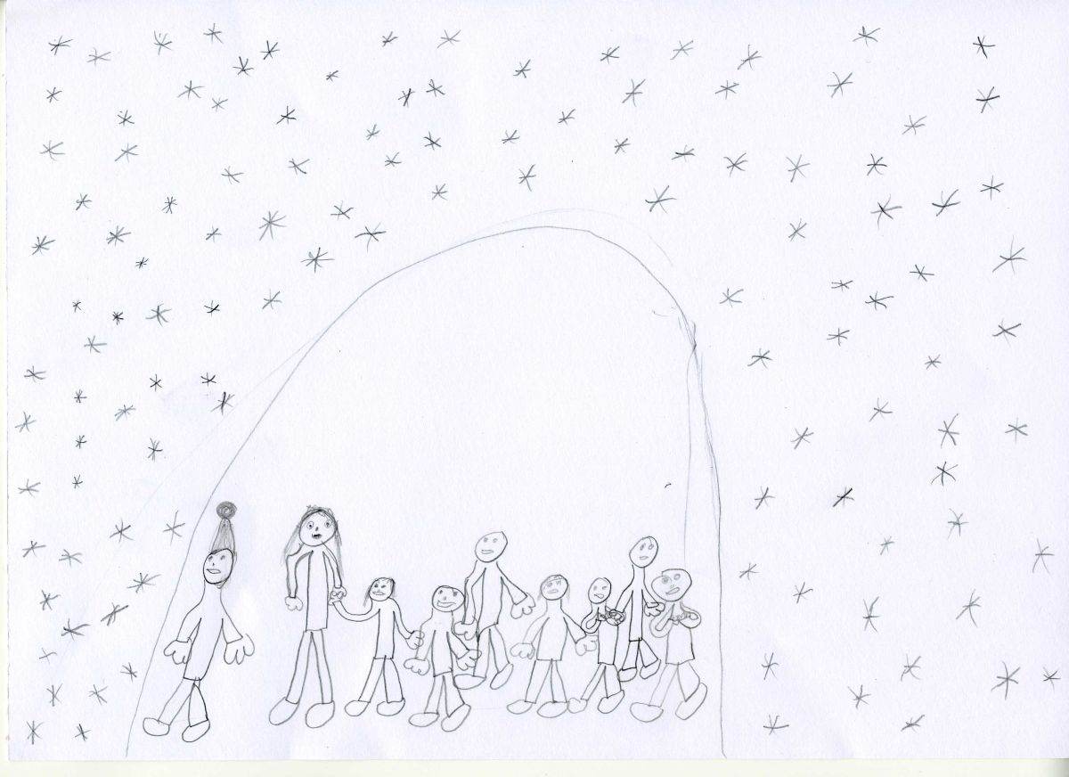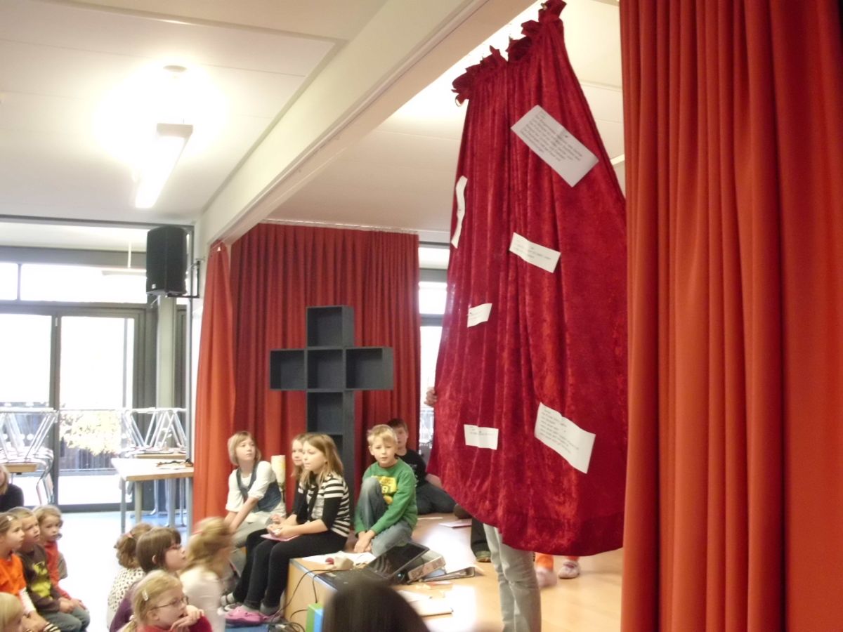 Nach der Begrüßung durch die Schulseelsorgerin Schwester Magdalena sangen die Kinder gemeinsam das bekannte Lied "St. Martin". Danach führten die Kätzchen durch die Andacht indem sie Texte lasen und dazu selbstgemalte Bilder an der Leinwand zeigten. Symbolisch trat St. Martin auf und teilte seinen roten Mantel, auf den dann Gedanken der Kätzchen-Kinder kamen, die sich um die Frage drehten: Wie kann ich teilen?
