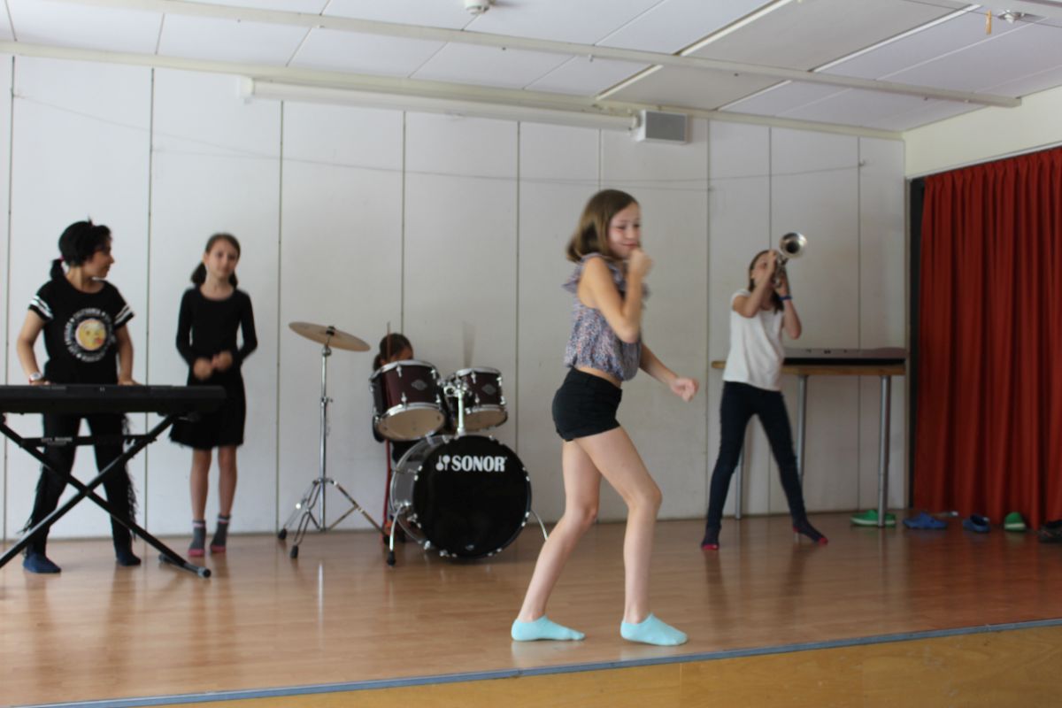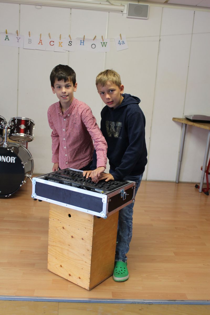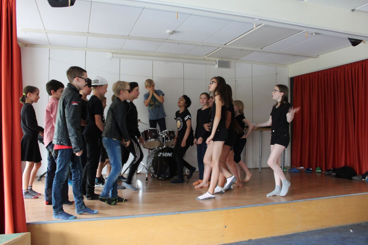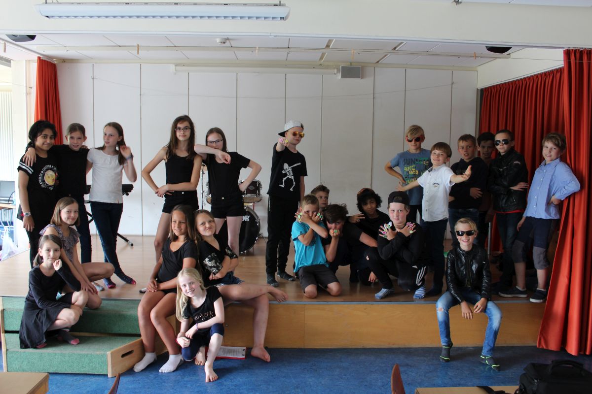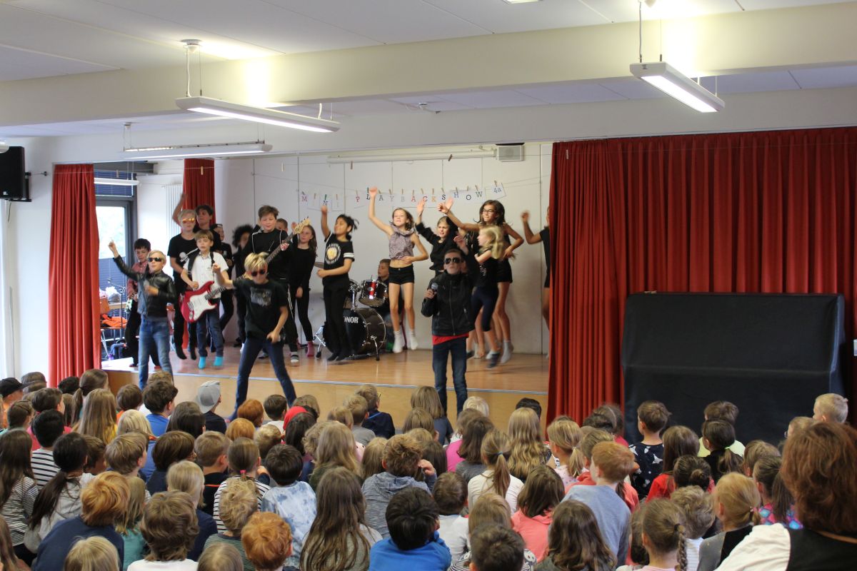 Was ist das, wenn die Wände der Aula wackeln, eine ganze Klasse auf der Bühne hüpft und die anderen 175 Kinder wie auf einem Konzert tanzen? Genau - es ist die Miniplaybackshow der Klasse 4a!