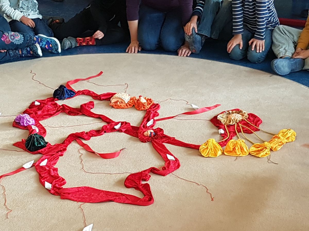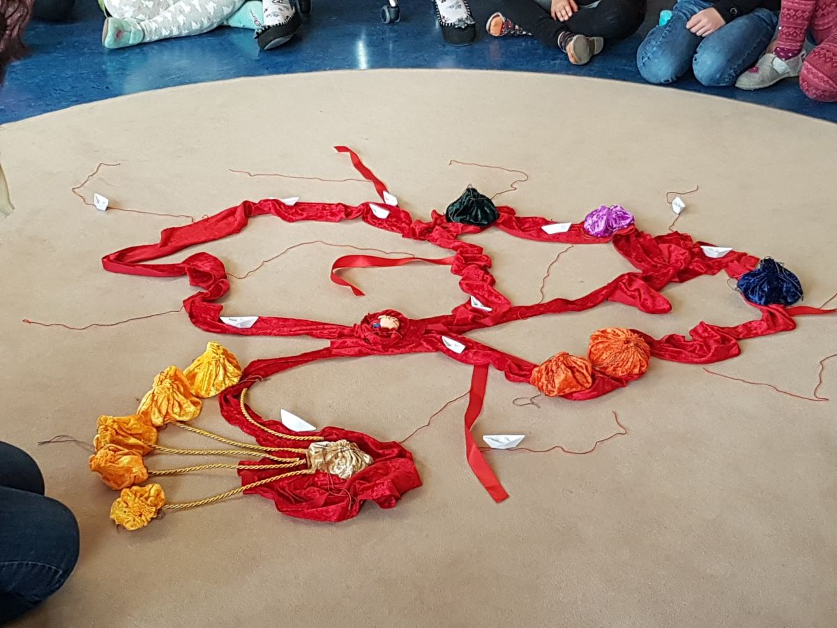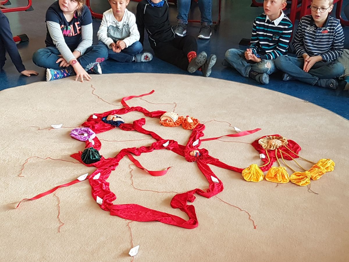 Zum Beispiel bei der großen Erzählung nach Montessori "Der Große Fluss", bei dem es um den Aufbau und die Wirkungsweise des menschlichen Körpers geht. Der Fluss symbolisiert das Blut, das alle Organe mit Lebenswichtigem versorgt.