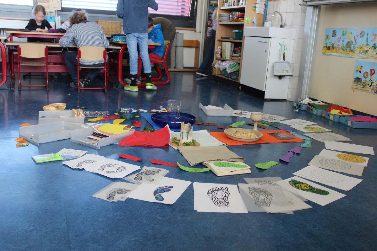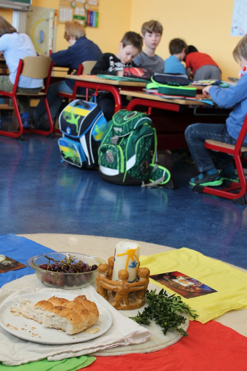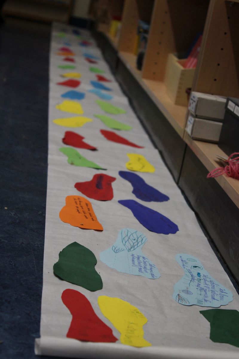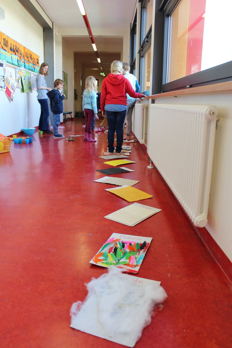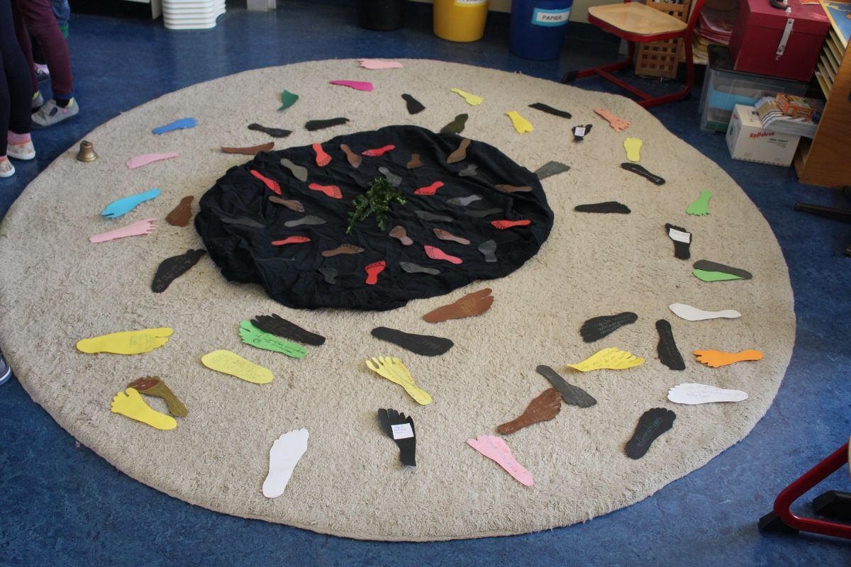 Daran orientierten sich auch die Klassen, ausgehend von einem Bodenbild in Kreuzform auf dem immer mehr Füße "wandern".