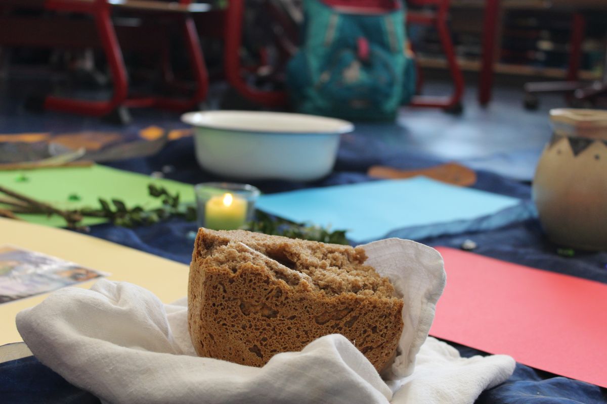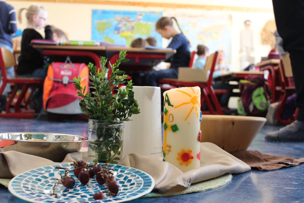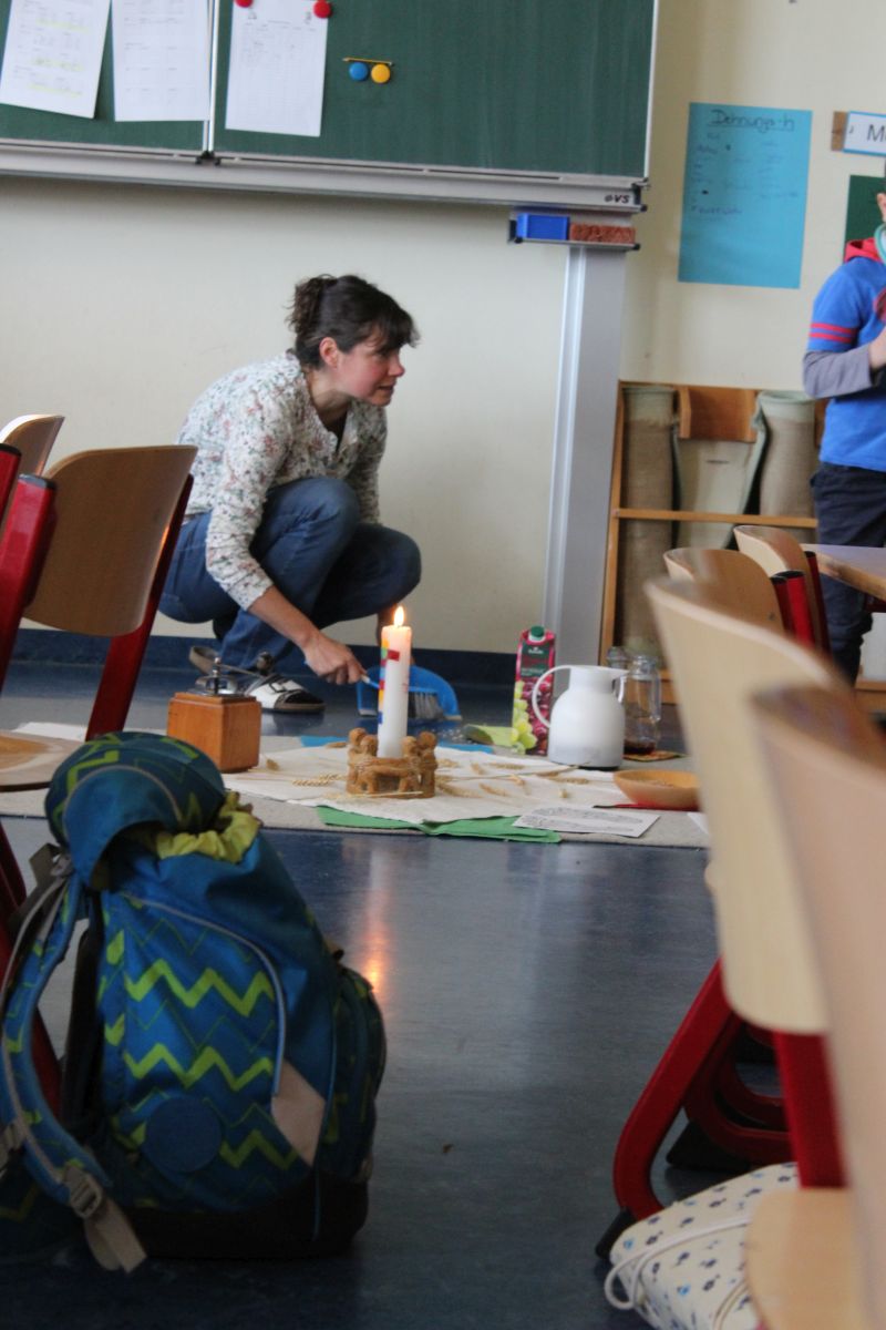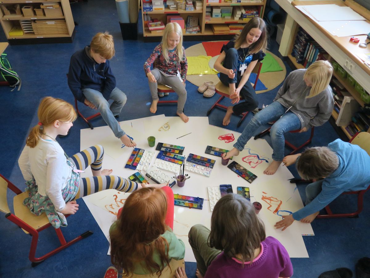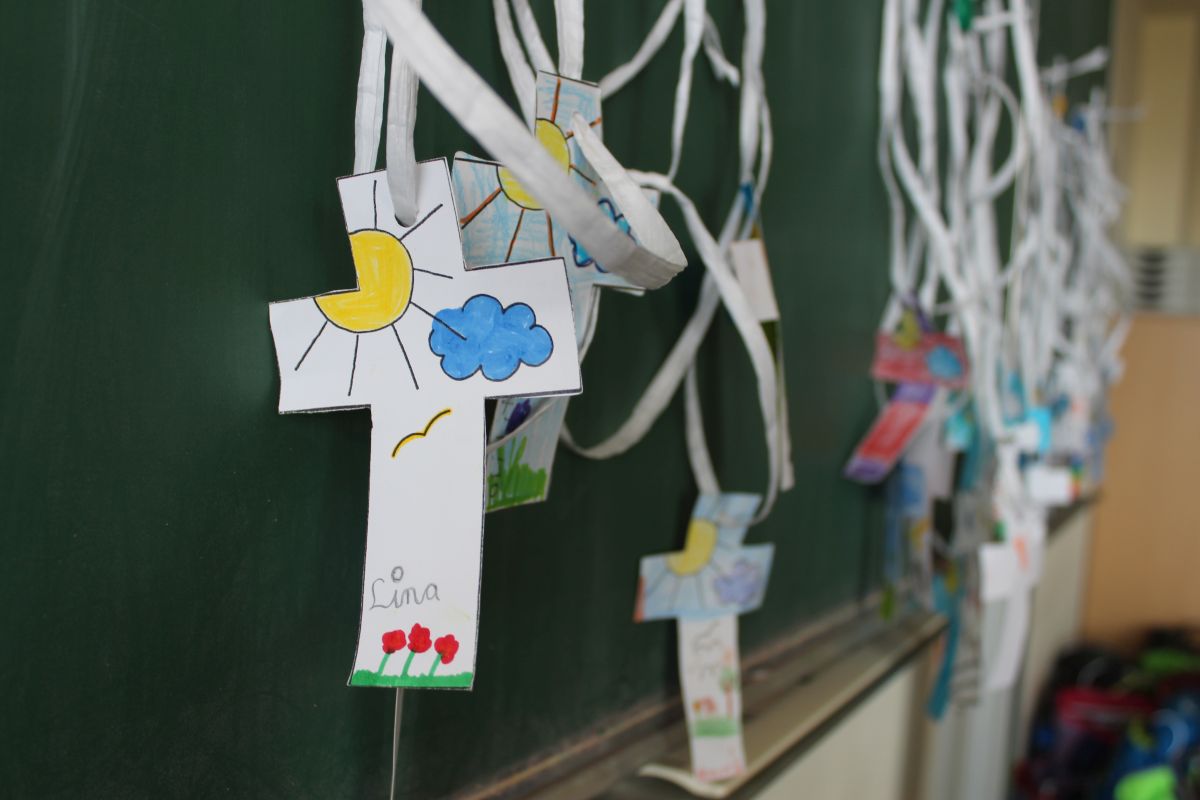Daran orientierten sich auch die Klassen, ausgehend von einem Bodenbild in Kreuzform auf dem immer mehr Füße "wandern".