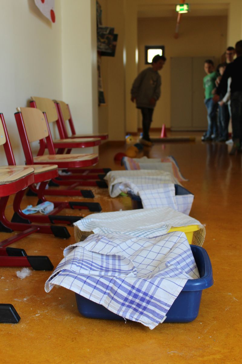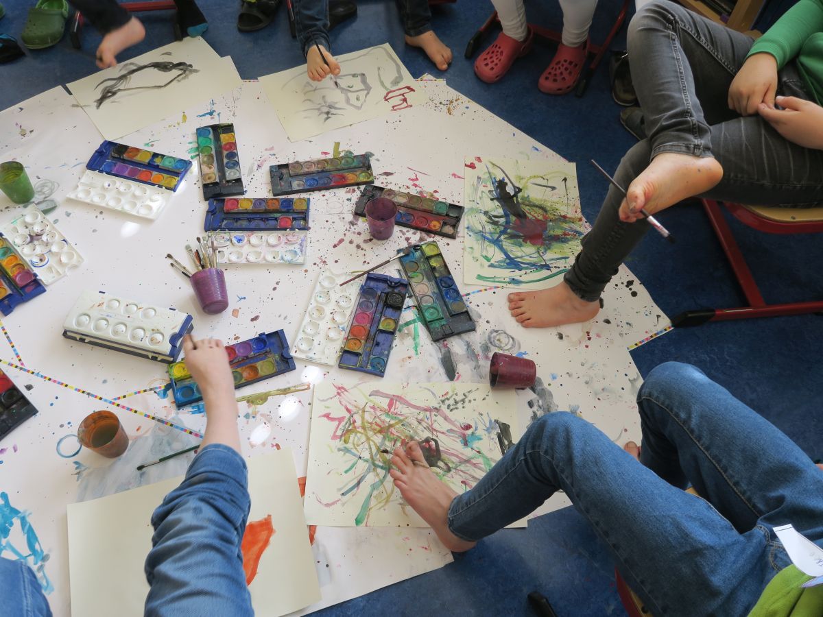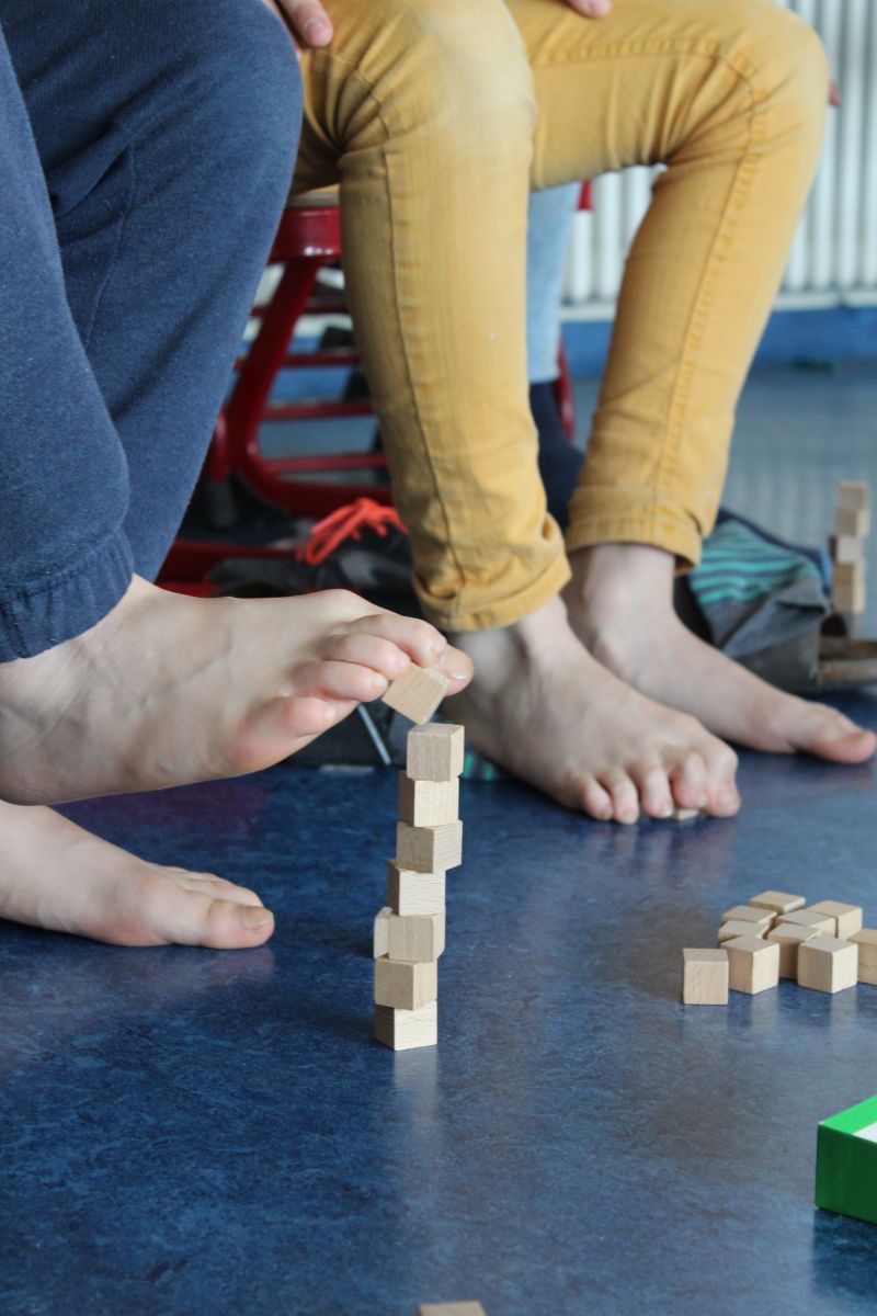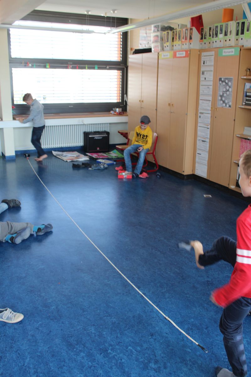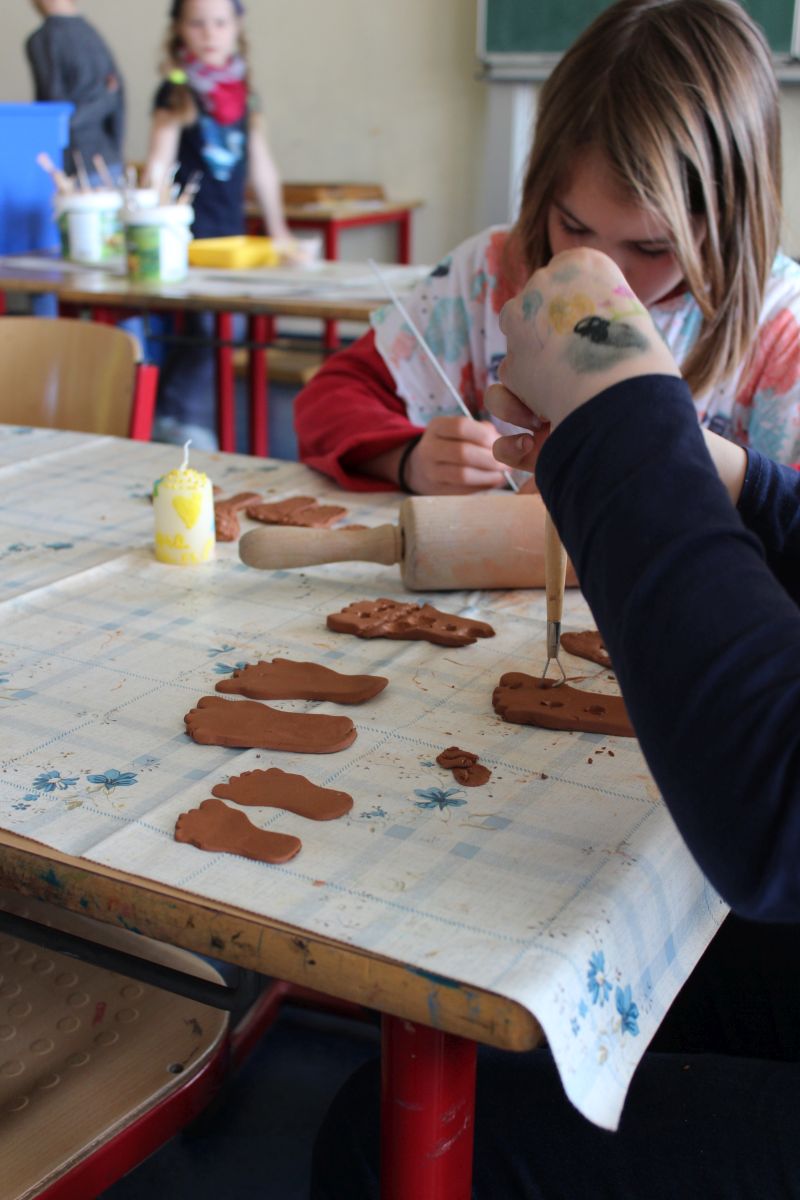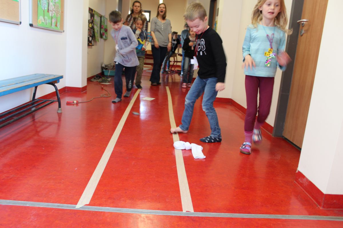 Nach einer geistlichen Zuwendung zum Thema gab es nach der Pause eine Art offenen Stationenbetrieb, bei dem die Kinder von Zimmer zu Zimmer gehen konnten. In jedem wurde zum Thema "Fuß" gearbeitet, gespielt, gebastelt, geschicklicht usw.