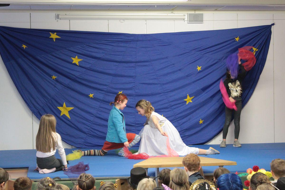 Dann wälzten sich zwei Schlangen durch die Flure, eine Polonaise im gelben Flur, eine im roten Flur. Kinder wurden von ihren Plätzen förmlich hoch- und mitgezogen. Beide Schlangen vereinigt schlängelten sich zur Musik in die Aula und drehten sich noch ein wenig um sich selbst.