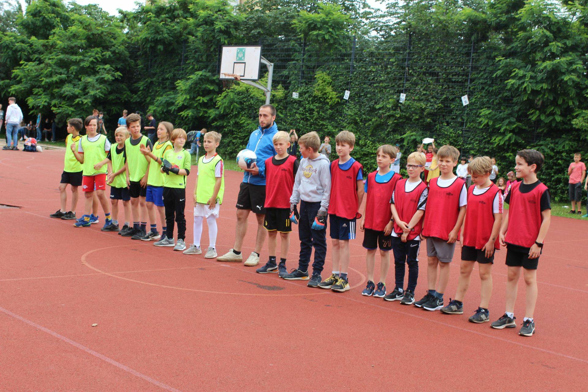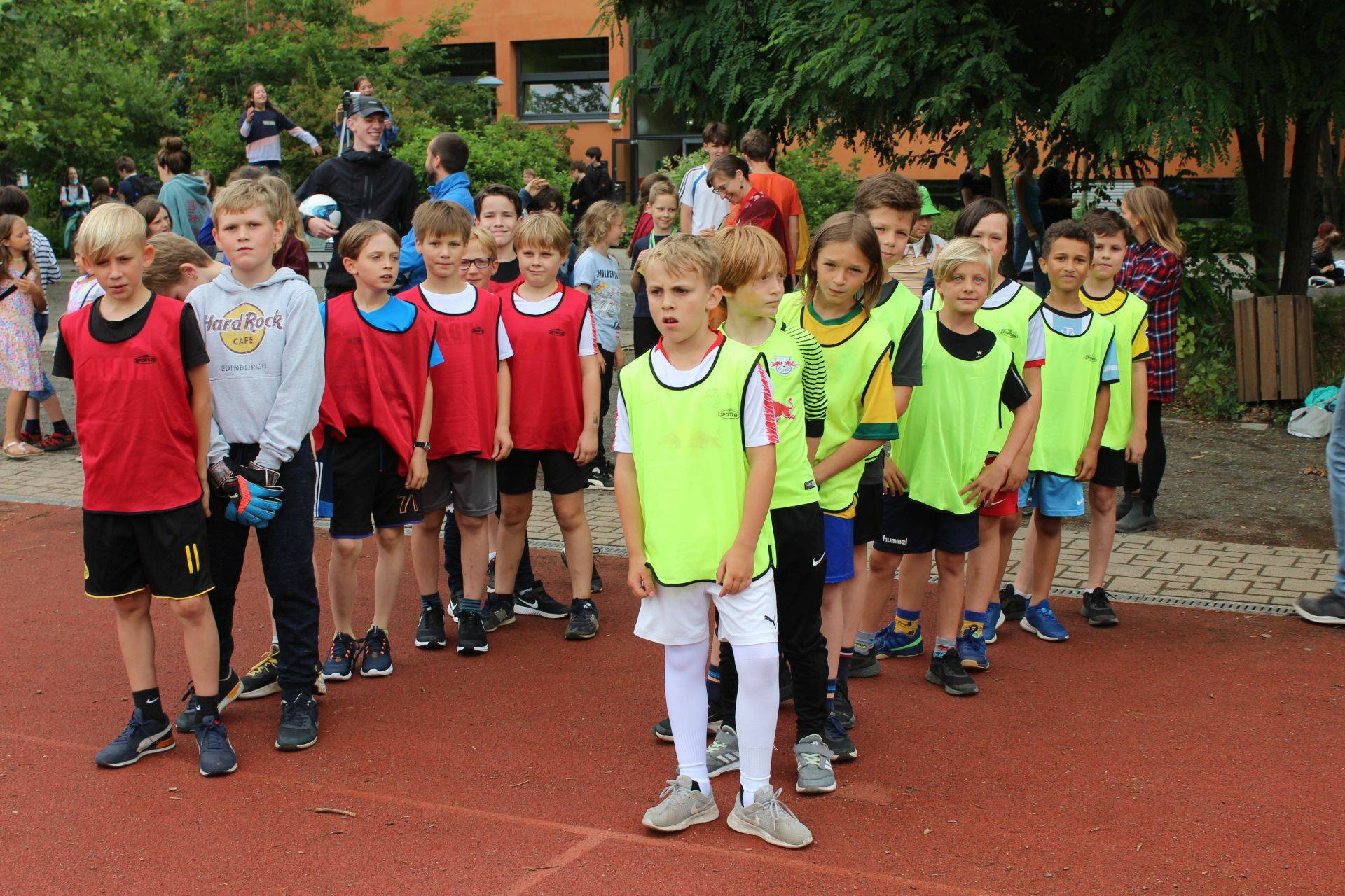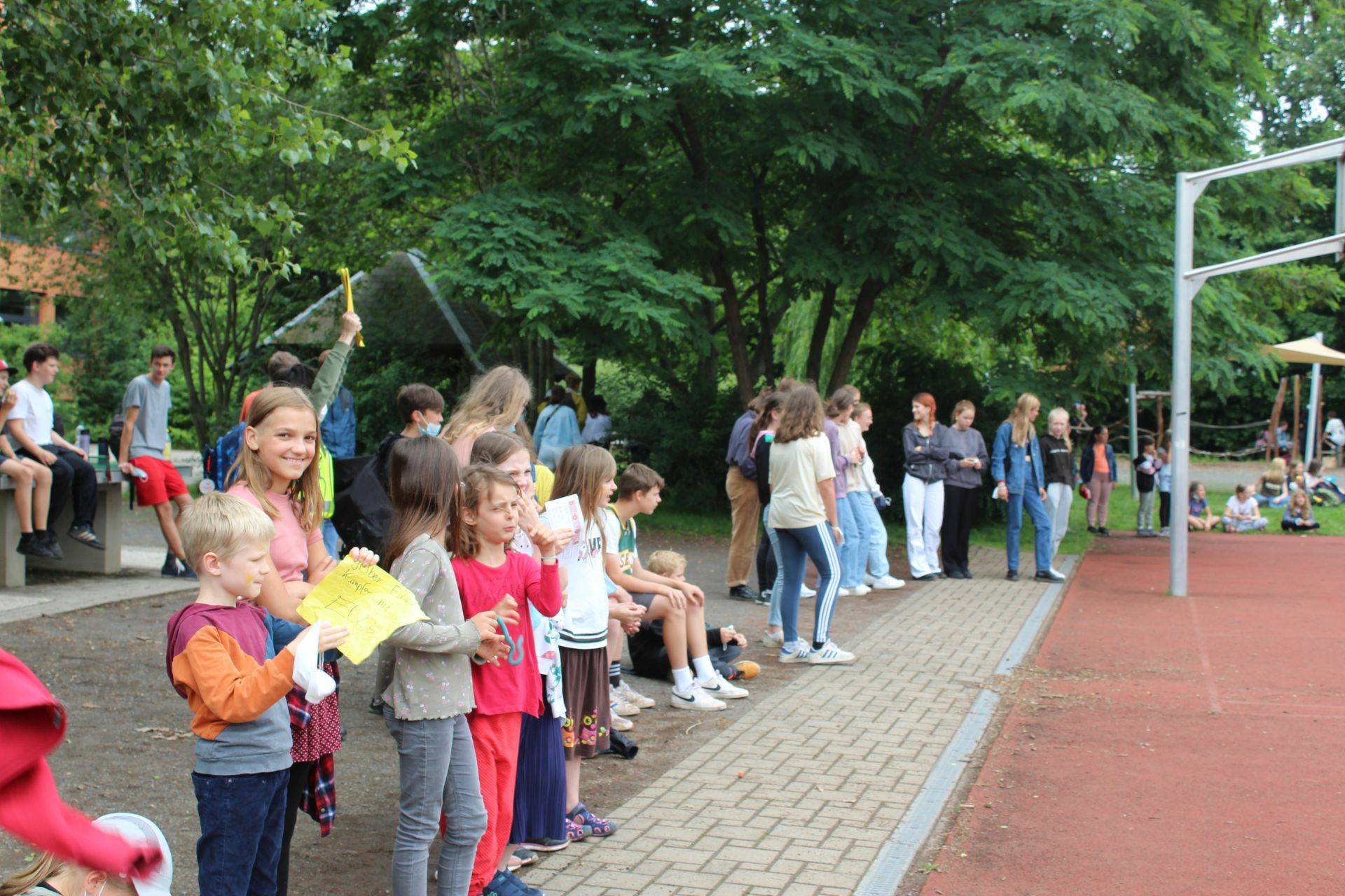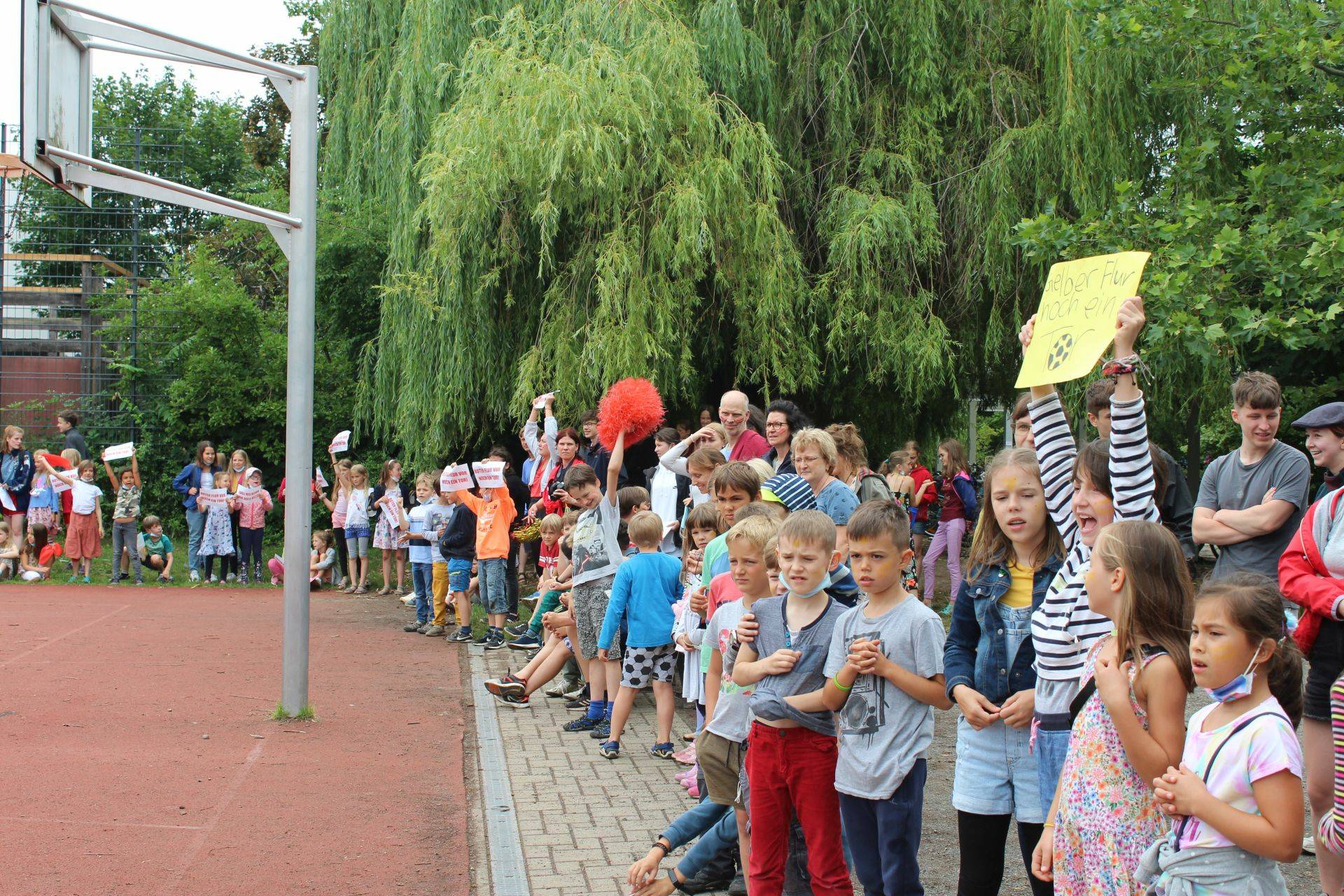 Begleitet wurden sie dabei von allerhand Schlachtenbummler in gelb und rot, vielen neutralen Zuschauern, ehemaligen Schülern der Grundschule und auch vielen Erwachsenen, die sich das Spektakel nicht entgehen lassen wollten. Angeleitet wurden sie von Ingo, dem Schiedsrichter sowie Micha, der das Spiel zusammen mit Frau Kunze-Busch diesmal organisierte.