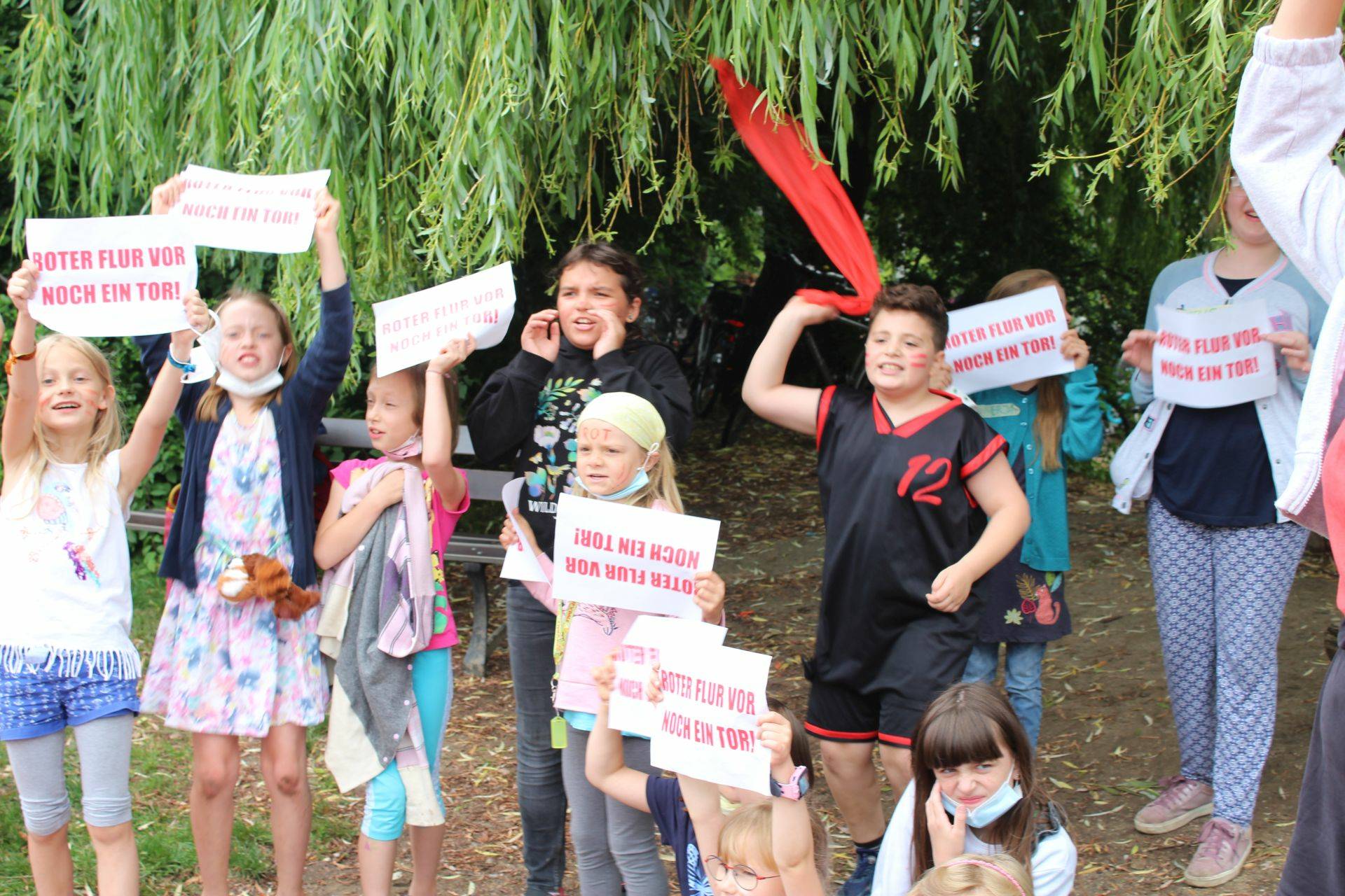 Nach einem Jahr Pause meldete sich gestern der Flurpokal-Wettbewerb wieder und suchte nach einem würdigen Sieger (und würdigen Verlierer). Eine Mannschaft des gelben Flurs (Kätzchen, Delfine, Mäuschen, Regenbogen) und eine Mannschaft des roten Flurs (Schmetterlinge, Tiger, Robben, Pinguine) standen sich 2x15 Minuten gegenüber.