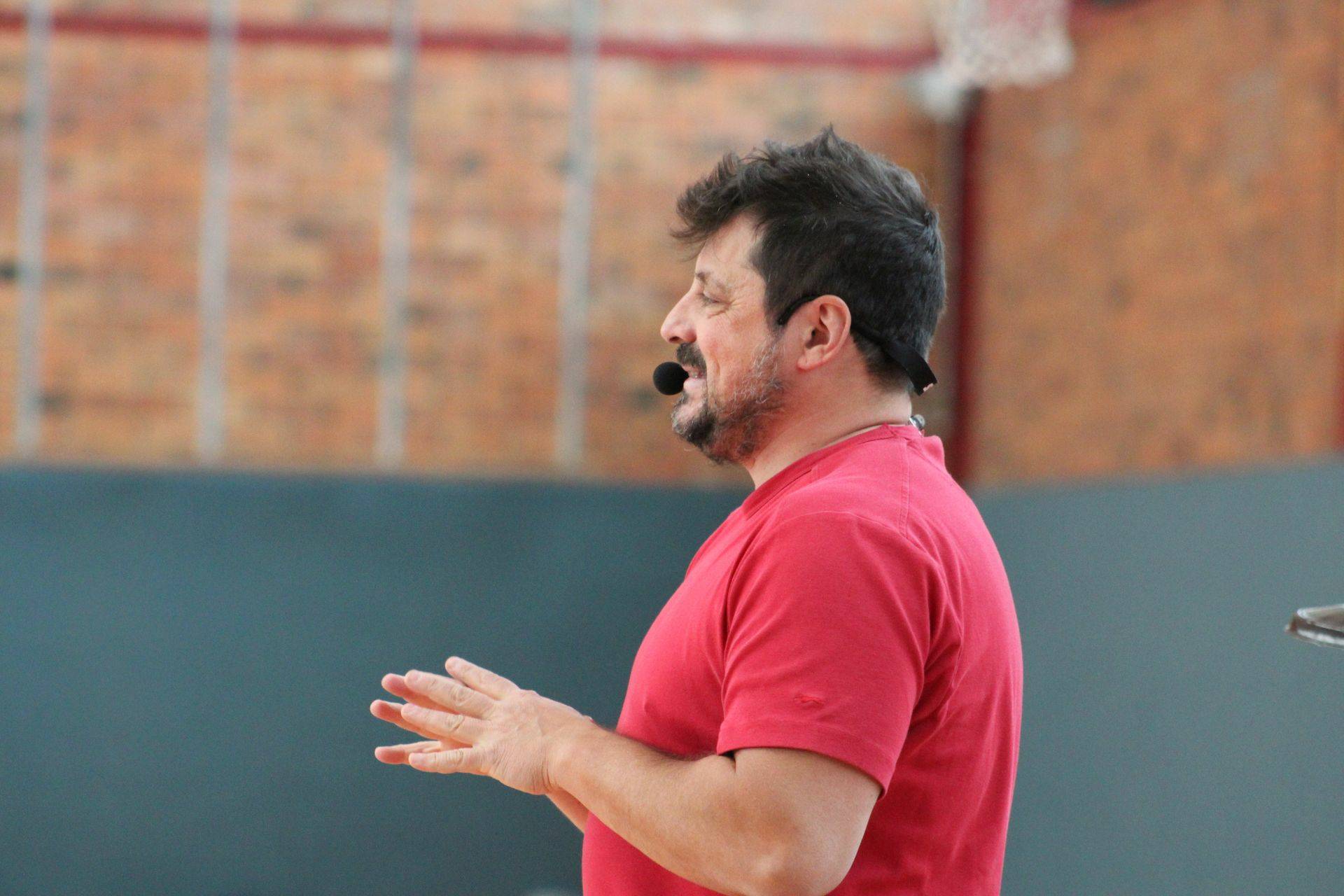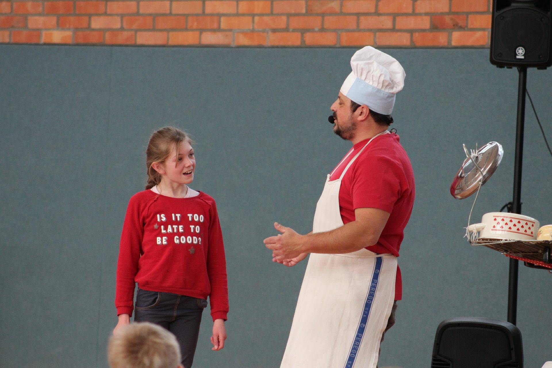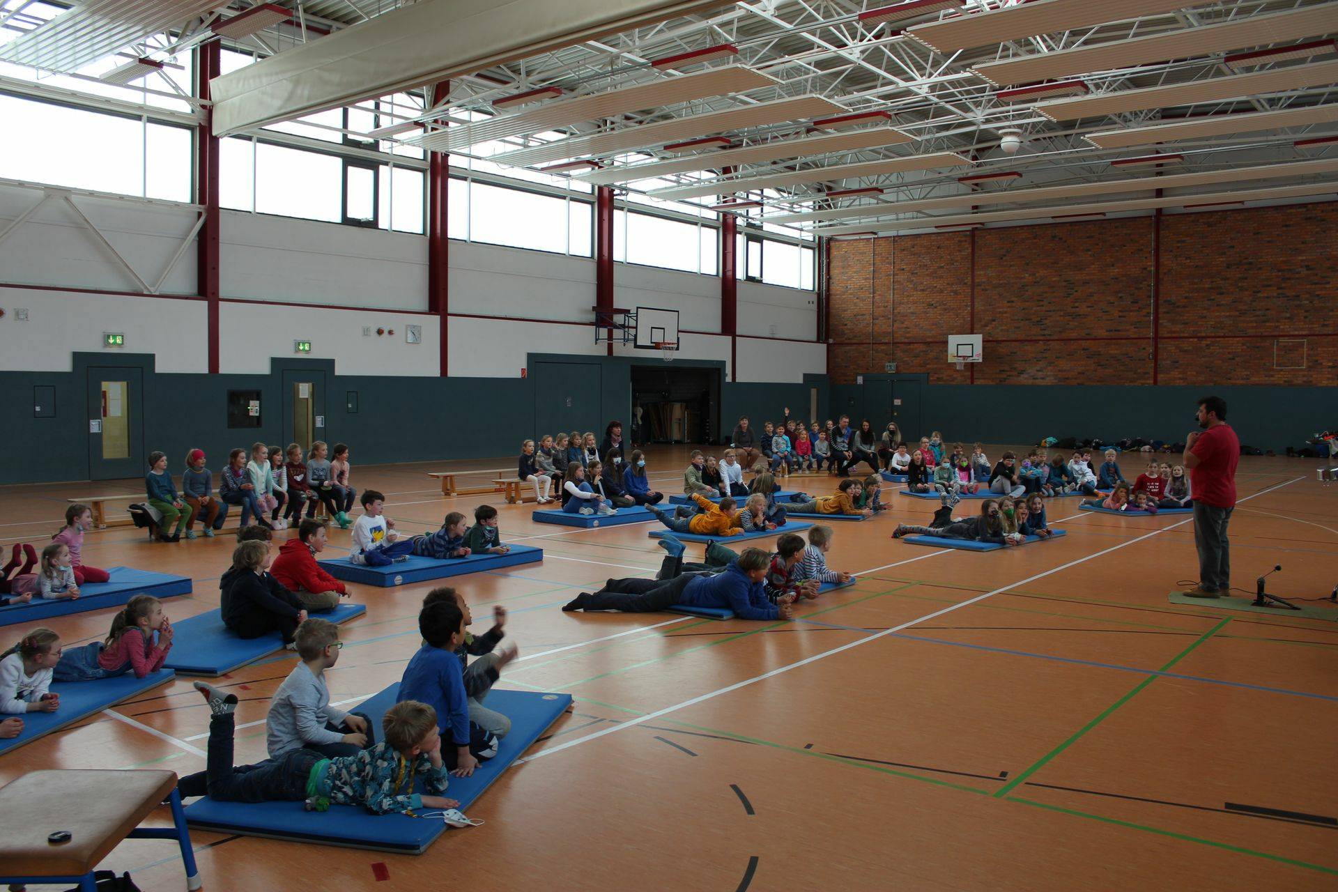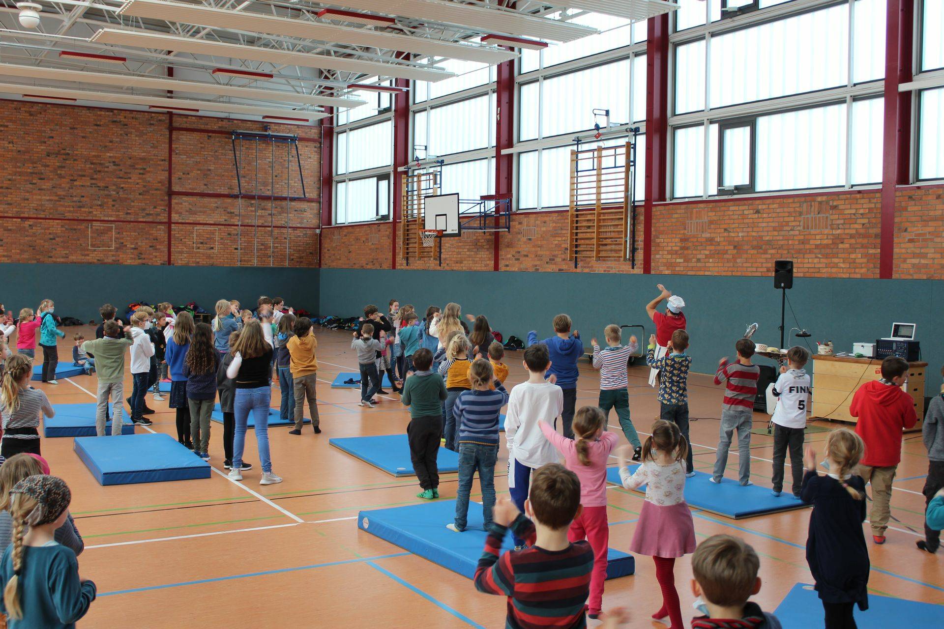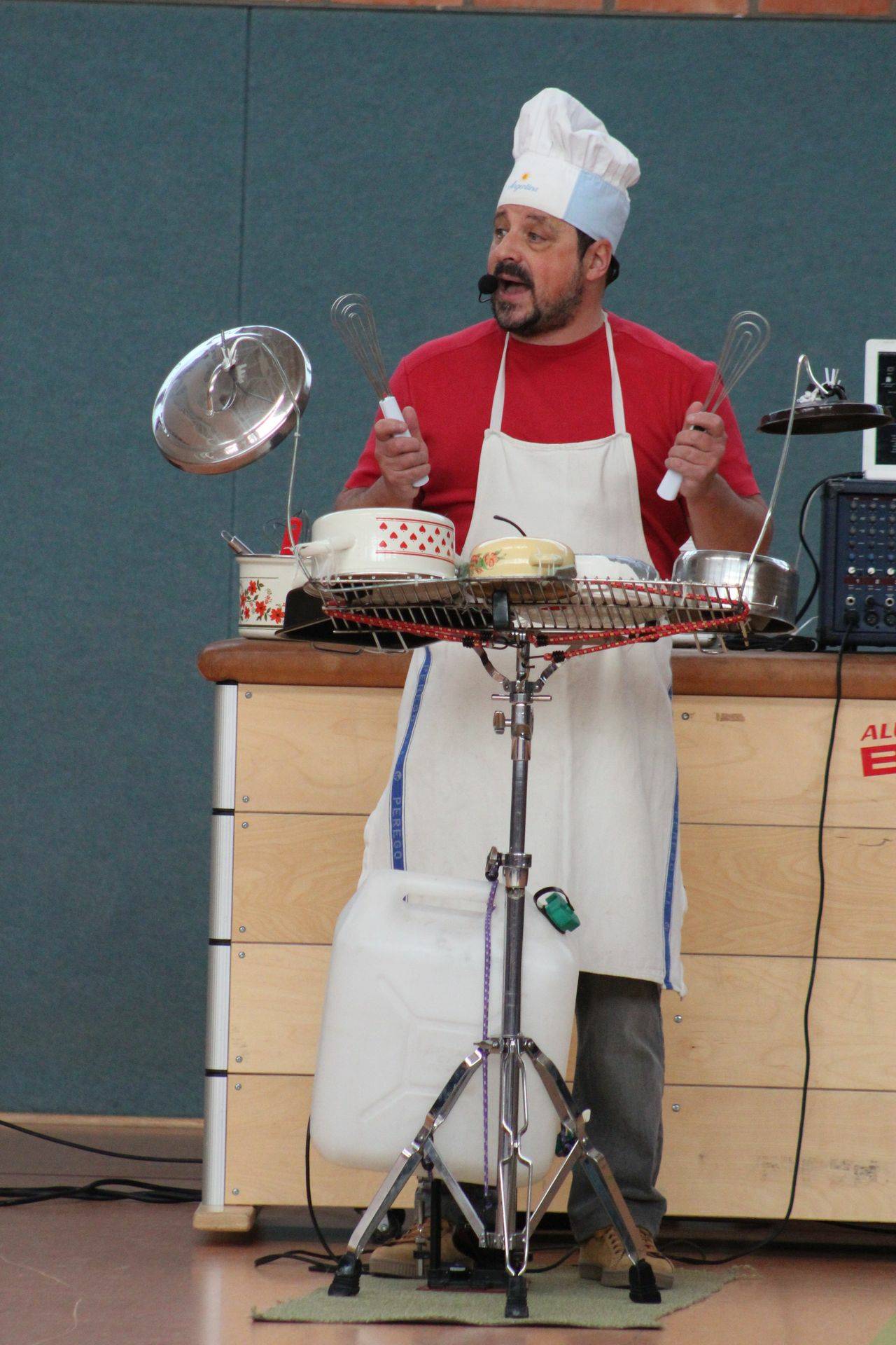 Heute war ein Rhythmus-Koch in der Turnhalle zu Gast. Dieser zauberte auf seinen Töpfen und anderen Gegenständen leckere Rhythmen, zu denen er auch die Grundschüler einlud.