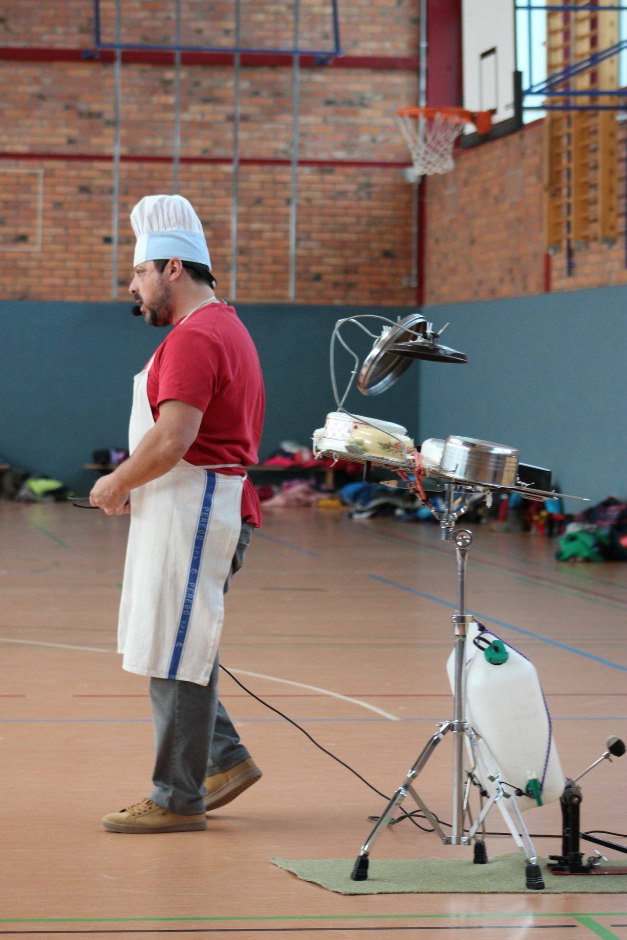 Nachdem sich Javier, der Rhythmus-Koch den Kindern vorgestellt hatte, ging es gleich zur Sache. An einem unorthodoxen Drumset begeisterte er die Kinder mit tollen Rhythmen, später durften die Kinder auch mitklatschen, -sprechen, -stampfen und -tanzen. Ein "Koch"-Erlebnis für den ganzen Körper.