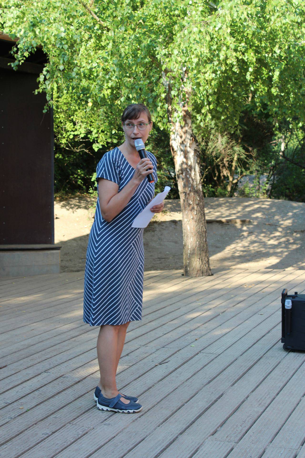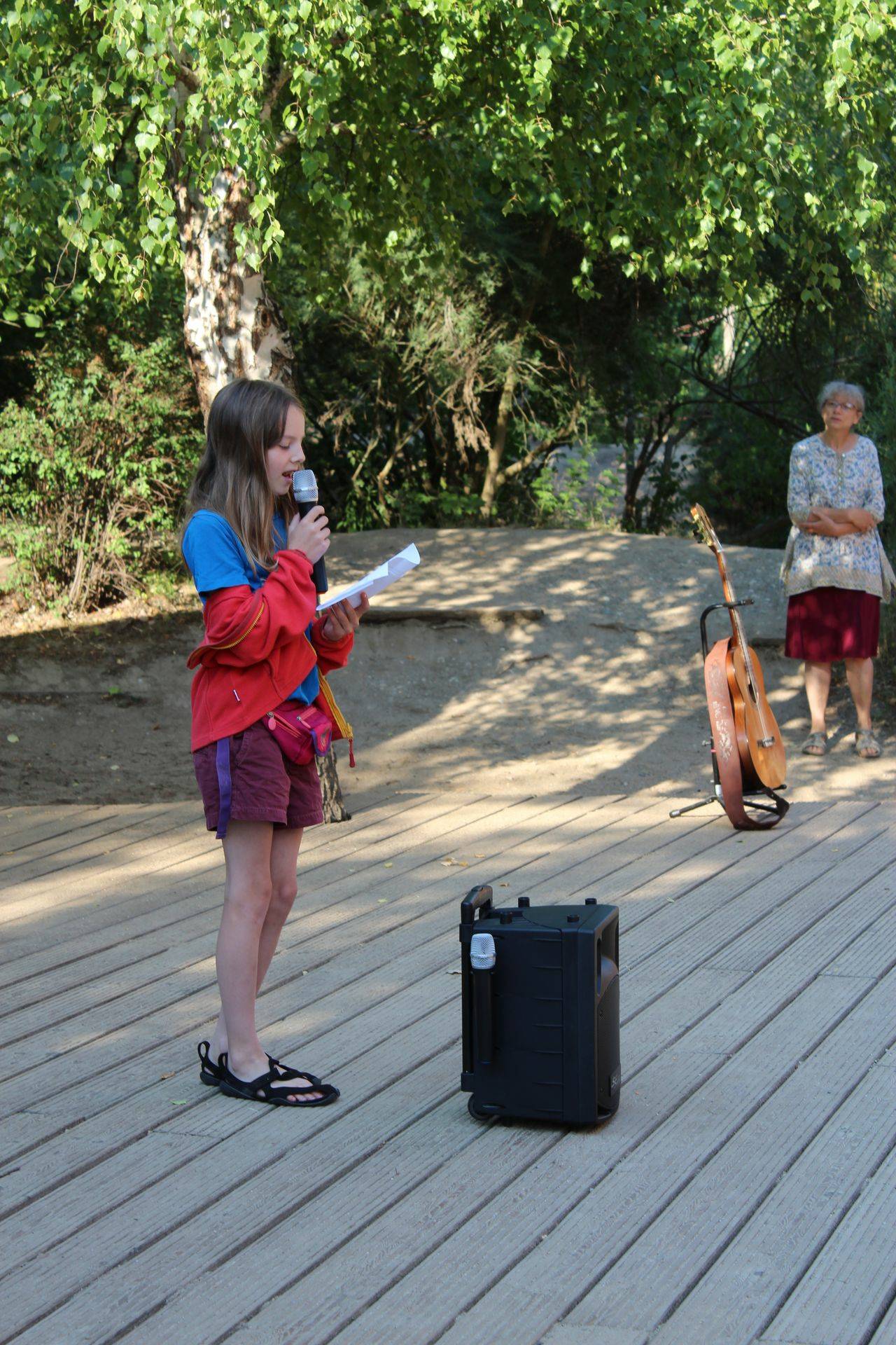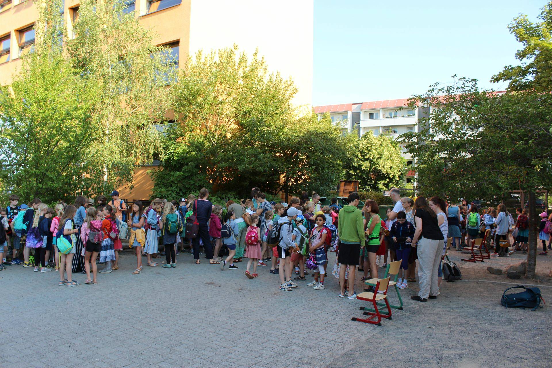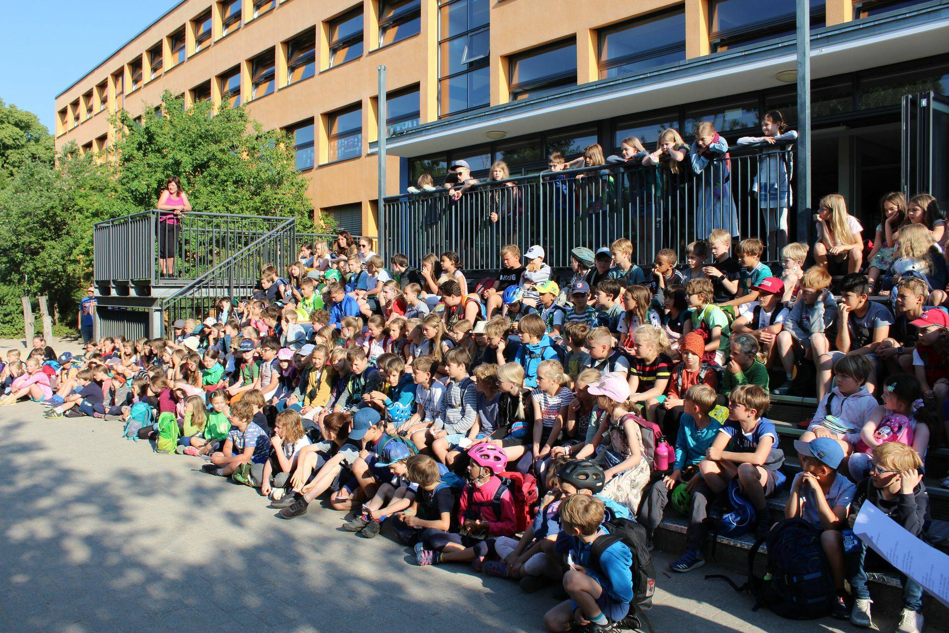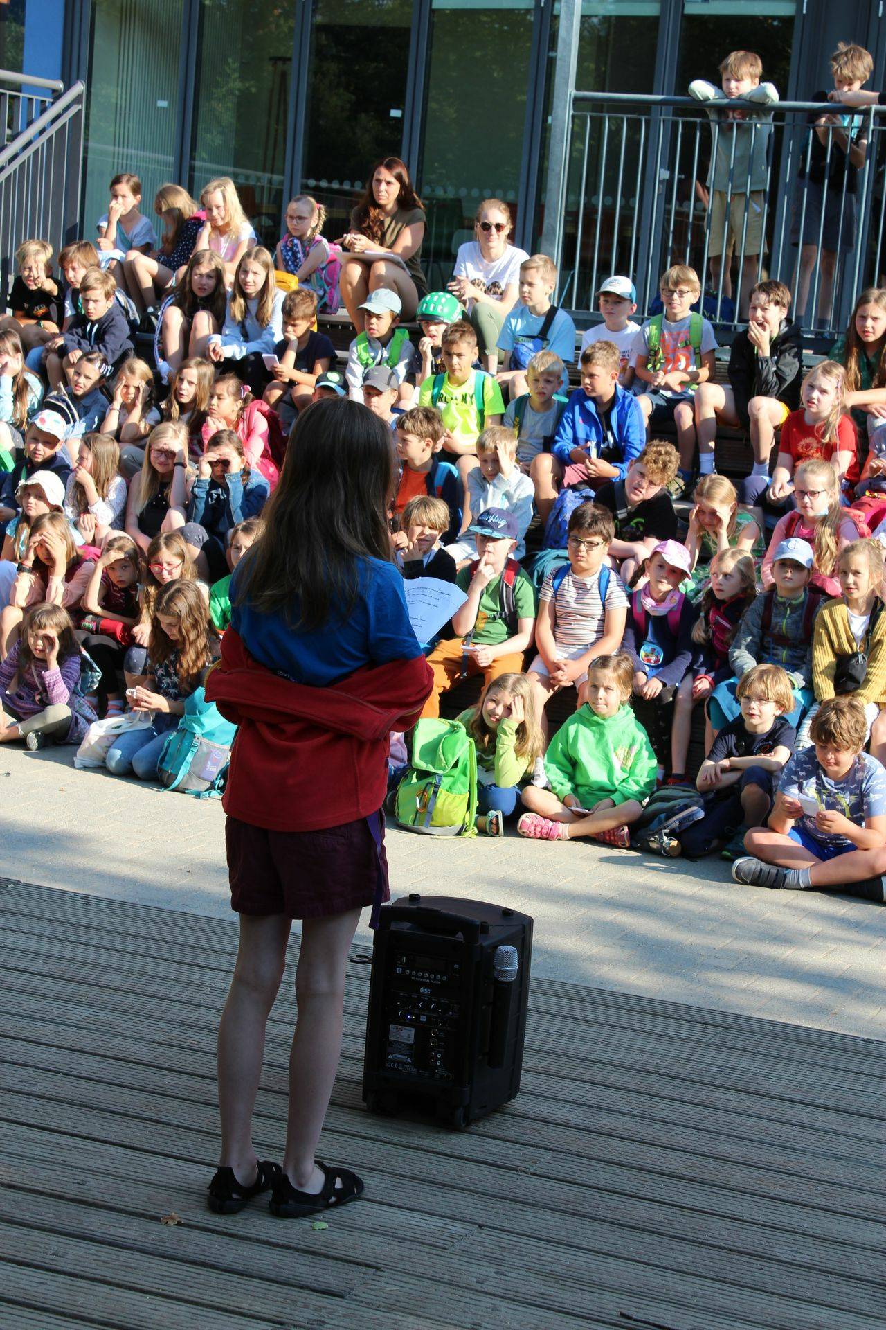 Ankunf auf dem Schulhof, Sammeln an der Treppe. Dann eine Ansprache und feierliche Eröffnung durch die Bürgermeisterin.