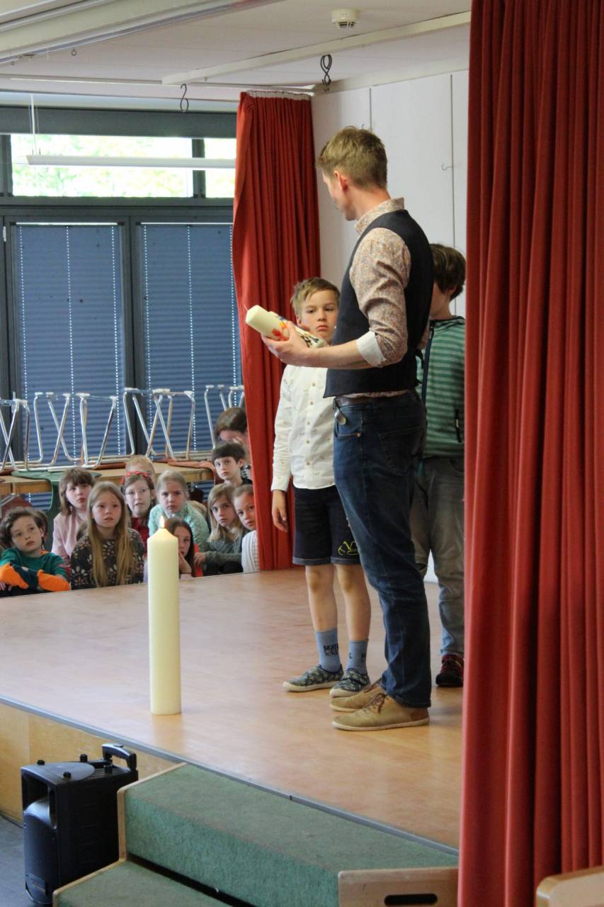 Jesus lebt! Rief Schulseelsorger Herr Kindermann immer wieder den Schülerinnen und Schülern zu. Diese antworteten mit "Halleluja!", auch während der gesamten Andacht - Aufmerksamkeit war also gefragt. Aus dem Dunkel ins Licht, zur Freude am Leben, zu neuem Leben! Dies symbolisierte in der von den Delfinen vorbereiteten Andacht die neue, riesige Osterkerze. Diese ersetzt die alte, heruntergebrannte, die nach 30 (!) Jahren nun abgelöst wird. Die neue Kerze "wandert" bald durch die Klassen und darf dort mit etwas Typischem verziert und gestaltet werden. Ebenso wurden zwei neue Kerzen für den Religionsunterricht an Frau Kunze-Busch übergeben. Die Delfine haben die Gestaltung der Kerzen übernommen.