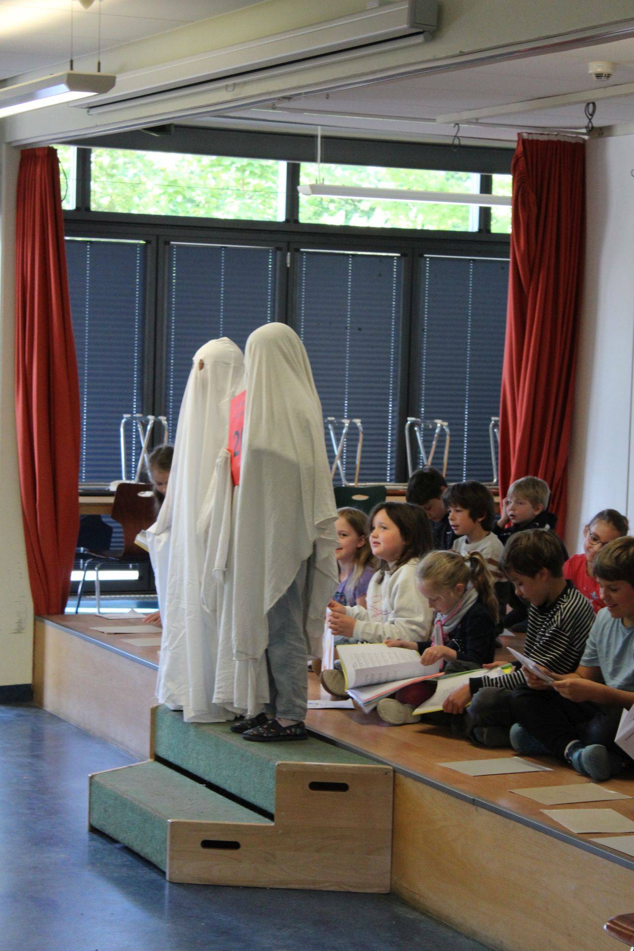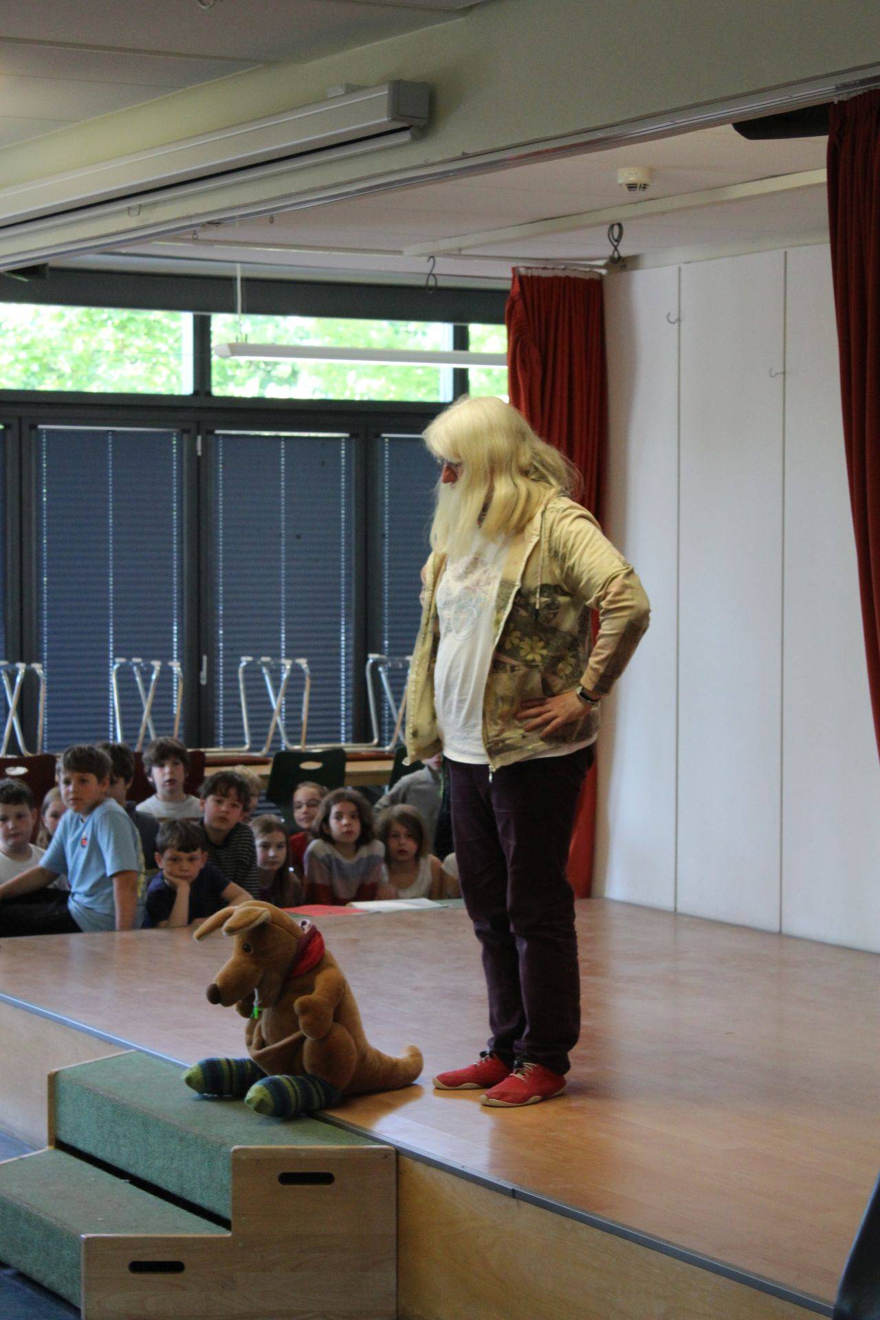 Doch zuerst unterhielten die Pinguine prächtig und gestalteten die ausgesuchten Lieder mit Bildern (Eisgekühlte Coca-Cola), Kostümen (Im alten Schloss ist Geisterstund) und Requisiten (Halt das Känguru fest). Danach überbnahm Frau Büttner - die Känguru-Wettbewerb-Sachverständige und -Verantwortliche. Mehrere Kinder wurden auf die Bühne geholt und mit Preisen geehrt, ein Junge hatte den größtmöglichen Känguru-Sprung gemacht und tatsächlich alle Aufgaben richtig gelöst!