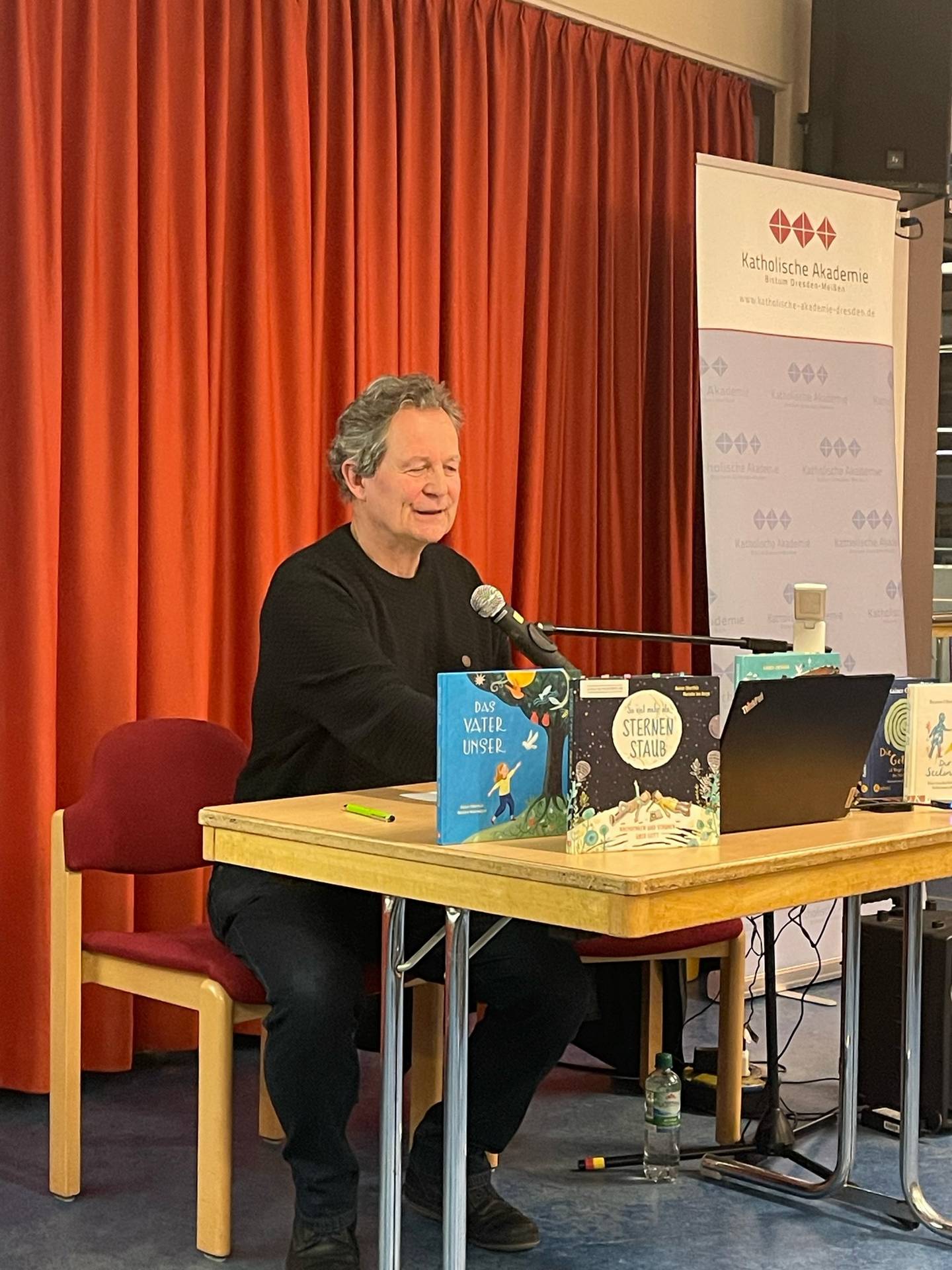 Rund 45 Teilnehmende, darunter viele Lehrkräfte des Bischöflichen Montessori-Schulzentrums Leipzig, erlebten am 26. Februar 2026 einen intensiven Abend mit dem Religionspädagogen und Autor Rainer Oberthür. In Lesung und Musik stellte er Bücher und Beispiele aus seinem Unterricht vor – mit Kinderfragen wie: Was ist die Seele? Wer ist Gott? Was glaubst du?