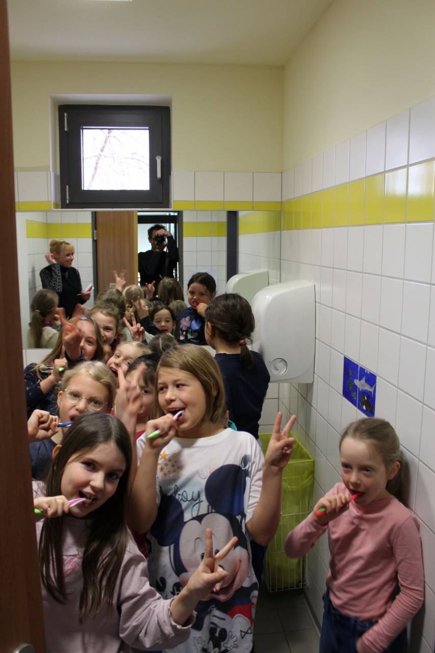 Dazu gab es anschauliches Material, ein kleines Heft mit Zahngebissgrafiken und anderen Bildern und natürlich für das große Finale: eine frische bunte Zahnbürste für jeden und dazu ein bisschen Zahnpasta, damit alle Kinder gemeinsam unter Anleitung am Waschbecken die Zähne putzen konnten. Danach gab es noch für die Kinder, deren Eltern einverstanden waren, einen Putzgang mit Fluorid zum besseren Zahnschutz.