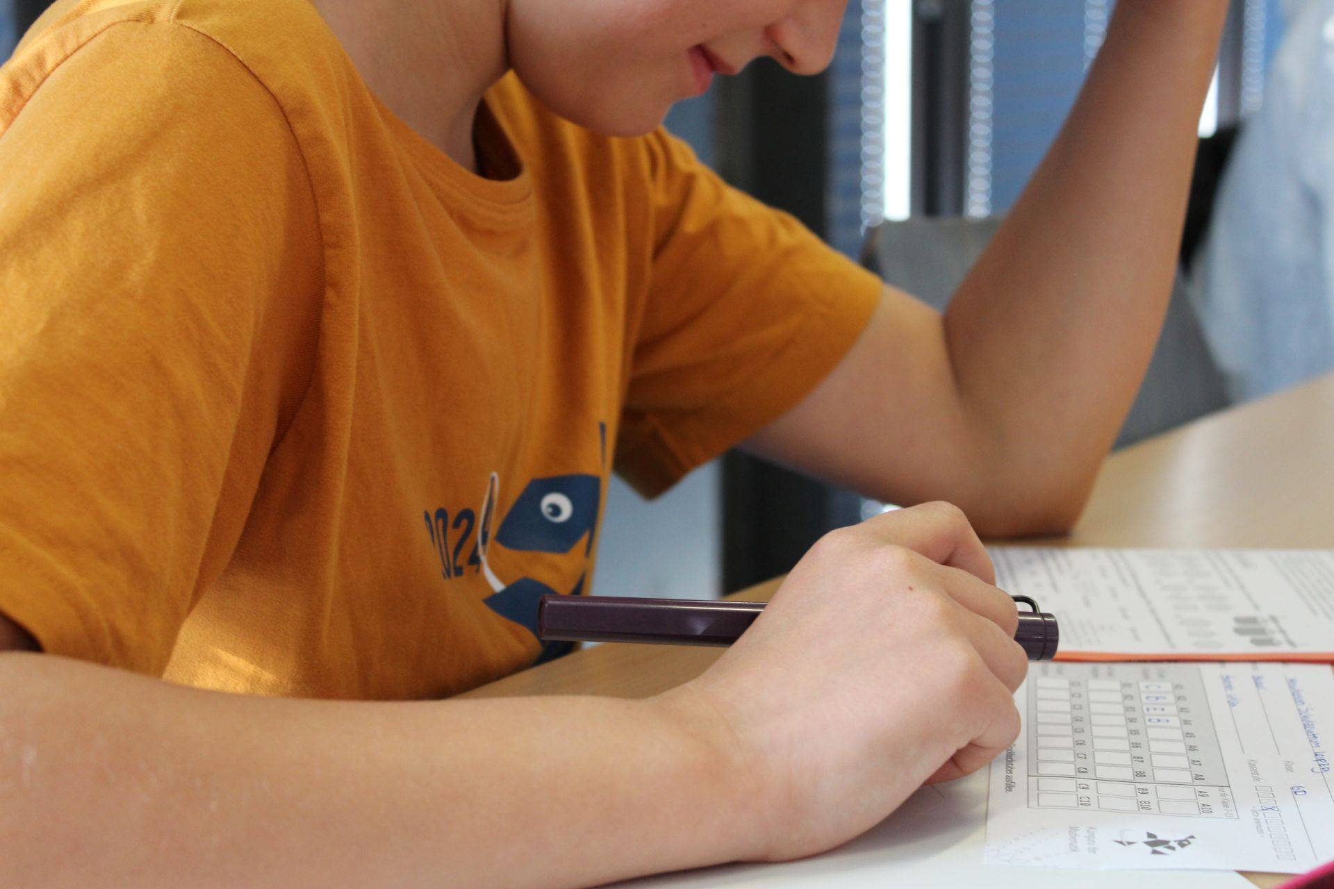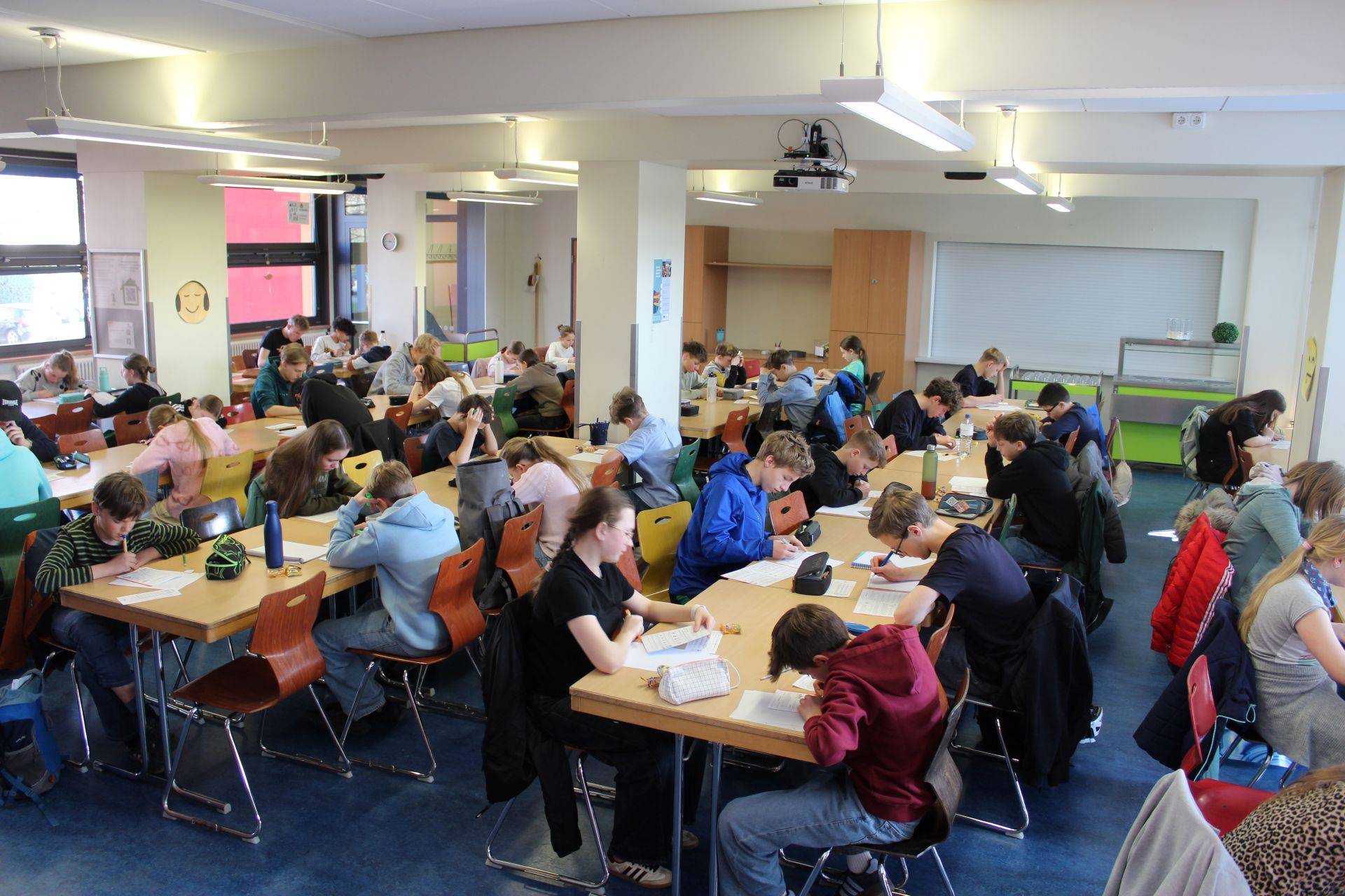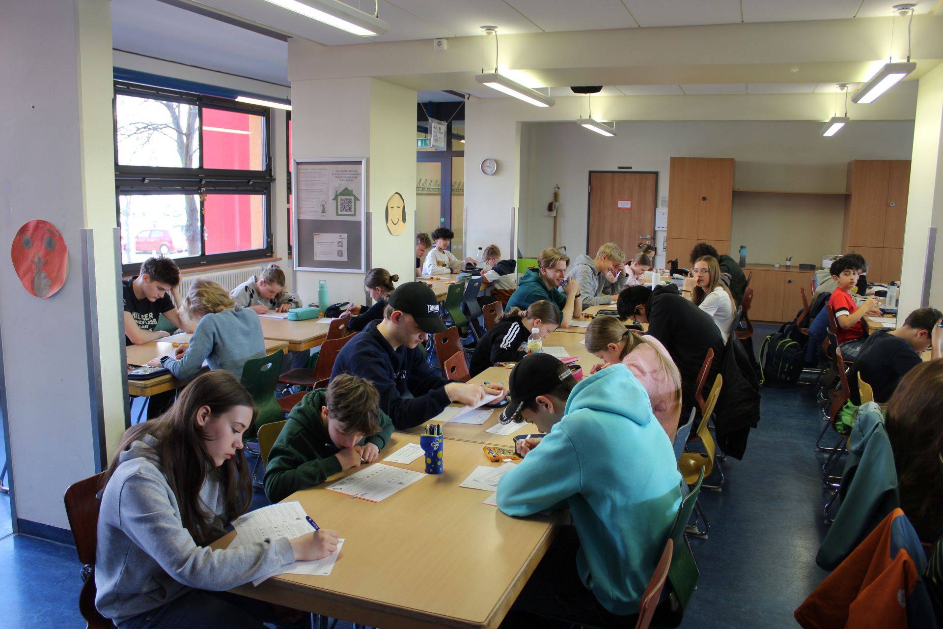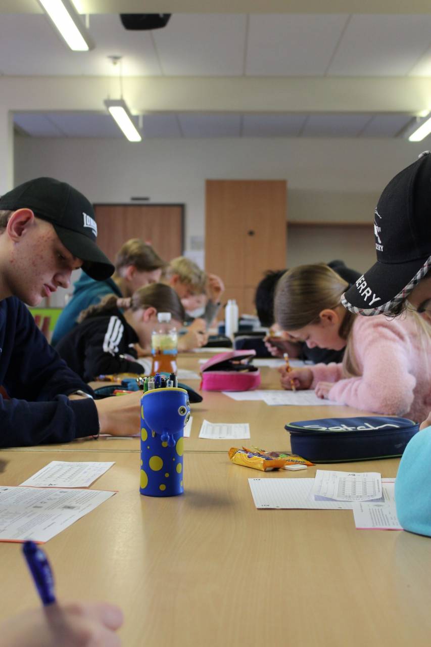 Wie jedes Jahr fand der Känguru-Wettbewerb am Donnerstagmorgen in der 2. und 3. Stunde, also während des Unterrichts, in der Schulmensa statt. Nachdem wir angekommen waren, sollten wir uns zuerst anmelden. Danach bekamen wir den Zettel, welche wir wenn wir fertig sind abgeben müssen. Anschließend durften wir uns etwas Süßes nehmen und uns einen Platz, der min. 2 Plätze von Schüler*innen unserer Altersklasse entfernt sein musste, suchen. Als endlich alle da waren, wurden nochmal die Regeln erklärt. Dann wurden die Aufgabenzettel verteilt und es ging endlich los. Wie immer gab es leichte, mittlere und schwere Aufgaben. Alle Teilnehmenden haben bis zum Ende der Zeit (75 min) fleißig geknobelt und ihr Bestes gegeben. Wir freuen uns schon, das Ergebnis zu erfahren.