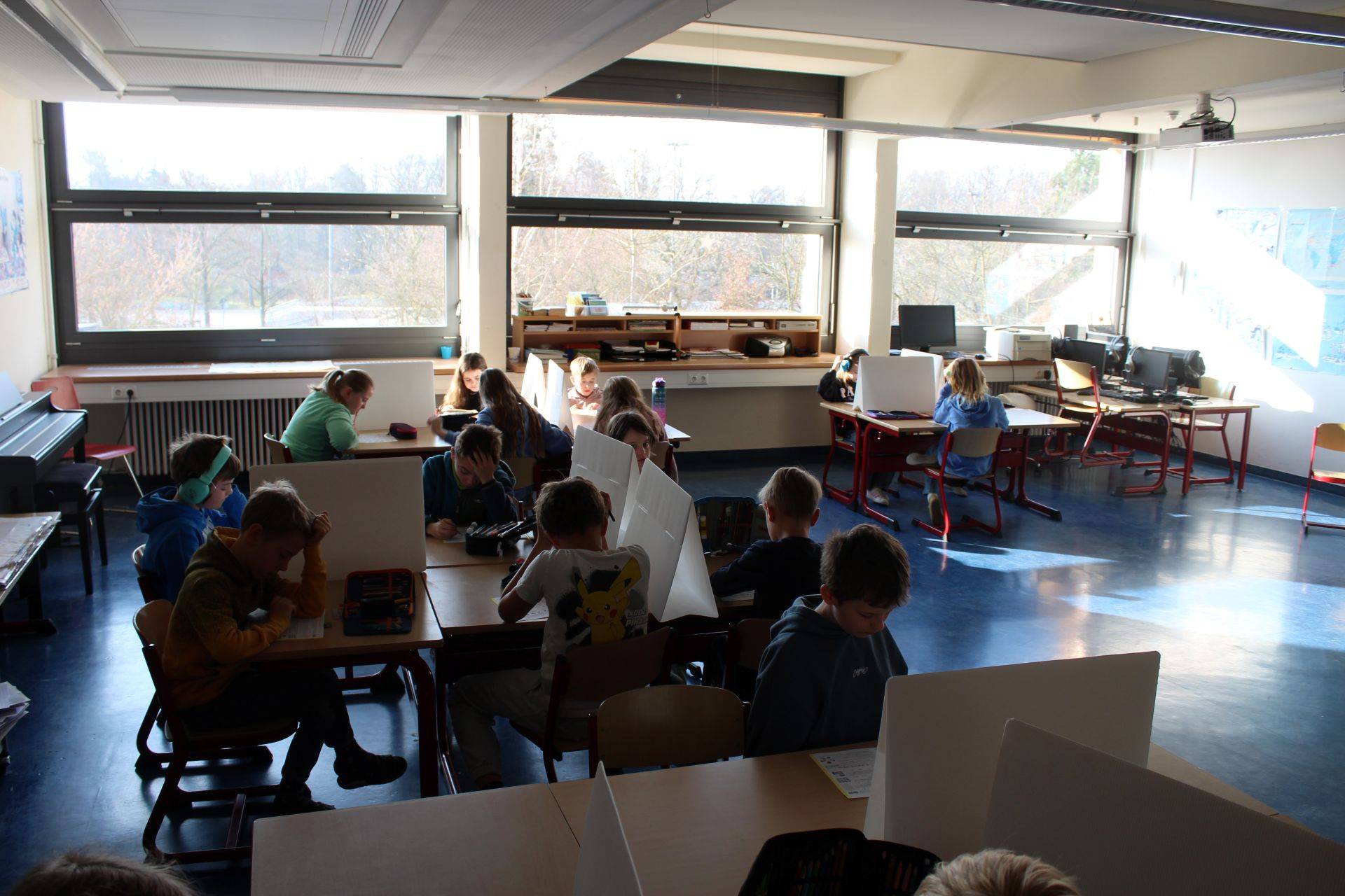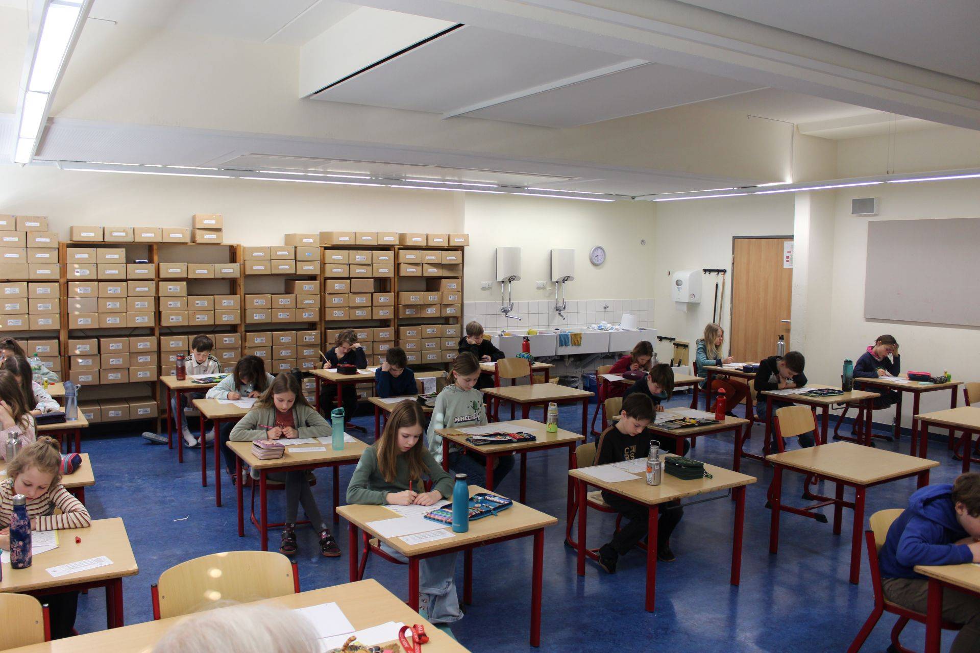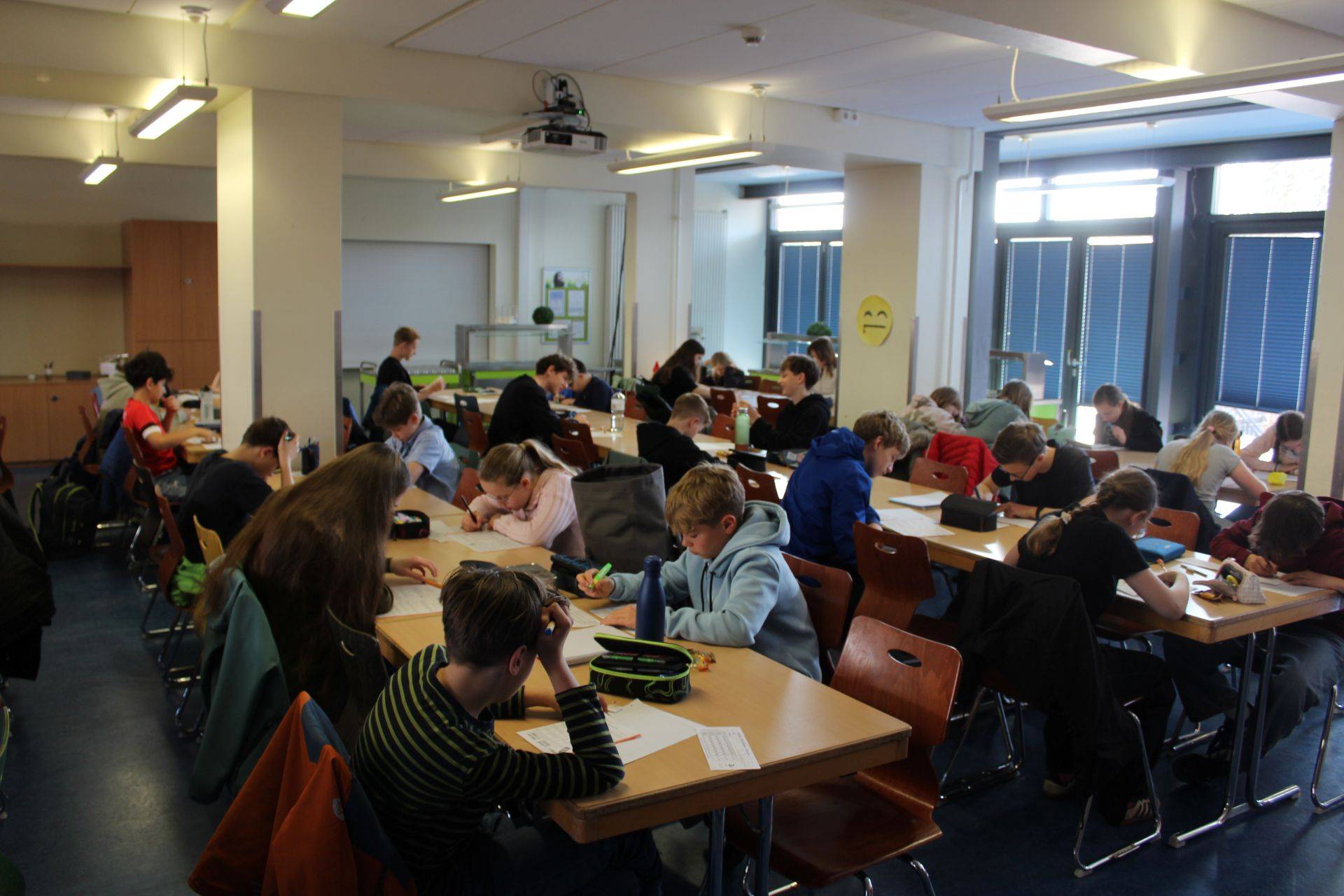 Wie jedes Jahr fand der Känguru-Wettbewerb am Donnerstagmorgen in der 2. und 3. Stunde, also während des Unterrichts, in der Schulmensa statt. Nachdem wir angekommen waren, sollten wir uns zuerst anmelden. Danach bekamen wir den Zettel, welche wir wenn wir fertig sind abgeben müssen. Anschließend durften wir uns etwas Süßes nehmen und uns einen Platz, der min. 2 Plätze von Schüler*innen unserer Altersklasse entfernt sein musste, suchen. Als endlich alle da waren, wurden nochmal die Regeln erklärt. Dann wurden die Aufgabenzettel verteilt und es ging endlich los. Wie immer gab es leichte, mittlere und schwere Aufgaben. Alle Teilnehmenden haben bis zum Ende der Zeit (75 min) fleißig geknobelt und ihr Bestes gegeben. Wir freuen uns schon, das Ergebnis zu erfahren.