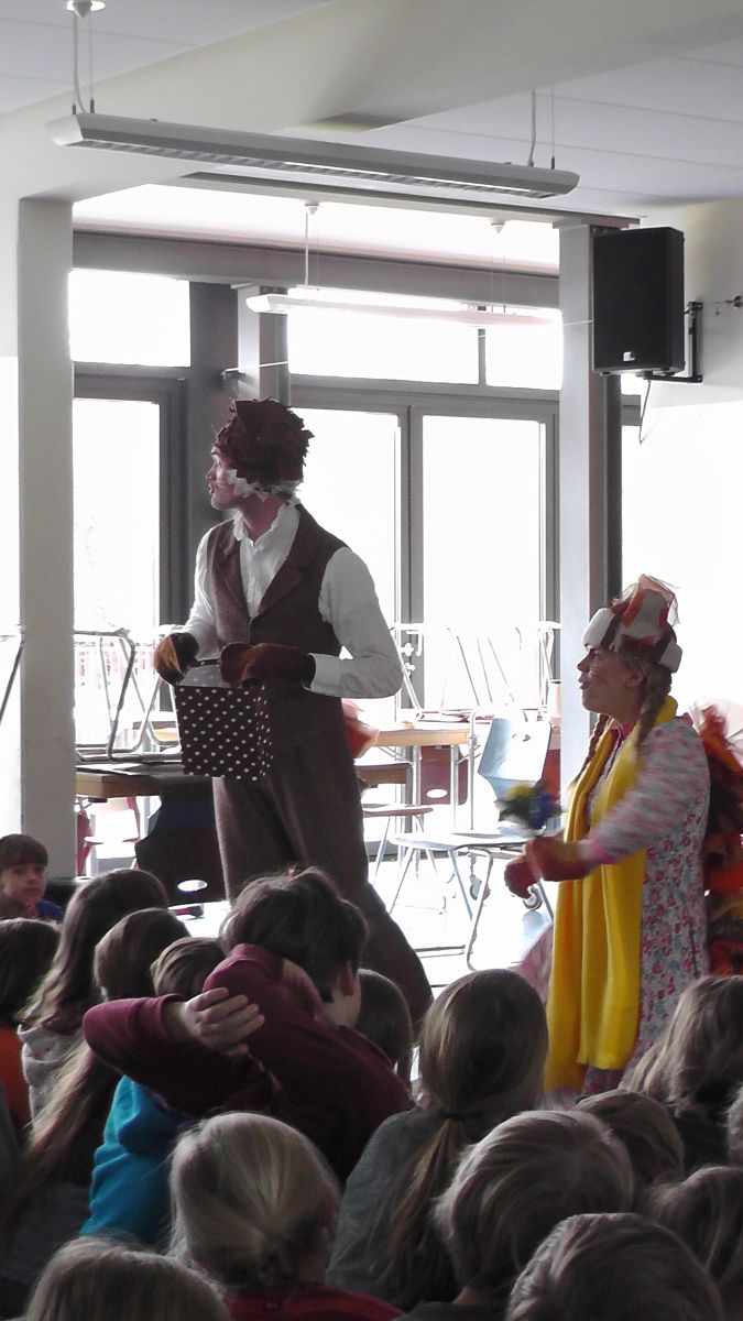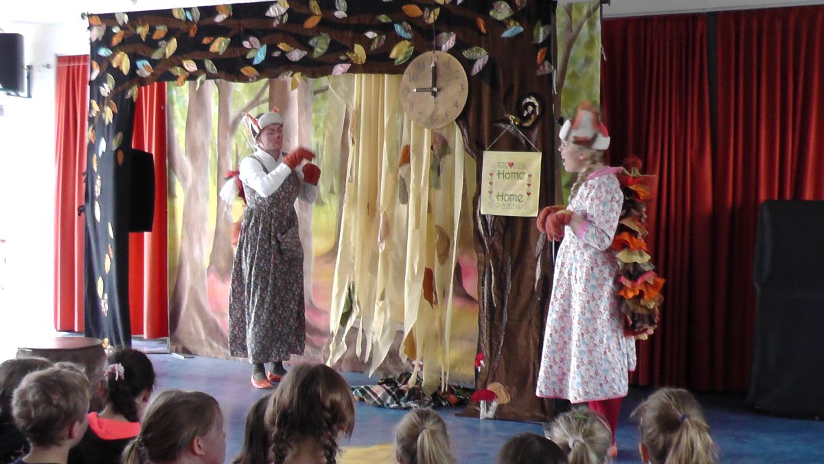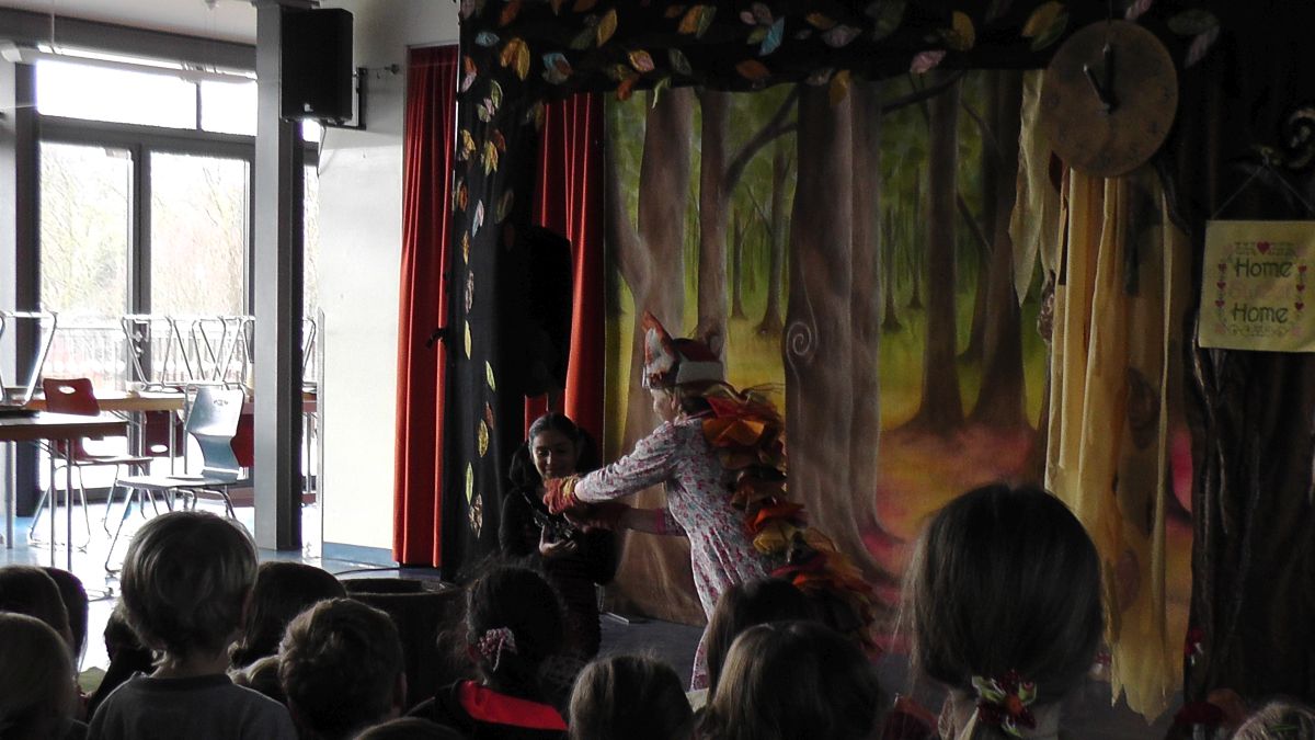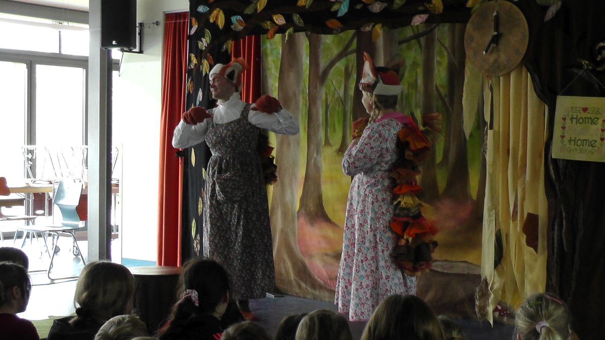 Das "White Horse Theatre" gastierte mit zwei Schauspielern und einem prächtigen Bühnenbild in unserer Schule und zeigt den versammelten 3. und 4. Klässlern das Stück "The Tale of Susie Squirrel".