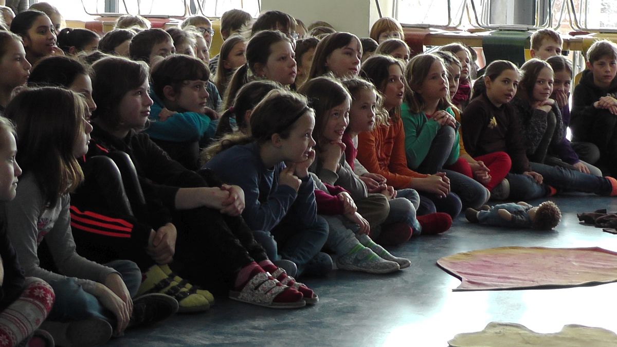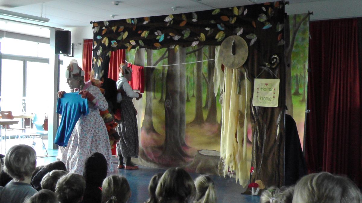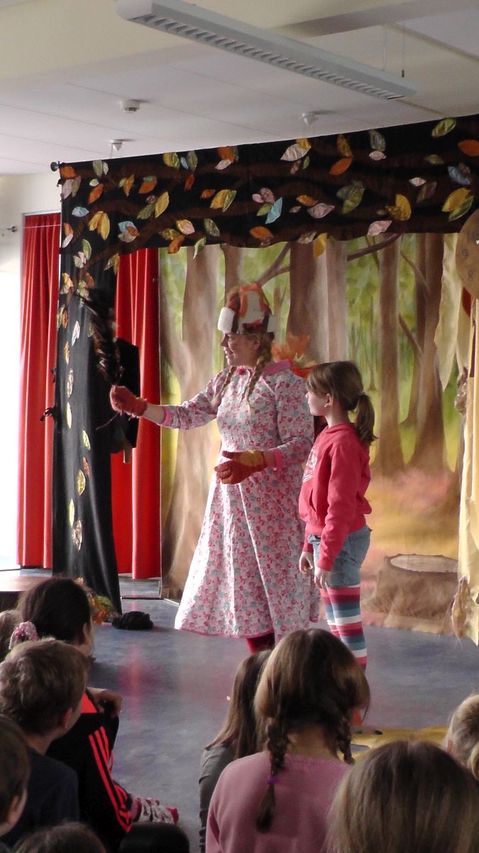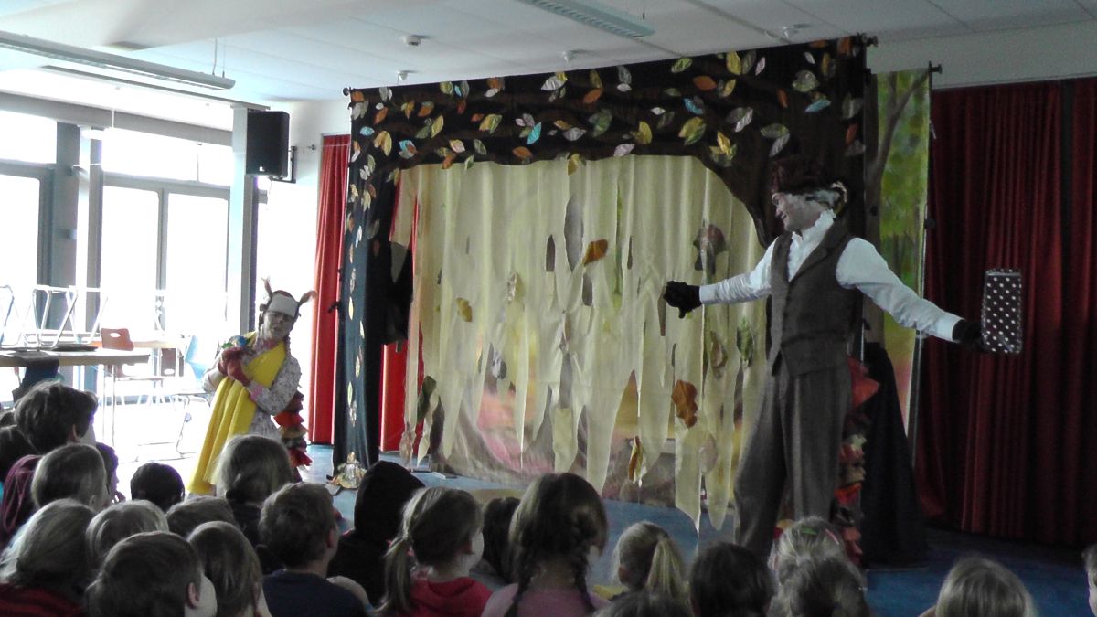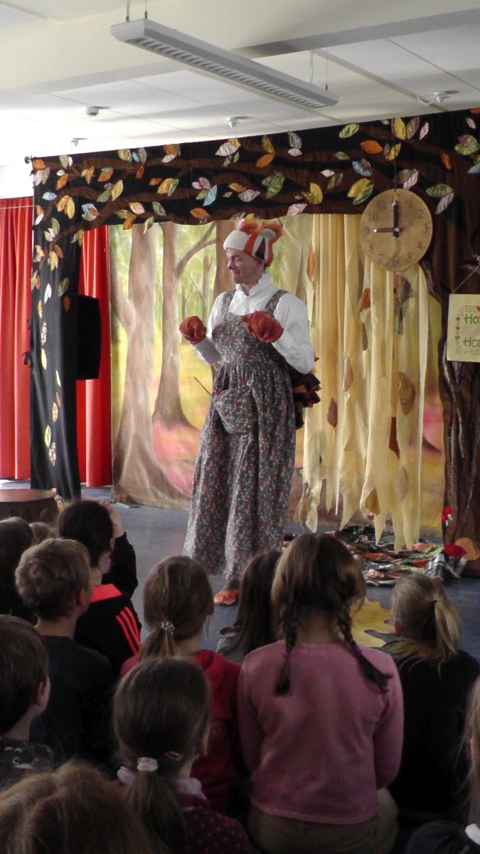 Das "White Horse Theatre" gastierte mit zwei Schauspielern und einem prächtigen Bühnenbild in unserer Schule und zeigt den versammelten 3. und 4. Klässlern das Stück "The Tale of Susie Squirrel".