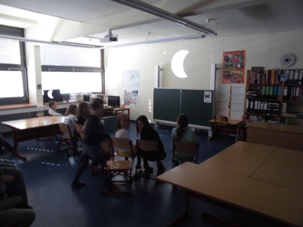 Darüber hinaus erklärten die Klassenlehrerinnen und zeigten in ihren Klassen, was Sonnenfinsternis bedeutet und wie sie entsteht. Sehr anschaulich wurde es dann auch probiert, die Kinder waren über die Effekte sehr erstaunt.