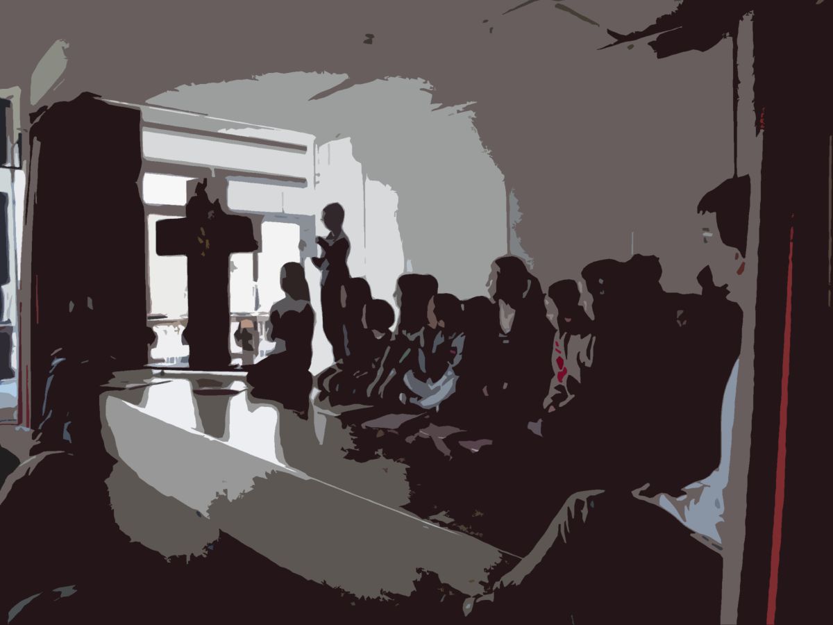 Einige Mädchen versammelten sich auf der Bühne mit der Frage, was Pfingsten eigentlich ist und bedeuten kann.