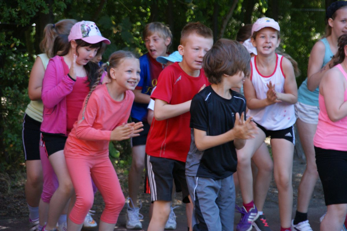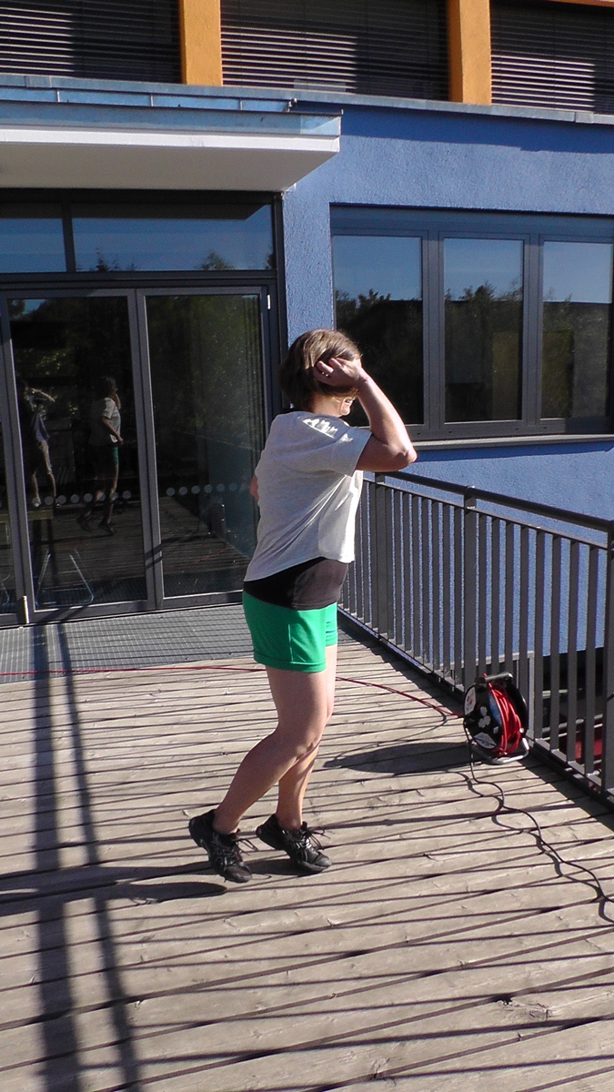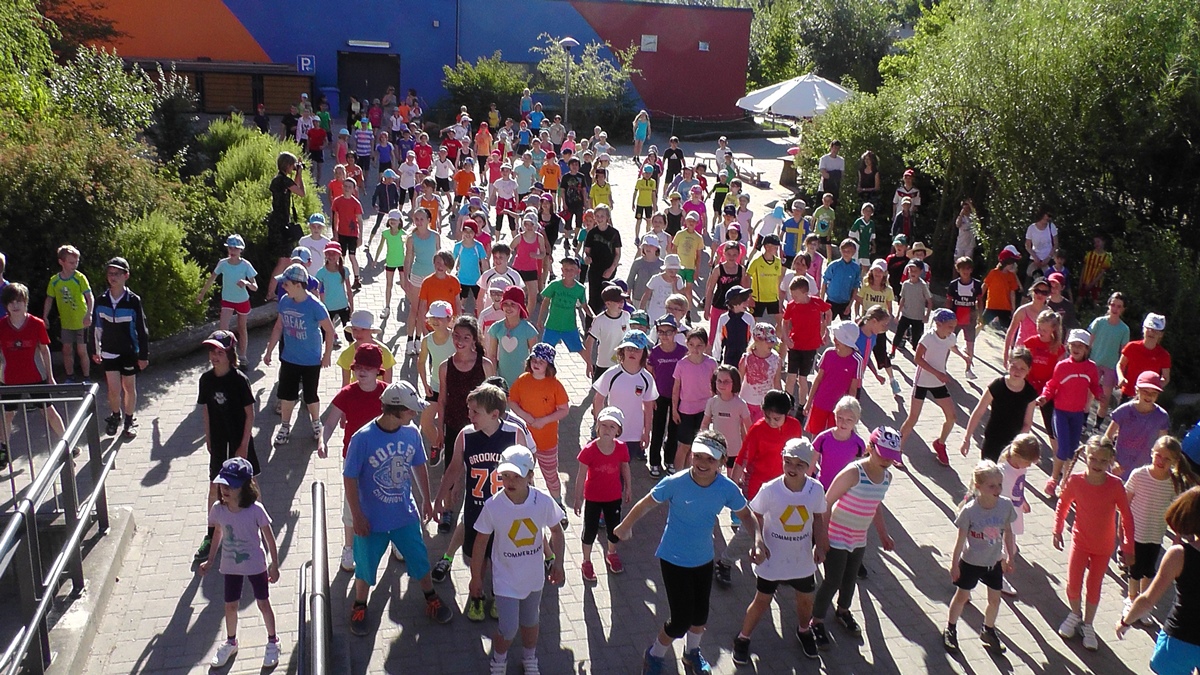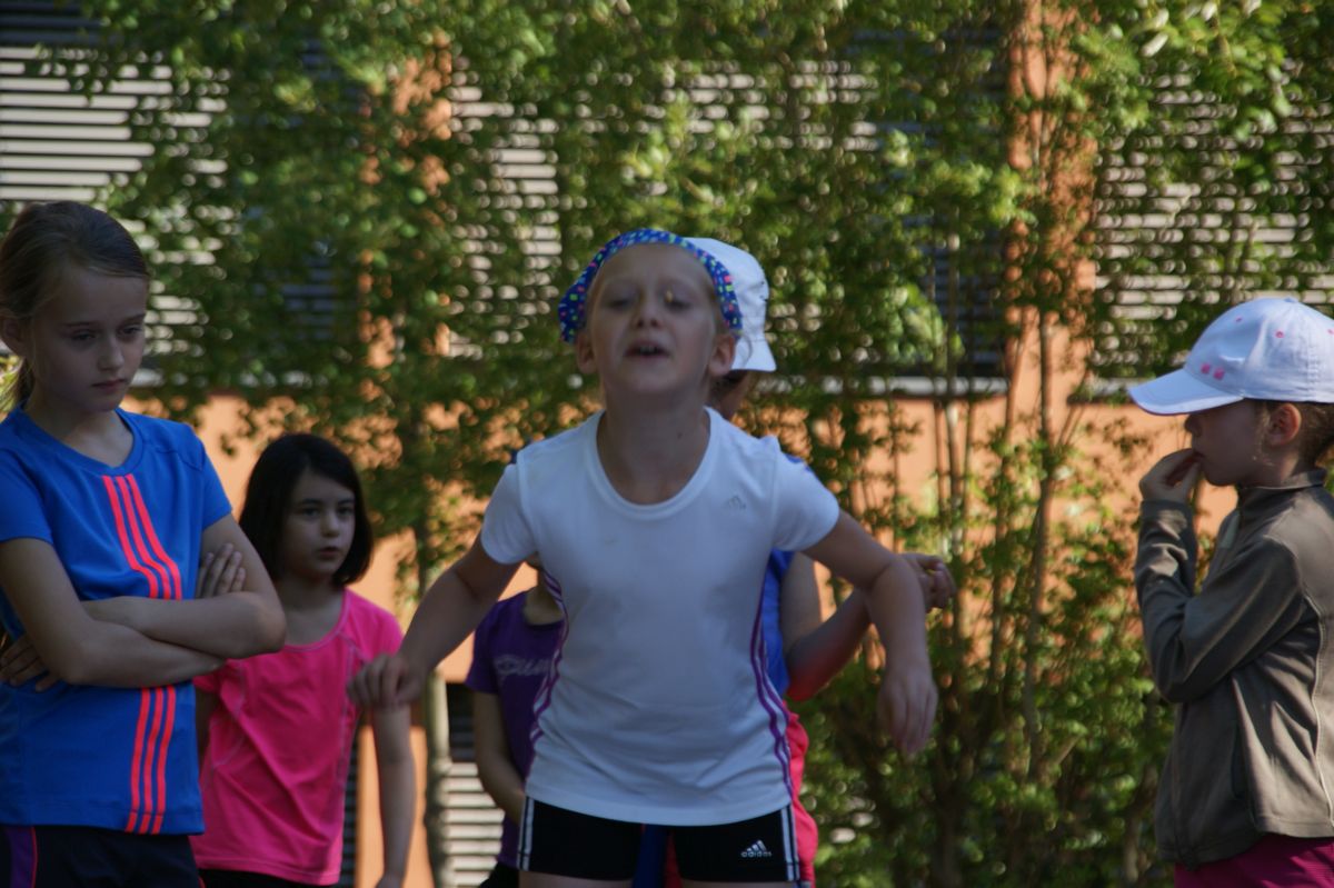 Freundlich ging es auch los, Frau Hahn begrüßte die kleinen und großen Sportler und anschließend brachte Frau Schumer die ganzen 200 Athleten mit einer gemeinsamen Erwärmung in Schwung.