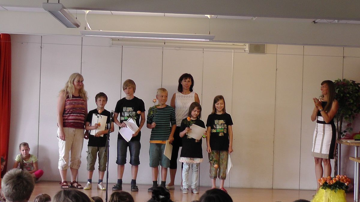 Denn die Grundschulzeit ist damit vorbei. Vier schöne und erlebnisreiche Jahre mit auf und ab, mit hin und her. Bevor es aber soweit war, hatten die Mäuschen und Schmetterlinge ihren Auftritt im Schulanfangsprogramm "Der Wunschring". Aus einem Ring werden zwei, aus Freundschaft wird Neid und schließlich bemerken die zwei Hauptpersonen, dass sie gemeinsam viel Schöneres erreichen und wünschen können.