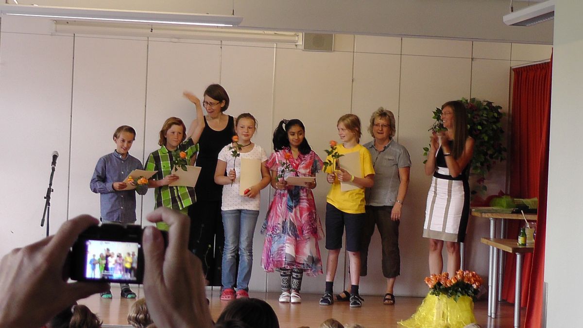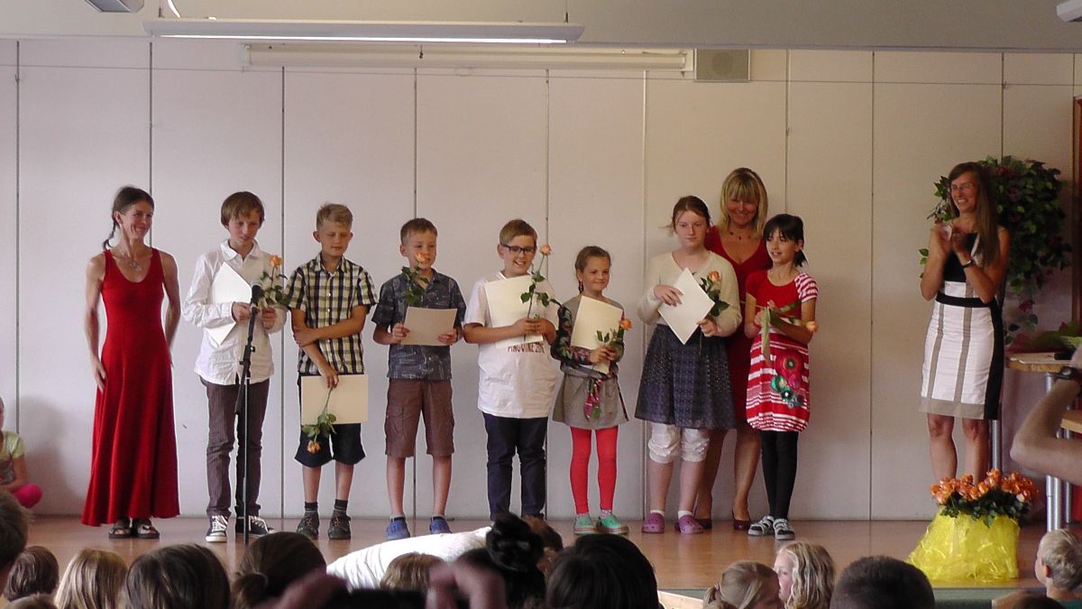 Der spannende Moment war da, für alle: Zeugnisse aus der Hand der Klassenlehrerin! Was wird drin stehen? Welche Note habe ich da und dort? Und für die Vierklässler ein ganz besonderer Moment: statt Schultüte wie vor vier Jahren bekamen sie ihre Abschlusszeugnisse. Und feuchte Augen...