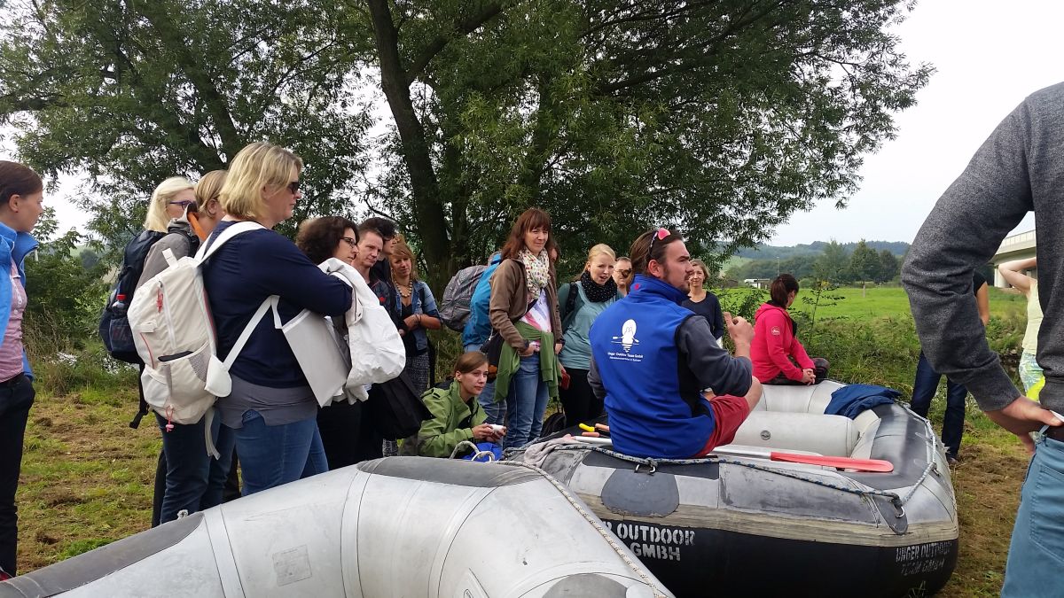 Auf zwei Busse verteilt wurden die etwa 100 (!) MitarbeiterInnen nach Leisnig gebracht, zur Anlegestelle. Denn so hatten es sich die Organisatorinnen überlegt: es sollte aufs Wasser gehen!