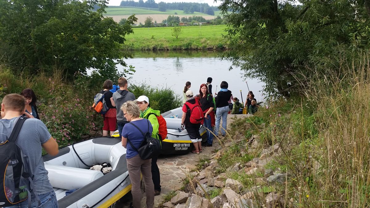 Gesagt, getan, als man in den Booten saß, kam es auf Teamarbeit an. Paddeln, steuern, zurufen, auf flachen Flussstellen aufsitzen, aussteigen, anheben, sich freuen, ins Boot springen, weiterfahren, überholen, sich drehen, sich treiben lassen, reden und Sprüche machen und schließlich heil und fast trocken am Ziel ankommen.