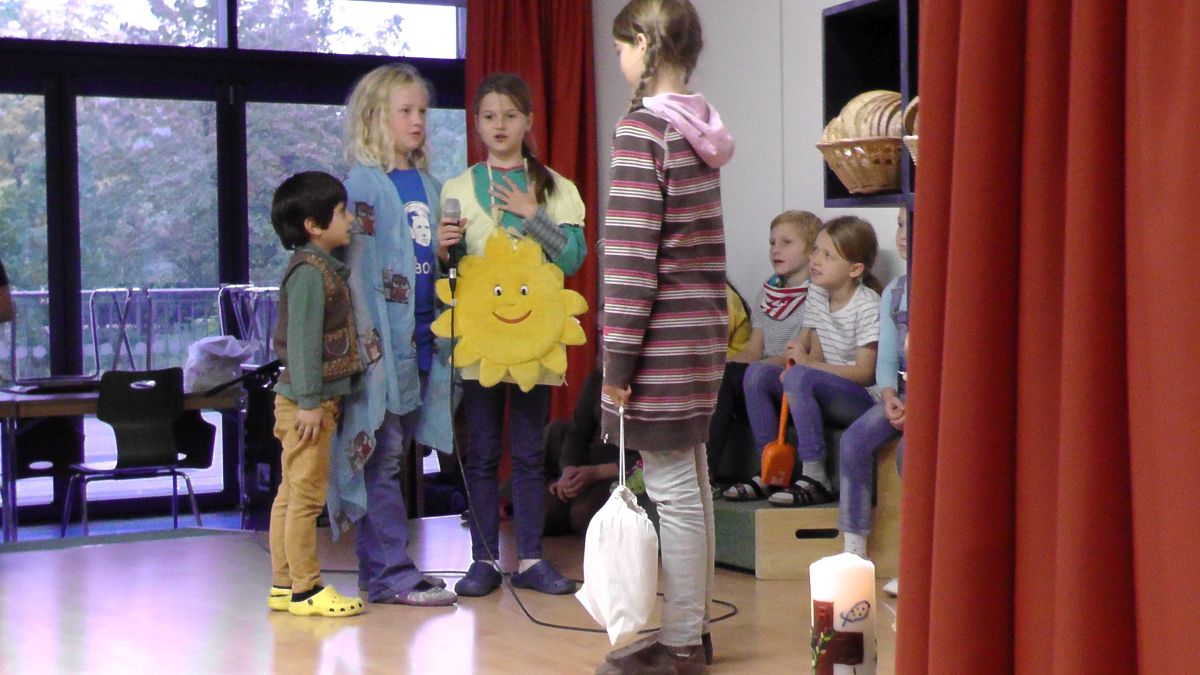 Von den Tigern und Frau Schwope vorbereitet sahen die Kinder die Dankes-Kette, als ein Mädchen sich für das Brot bedanken will. Sie gelangte dabei von der Verkäuferin, zum Spediteur, Bäcker, Lieferant, Getreidearbeiter, Bauer, zu den Körnern, dem Wetter und schließlich Gott, der all das hat wachsen und gedeihen lassen.