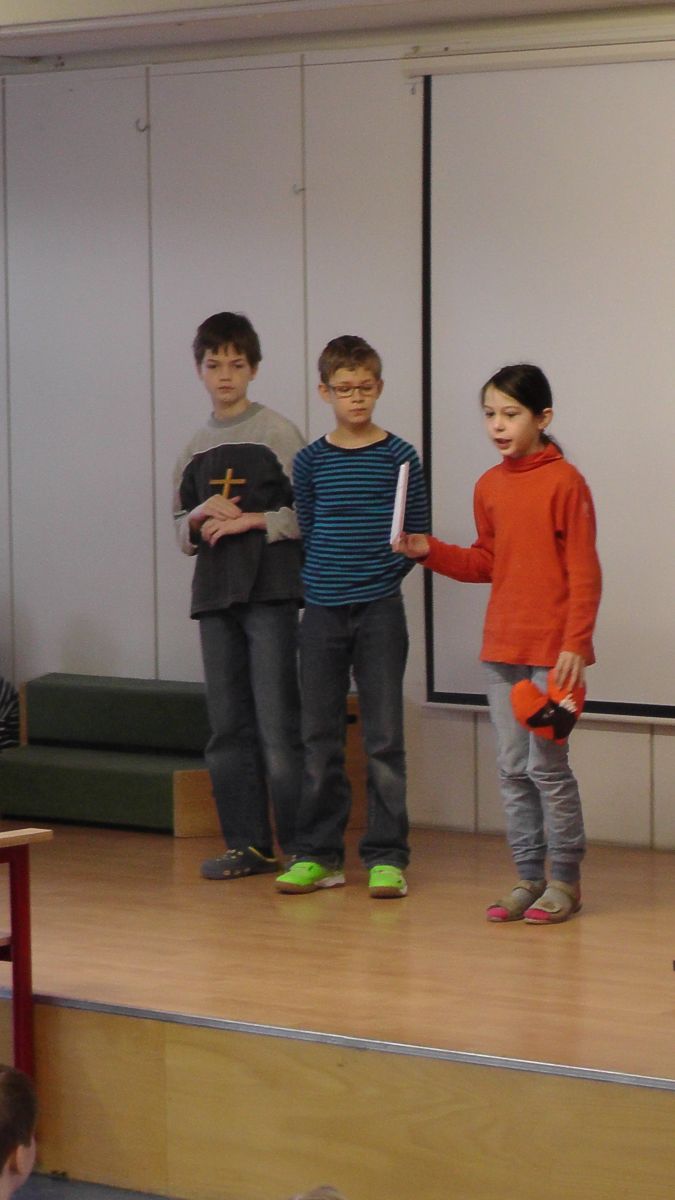 5. Das Anspiel: da jede Andacht von einer anderen Klasse vorbereitet wird, gibt es auch jedesmal andere Ideen zur Umsetzung. Manches Thema wird als Szene dargestellt, manchmal gibt es kleine Theaterstücke, teilweise Pantomime mit Erzähler, manchmal auch kleine Vorträge von Schülern. Allen ist das Ziel gleich, das Thema der Andacht anschaulich darzustellen.