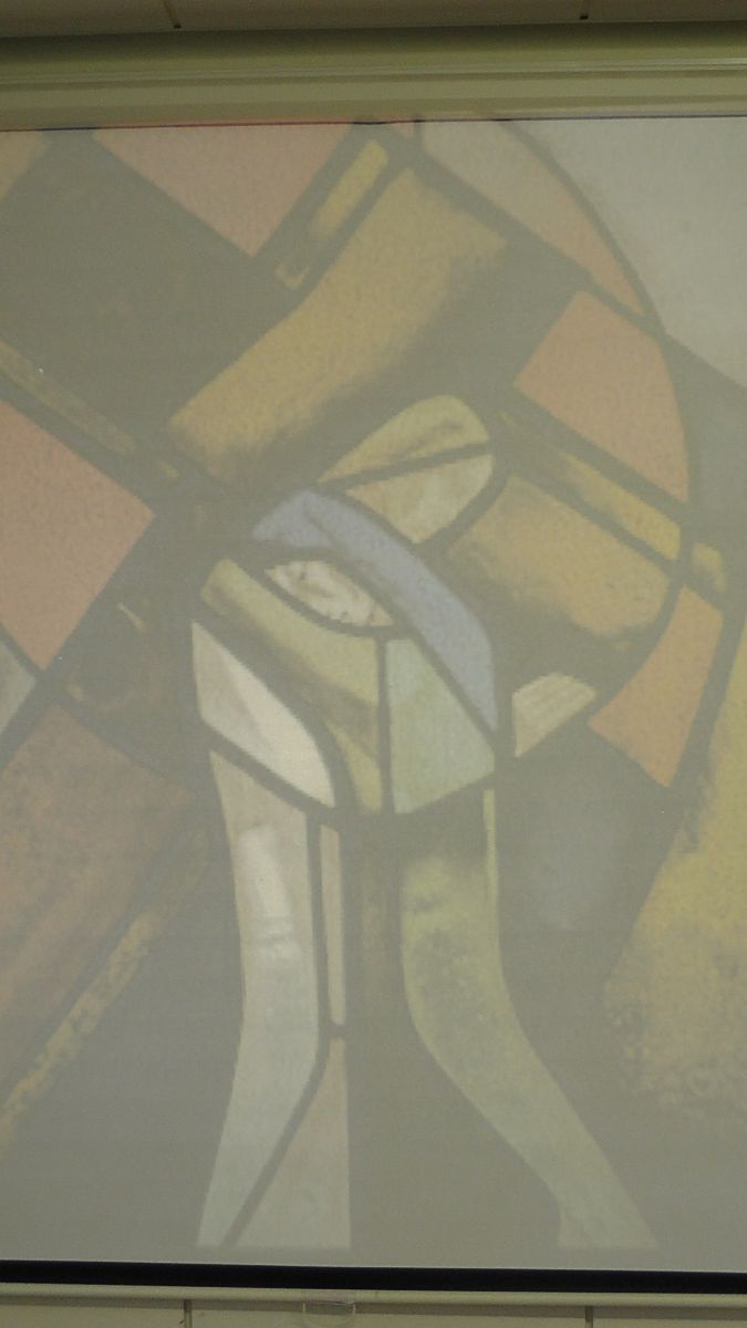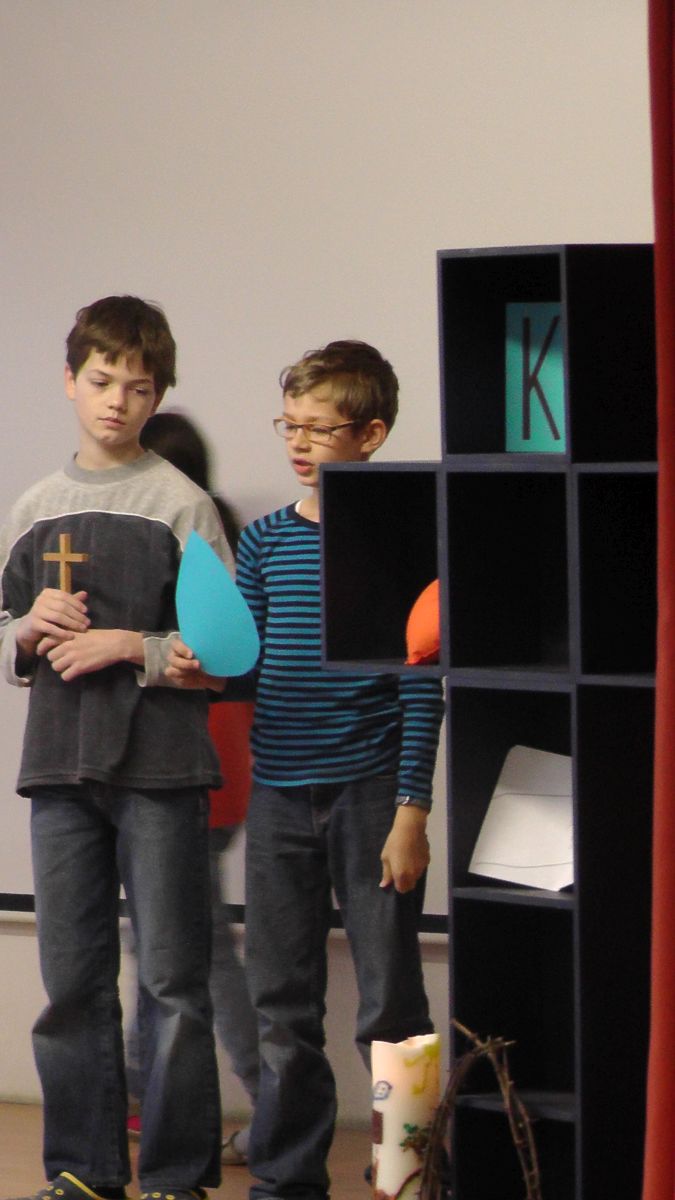 7. Das Holzkreuz: es wird durch die Kinder, die die Andacht vorbereitet haben, mit typischen Gegenständen/Zeichen des Themas gefüllt. Bei der heutigen Andacht fanden darin Platz: eine große Träne, ein Holzkreuz, ein rotes Stoffherz, ein Weg, eine Dornenkrone und ein großes K, das für "Kar" steht. Dieses Kreuz steht entweder eine Zeit lang auf der Bühne und/oder kommt danach mitsamt Inhalt in den Stilleraum.