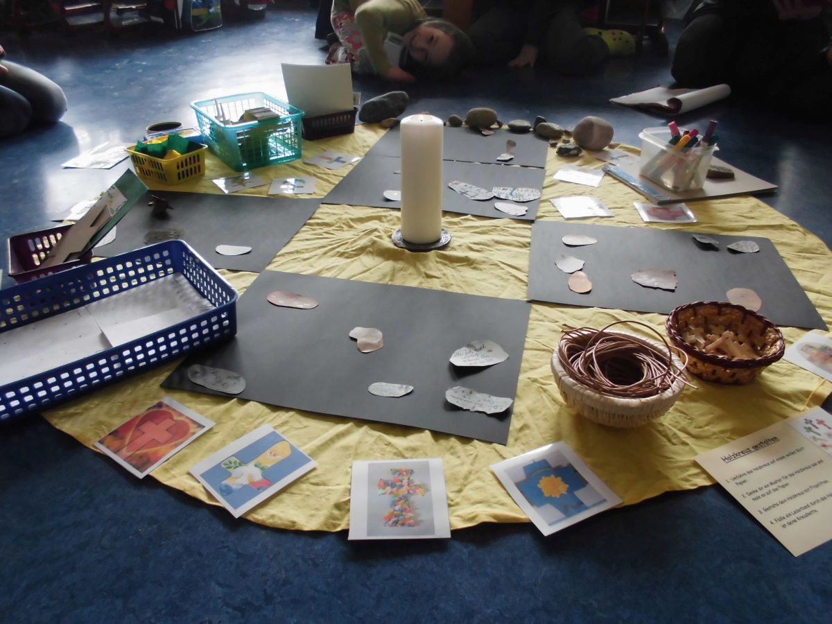 2. Die Kerze: "Als Zeichen, dass Gott in unserer Mitte ist, zünden wir nun die Kerze an." Mit diesen Worten entzünden wiederum zwei Kinder die Andachtskerze. Beides, Kerze und Klangschale werden in das große Holzkreuz gestellt.