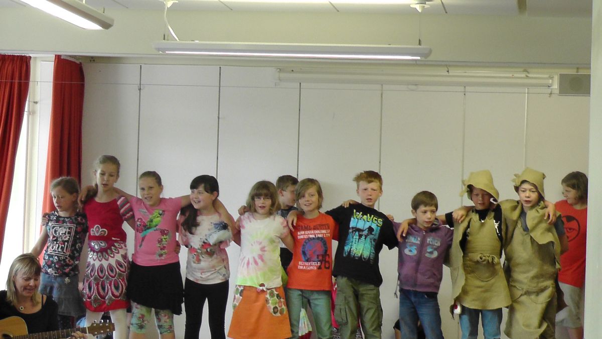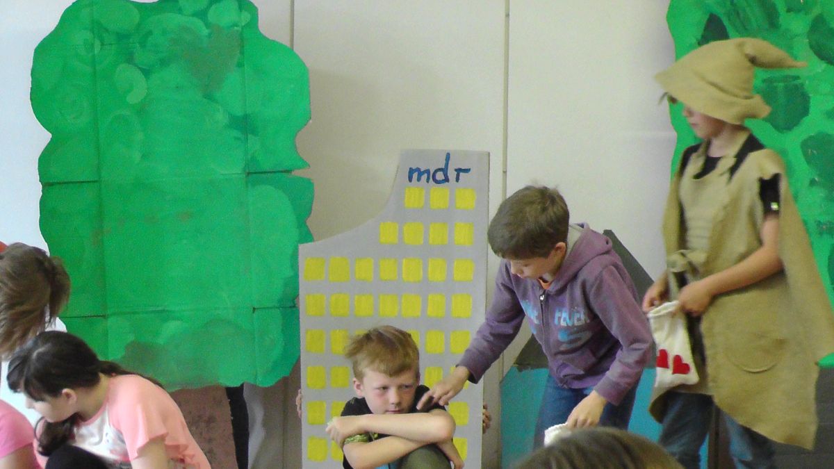 Die Zweitbesetzung durfte heute ran und vor allen Grundschülern und vielen Eltern das Stück zeigen, bei dem die unbeschwerten, freundlichen kleinen Leute (von Leipzig) durch die Einflüsterungen eines Kobolds misstrauisch, traurig und einsam werden.