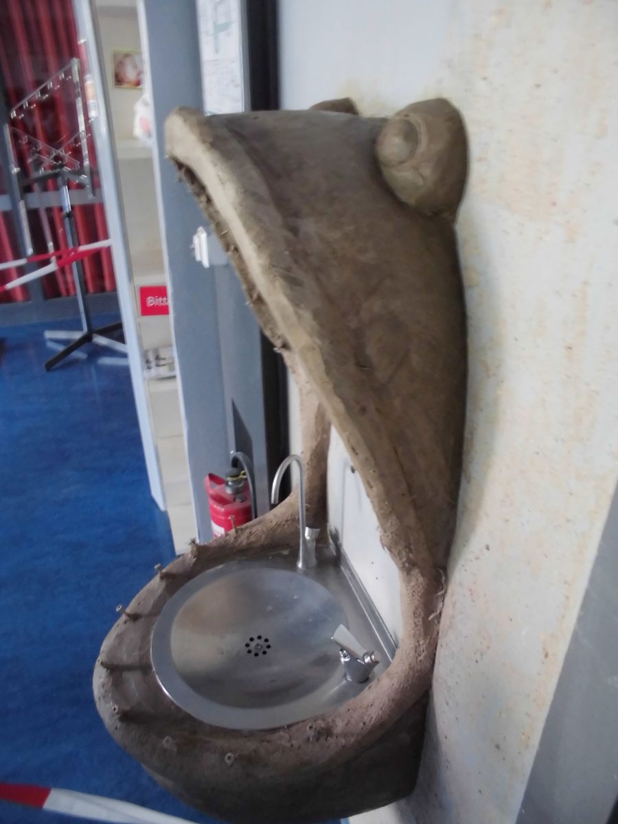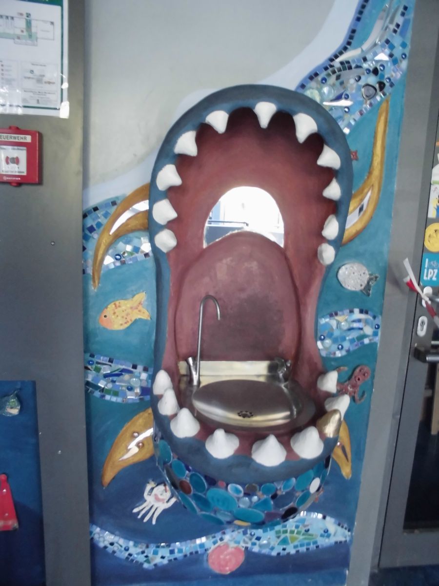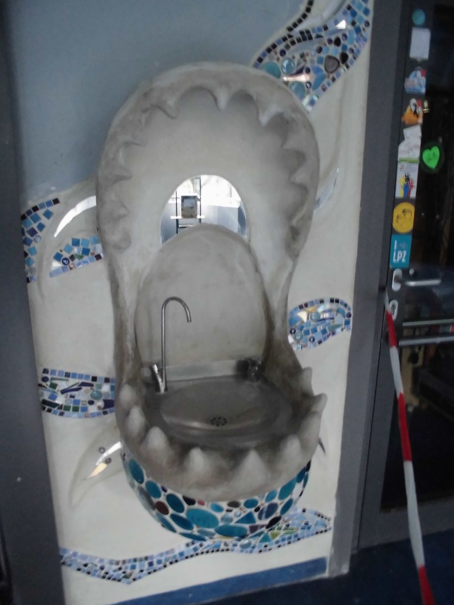 Hier droht keine Gefahr, auch wenn es stark danach aussieht. Hier droht Erfrischung! Aber mutig müssen die Kinder sein, die ihren Kopf in dieses Maul stecken oder die Wasserflasche unter den Hahn stellen.