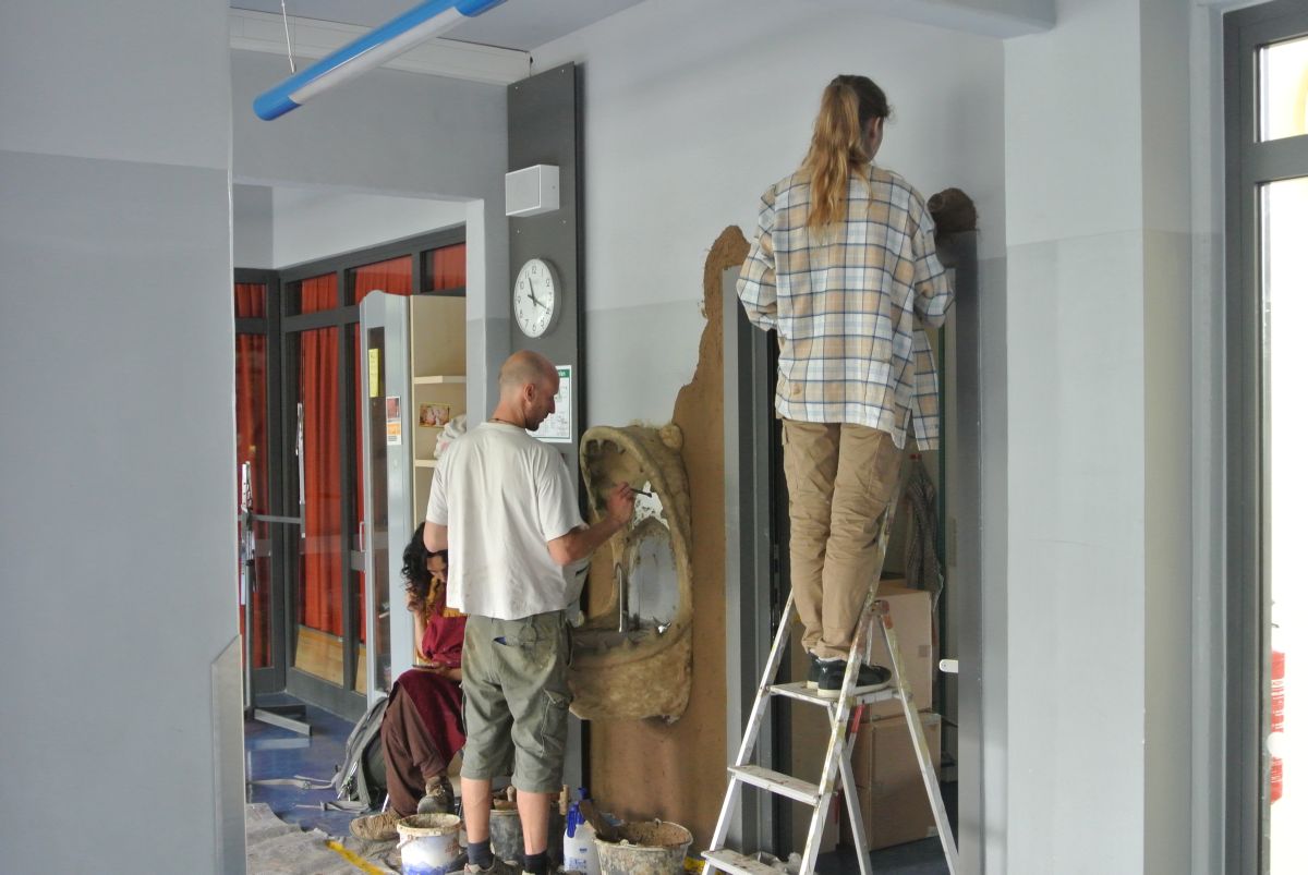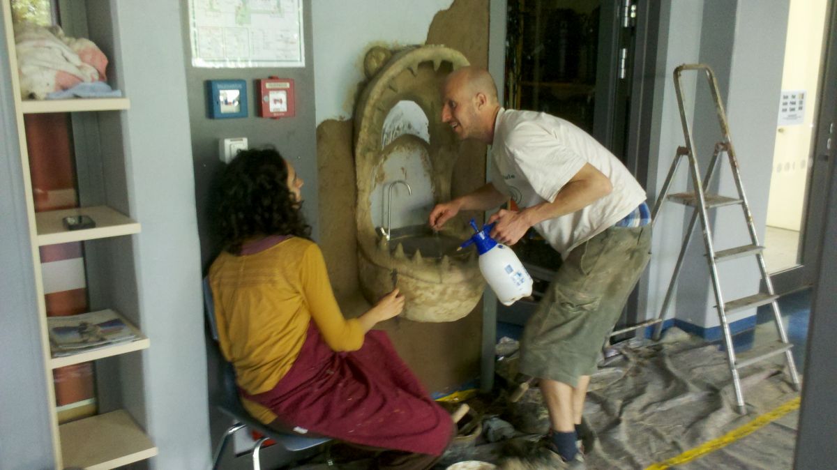 Danach ging es für die Künstler an die Arbeit. In verschiedenen "Bau-" Phasen entwickelte sich die Figur bis zur jetztigen Gestalt. Mit bunter Gestaltung und sogar einem Goldzahn lockt unser Monster nun die Kinder an und schenkt ihnen (nach bestandener Mutprobe) erfrischendes Wasser.