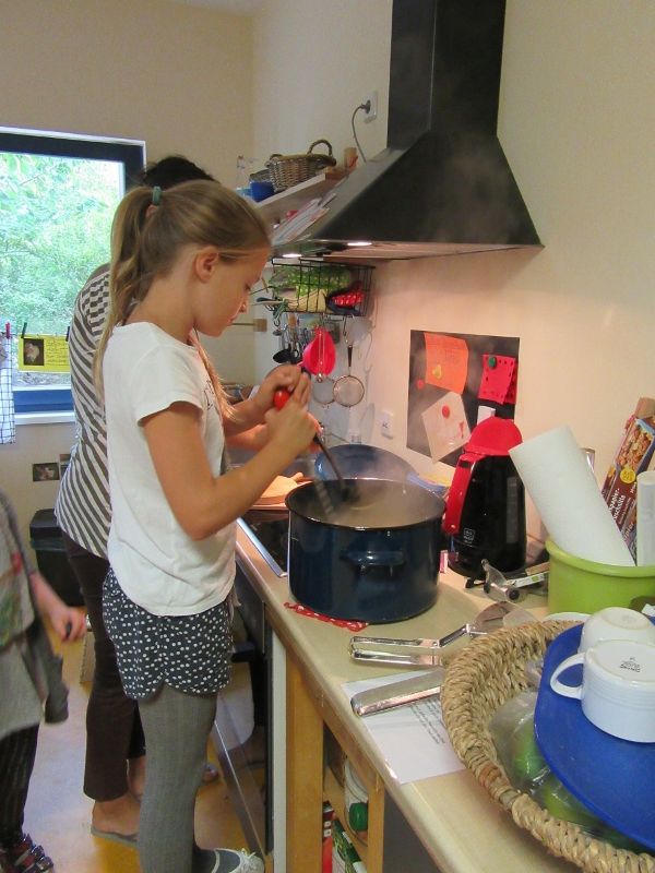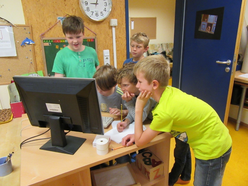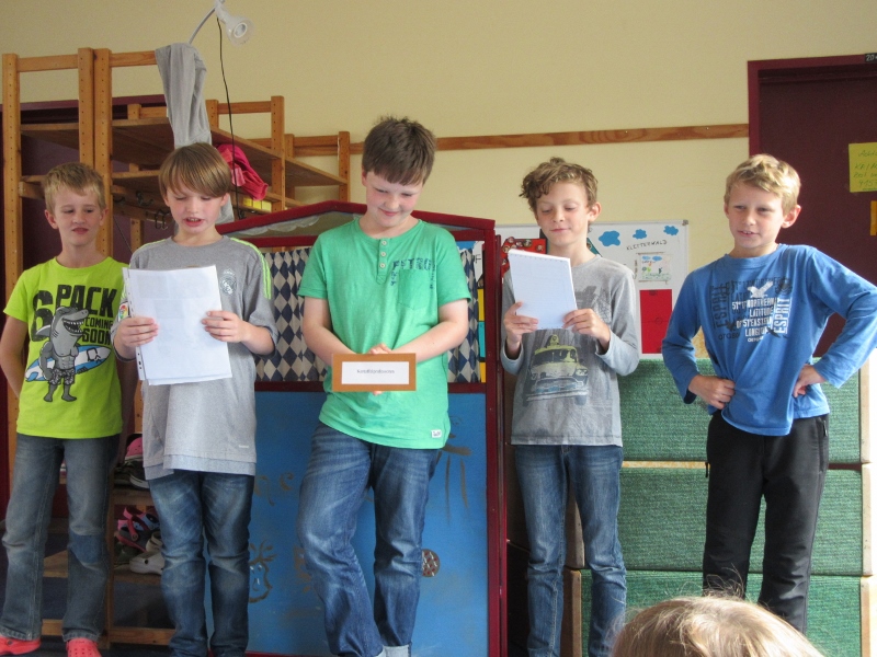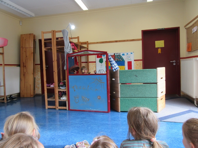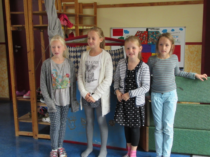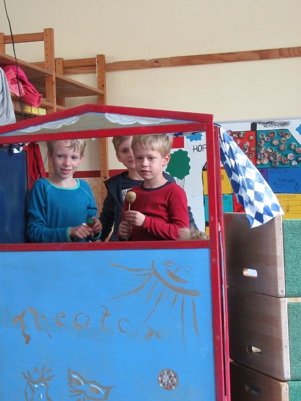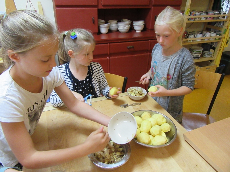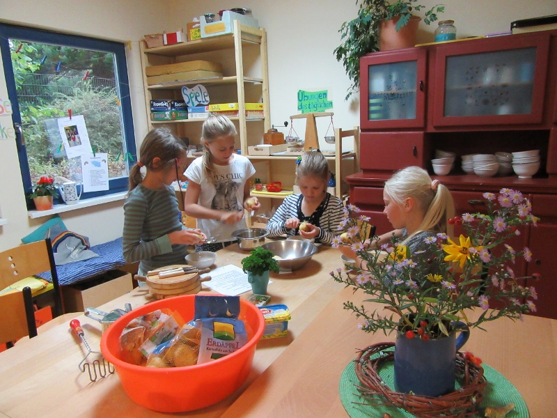 "Liebevoll und durchdacht von Anfangskreis bis Abschlusspräsentation hatte Claudia-Maria für uns im Anschluss an die Andacht 5 tolle Kartoffelstationen im Hort vorbereitet. Da gab es die Kartoffelbäcker, Kartoffelköche, Kartoffeldrucker, Kartoffelprofessoren und Kartoffelspieler. Alle Gruppen bekamen schriftliche Aufträge fürs selbstständige Arbeiten, konnten sich bei Bedarf jedoch auch Unterstützung herbeiwünschen. So wirkte jede Gruppe auf ihre Weise bei der Vorbereitung des abschließenden "Kartoffelfestes" mit. Am Tisch fand jeder seinen Platz anhand eines (auch) kartoffelbedruckten Platzkärtchens. Es konnten leckerer Kartoffelbrei mit Petersilie (unter den Zutaten eine "Brausetablette") und Kartoffelkuchen (nach "Landkarte"; Begriffe bei Bedarf bitte von den Kindern erklären lassen) verkostet werden. Zum Abschluss gab es gute Unterhaltung bei einem selbst erdachten und inszenierten Kartoffelpuppentheaterstück, in dessen Verlauf die Riesenkartoffel am Ende den Räubern glücklicherweise wieder abgeluchst werden konnte. Und als Geistesfutter einen kleinen Auszug aus den Forschungsergebnissen der Kartoffelprofessoren. Eine runde, gelungene Kartoffel, äh, Sache - danke, liebe Claudia!"