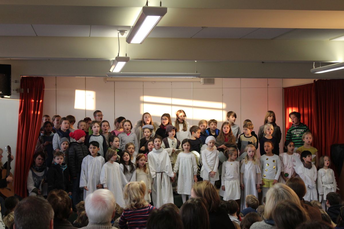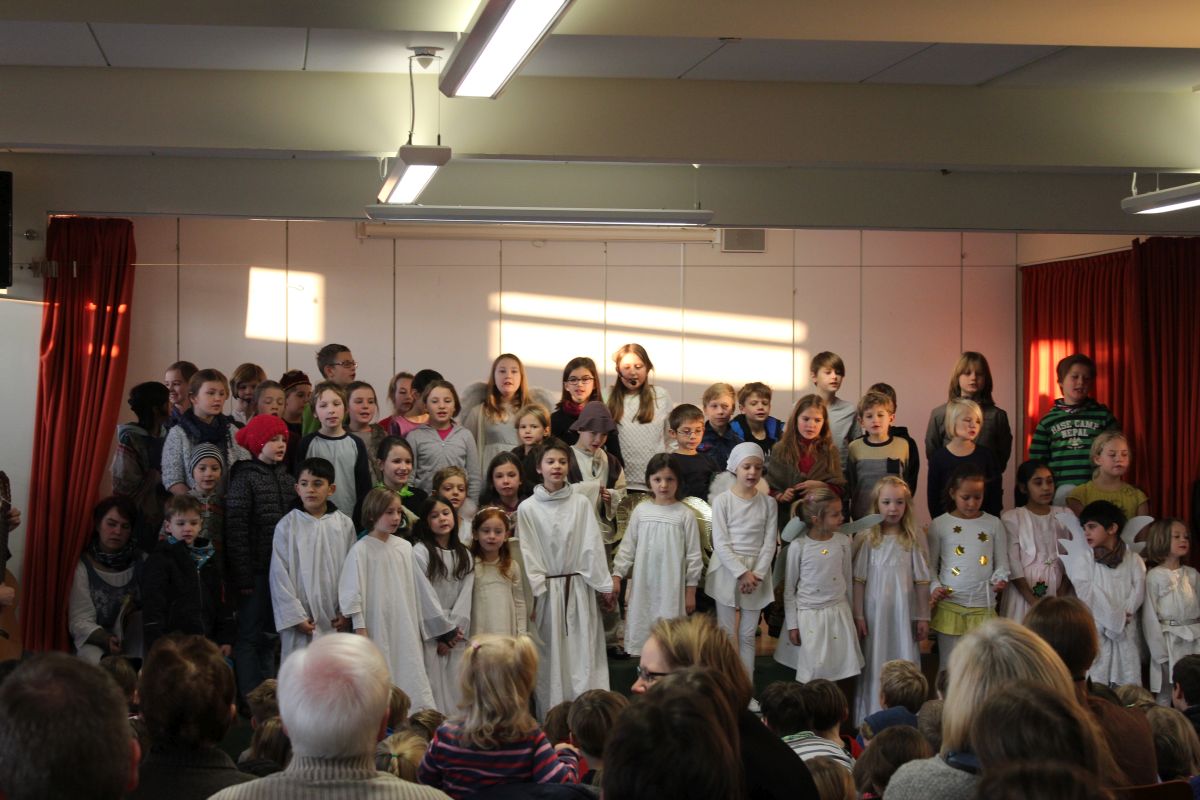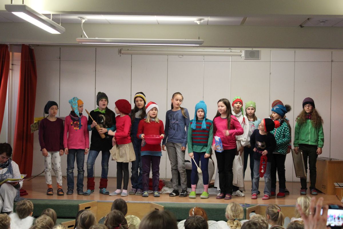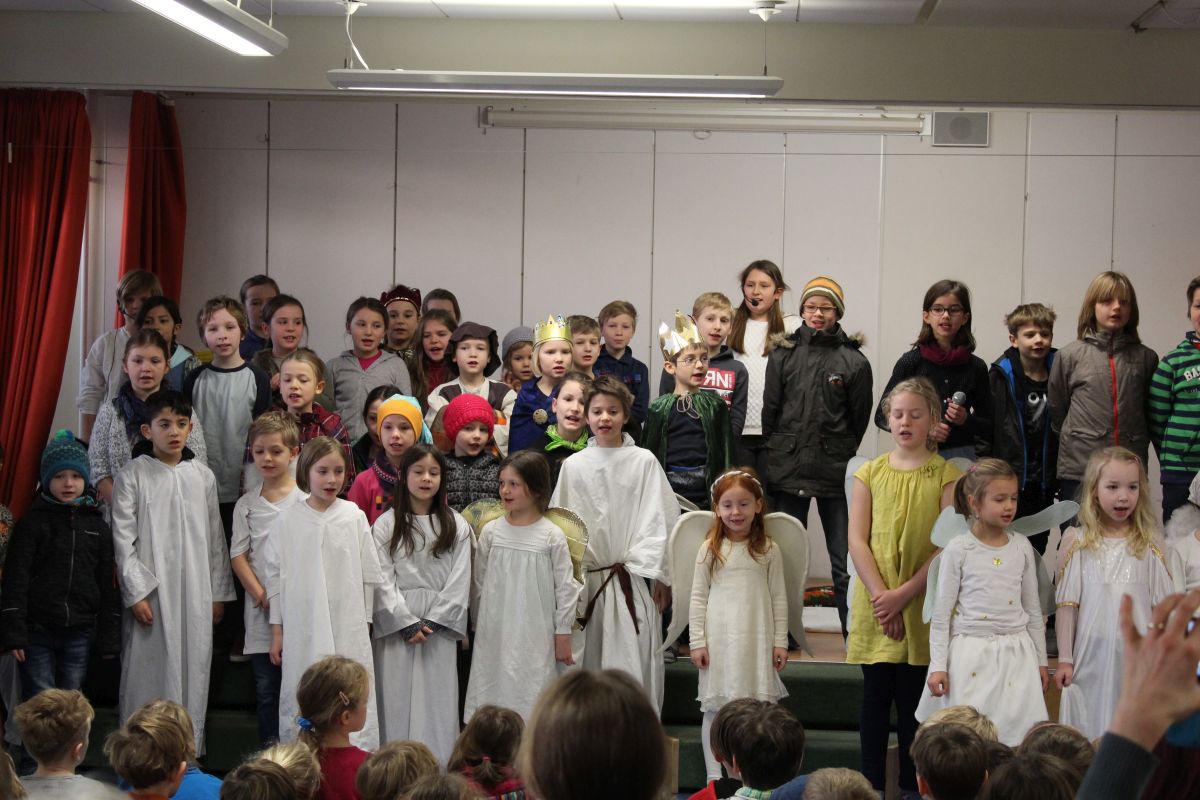 Die Tiger und Regenbögen warfen sich heute vormittag ein zweites mal in Schale und spielten für alle anderen Kinder und viele Eltern das Adventsstück "Das Geschenk der Weisen" in der Aula.