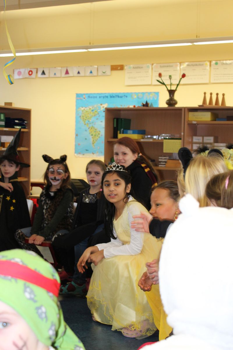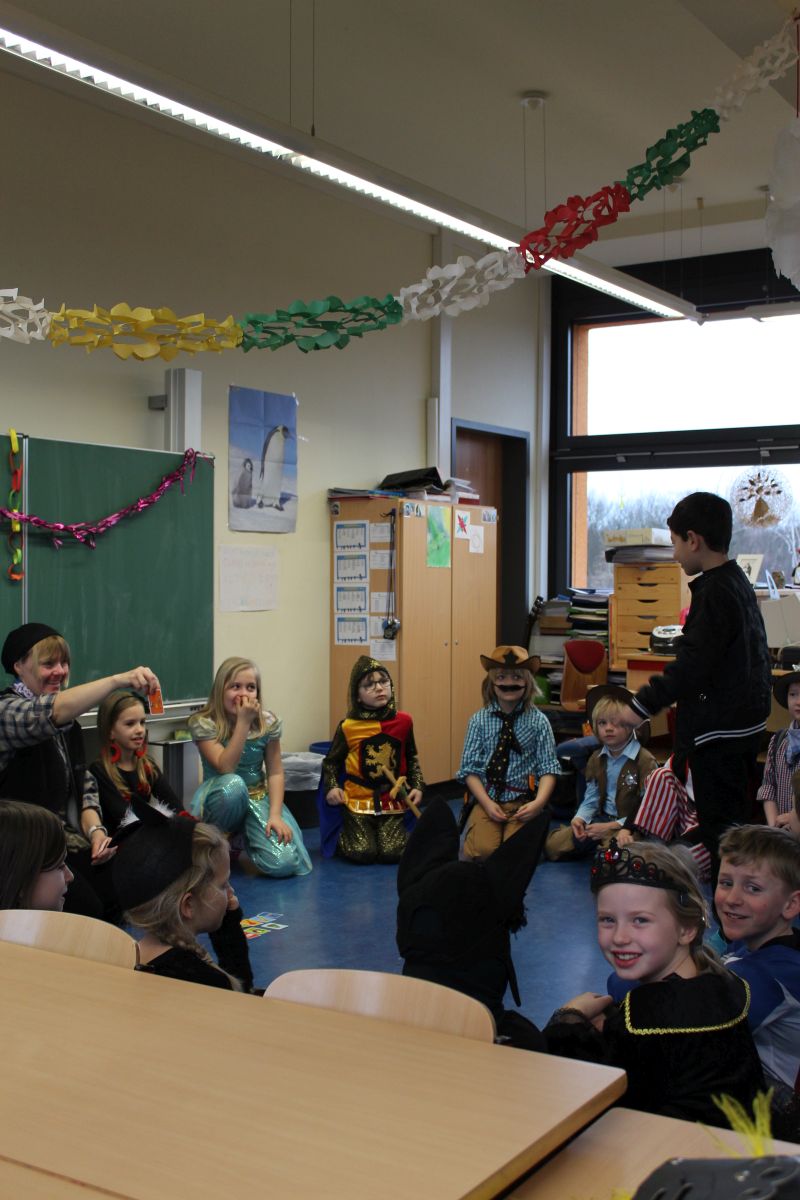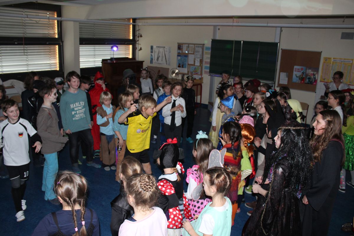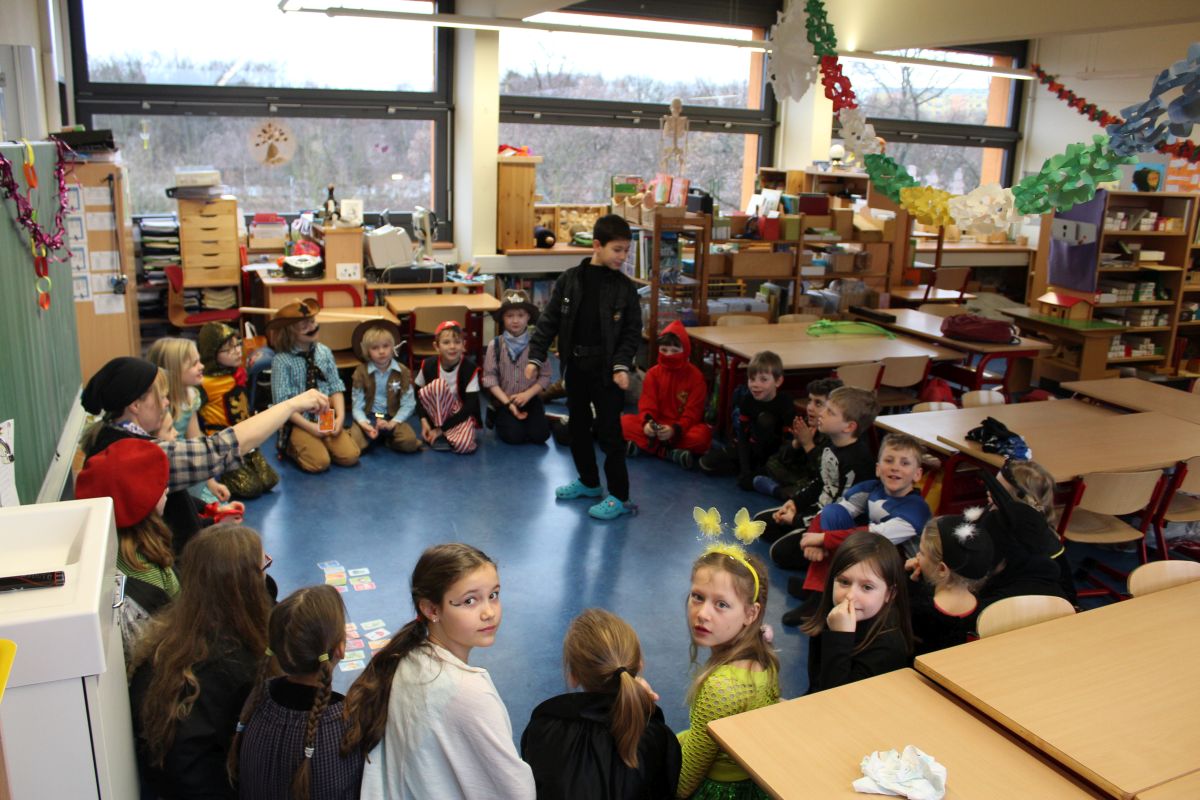 Begonnen wurde in den Klassen, jeder durfte sich mit seinem Kostüm vor der Klasse vorstellen, erste Partyspiele und -lieder wurden gespielt. Nach dem traditionellen Pfannkuchen und Frühstückessen ging es dann in polonäser Manier hinunter in die Aula. Dort angekommen (nach etlichen Runden und Schnörkeln) gaben die Lehrer ein kleines Stück zum Besten: "Wenn ich nicht Grundschullehrer wär, was würde ich dann sein...?", perfekt choreographiert natürlich :)