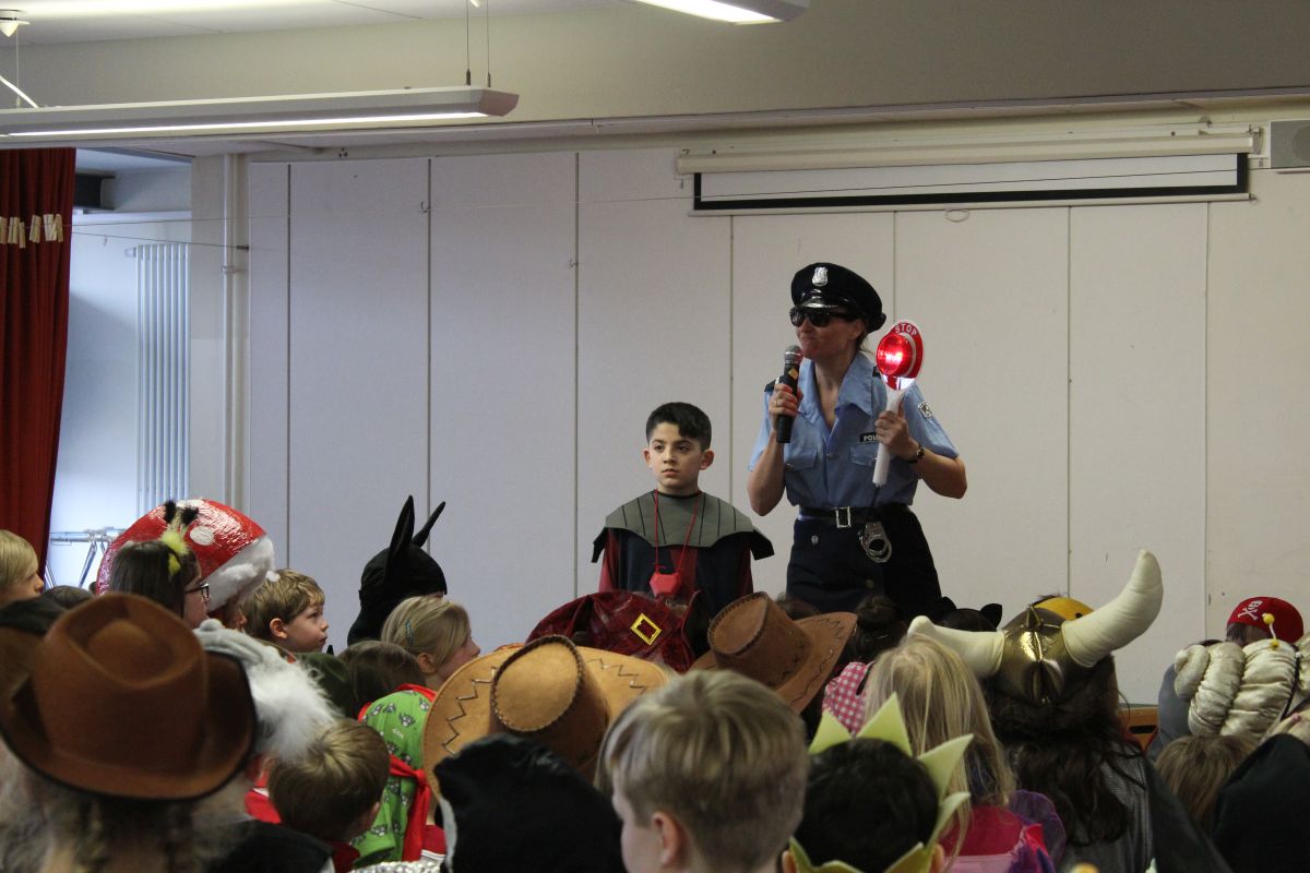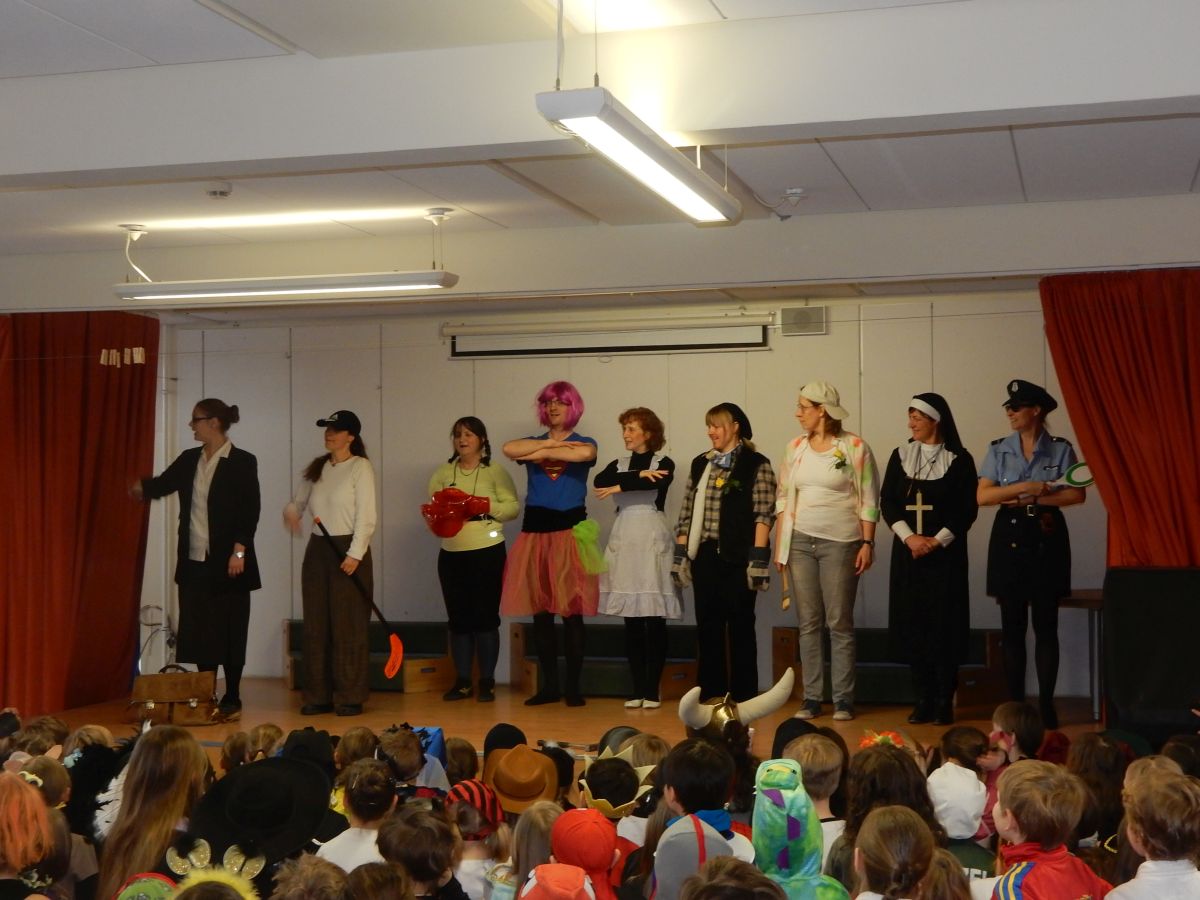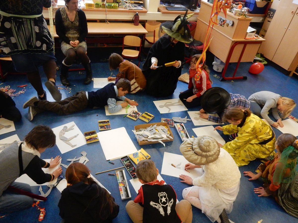 Begonnen wurde in den Klassen, jeder durfte sich mit seinem Kostüm vor der Klasse vorstellen, erste Partyspiele und -lieder wurden gespielt. Nach dem traditionellen Pfannkuchen und Frühstückessen ging es dann in polonäser Manier hinunter in die Aula. Dort angekommen (nach etlichen Runden und Schnörkeln) gaben die Lehrer ein kleines Stück zum Besten: "Wenn ich nicht Grundschullehrer wär, was würde ich dann sein...?", perfekt choreographiert natürlich :)
