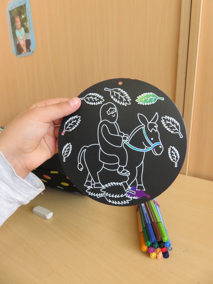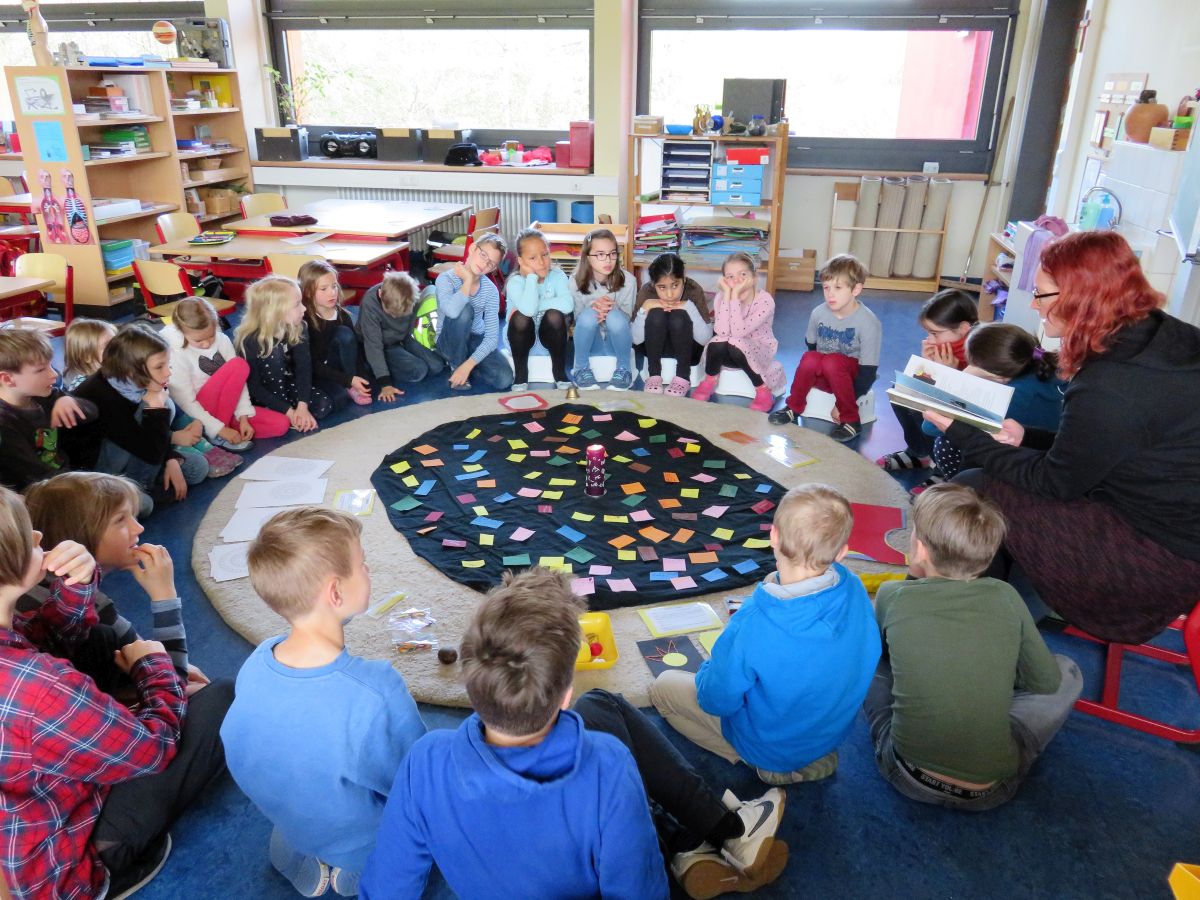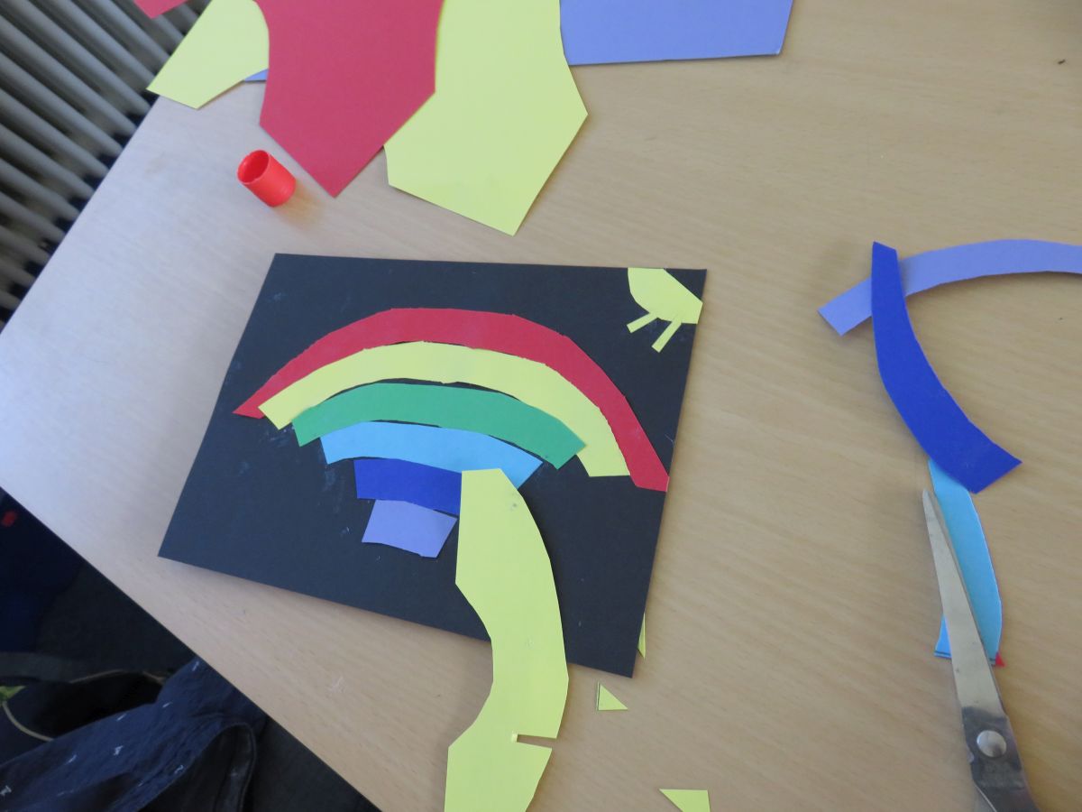 So verwandelte sich ein anfangs düsterer Teppich in einen mit vielen hellen Gedanken. Am Dienstag wurde das Thema Streit diskutiert. Wie entsteht Streit, wer streitet wann, wo und warum und vor allem: wie lässt sich Streit vermeiden oder beenden? Mit einer Geheimmission starteten alle in die nahe Zukunft... Neben dem intensiven Gedankenaustausch gab es noch ganz viel Gelegenheit zum Basteln und Gestalten.