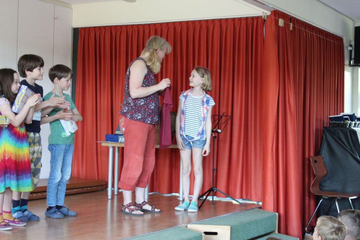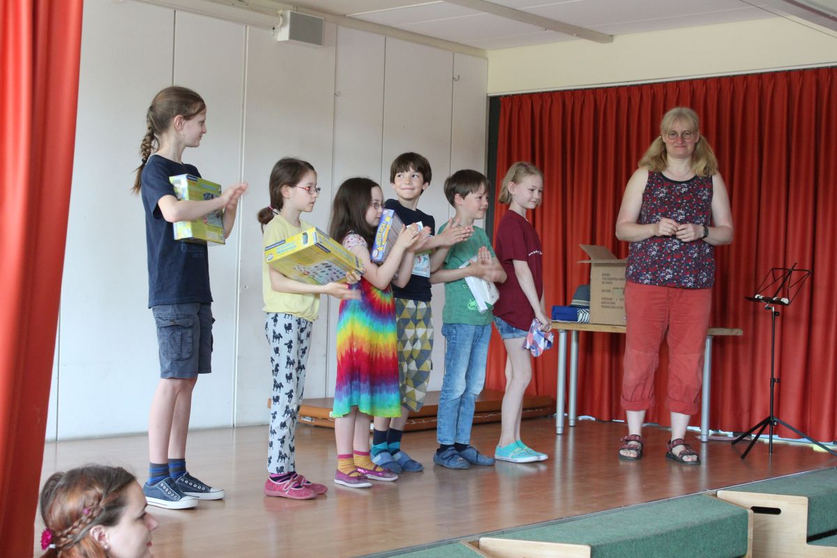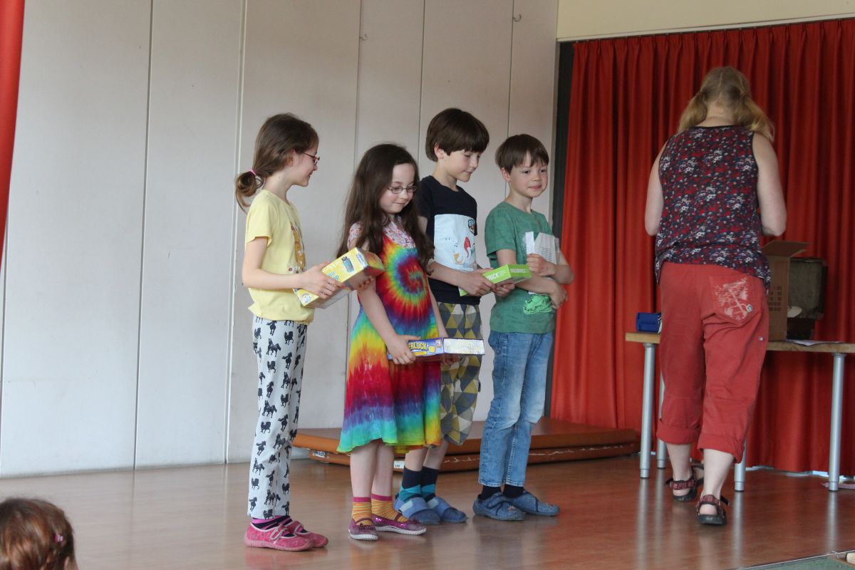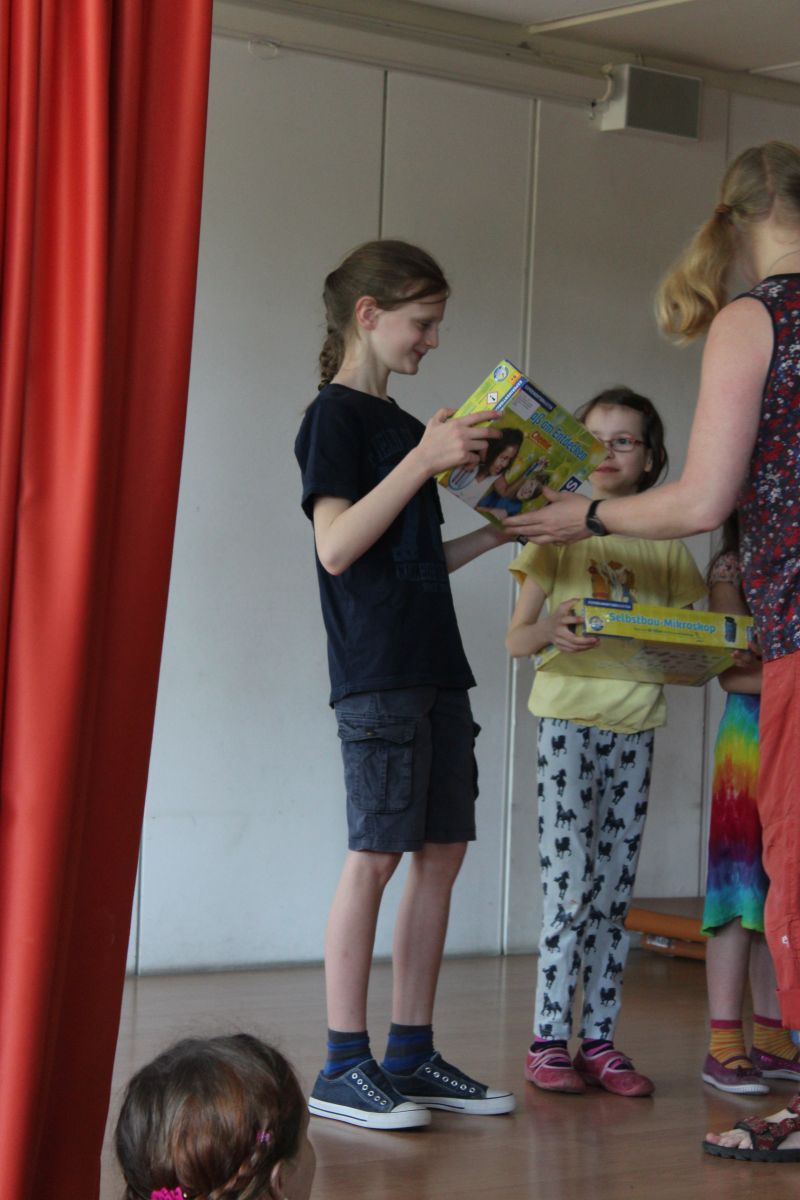 Zusätzlich zur Urkunde bekamen die Ausgezeichneten auch ein kleines bis größeres Präsent. Sowieso bekamen alle Teilnehmer eine Urkunde mit Punktzahl, ein Heft mit allen Aufgaben bis Klasse 8 sowie ein kleines Knobelspielzeug, das die Freiarbeit danach ganz gut ausfüllte...:)
