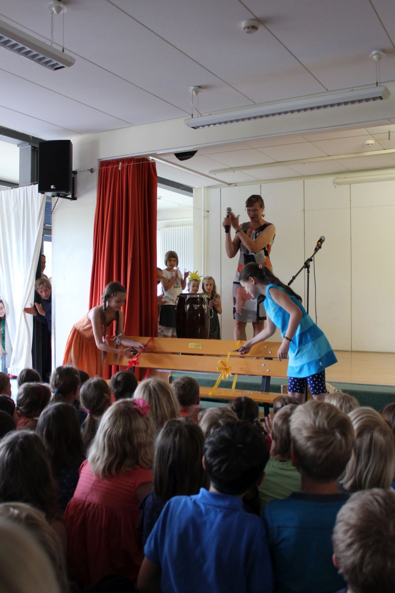 Denn die Viertklässler und ihre Eltern haben sich ein Abschiedsgeschenk an die Schule einfallen lassen: eine Bank! Geschmackvoll von den Kindern in orange angemalt (denn roter Flur + gelber Flur = orange Grundschule) und mit Plakette verewigt. Wer sich also in Zukunft mal in Ruhe an die jetztigen Viertklässler erinnern möchte, kann sich auf dem Schulhof auf die orangene Bank setzen und die Gedanken schweifen lassen. Vielen Dank dafür!