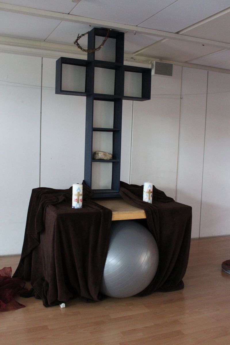 Wobei die kleinen Steine sich als Pflanzensamen entpuppen und der große Stein als Gymnastikball, der symbolisch das Grab verschloss, das sich an Ostern geöffnet hat.