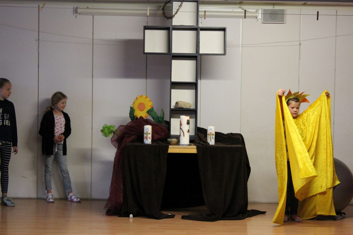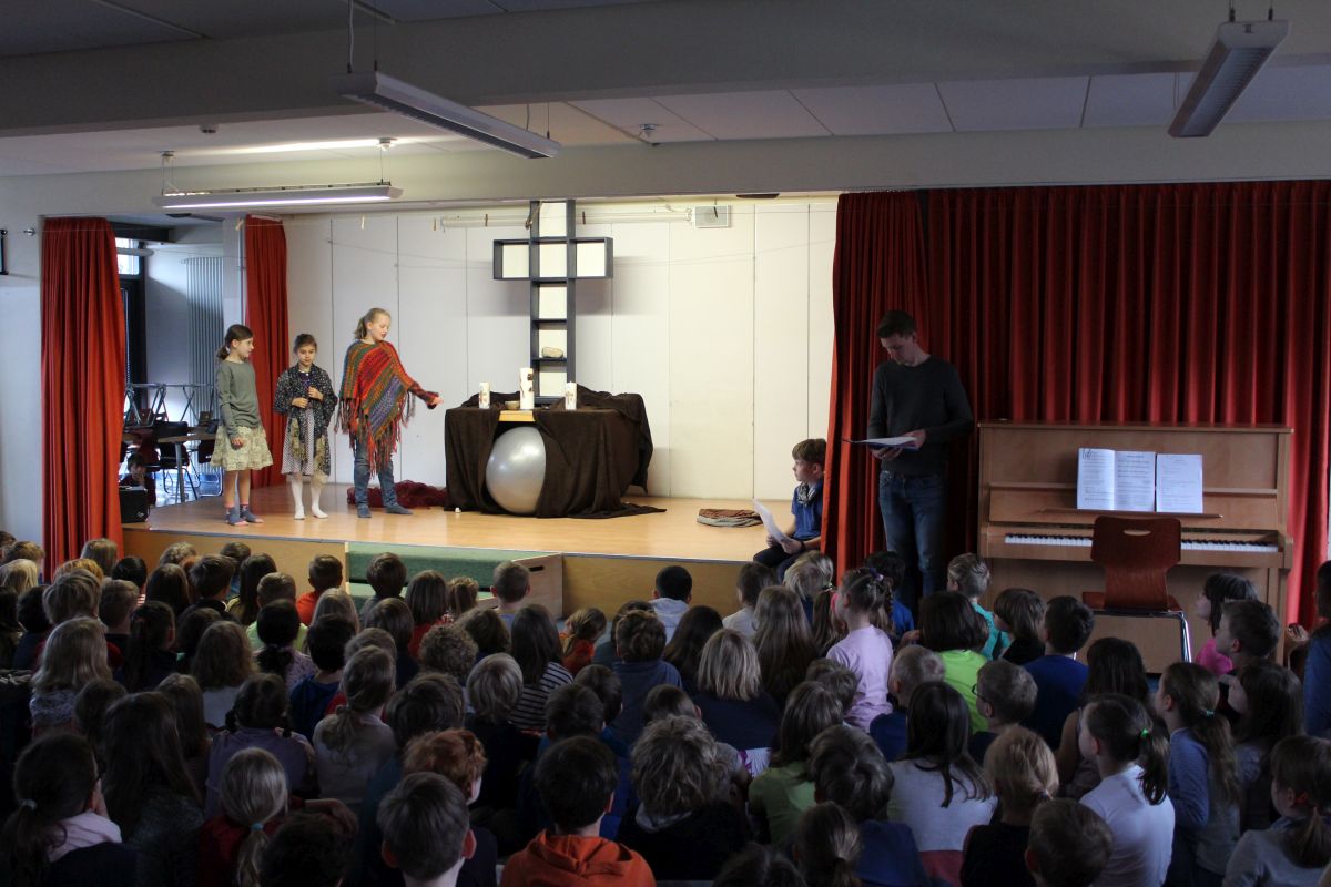 Die Robben und Schulseelsorger Leo Kindermann führten durch die Andacht mit Szenen, Liedern, Fürbitten und der Osterbotschaft. Hier ein Auszug aus dem Spiel: