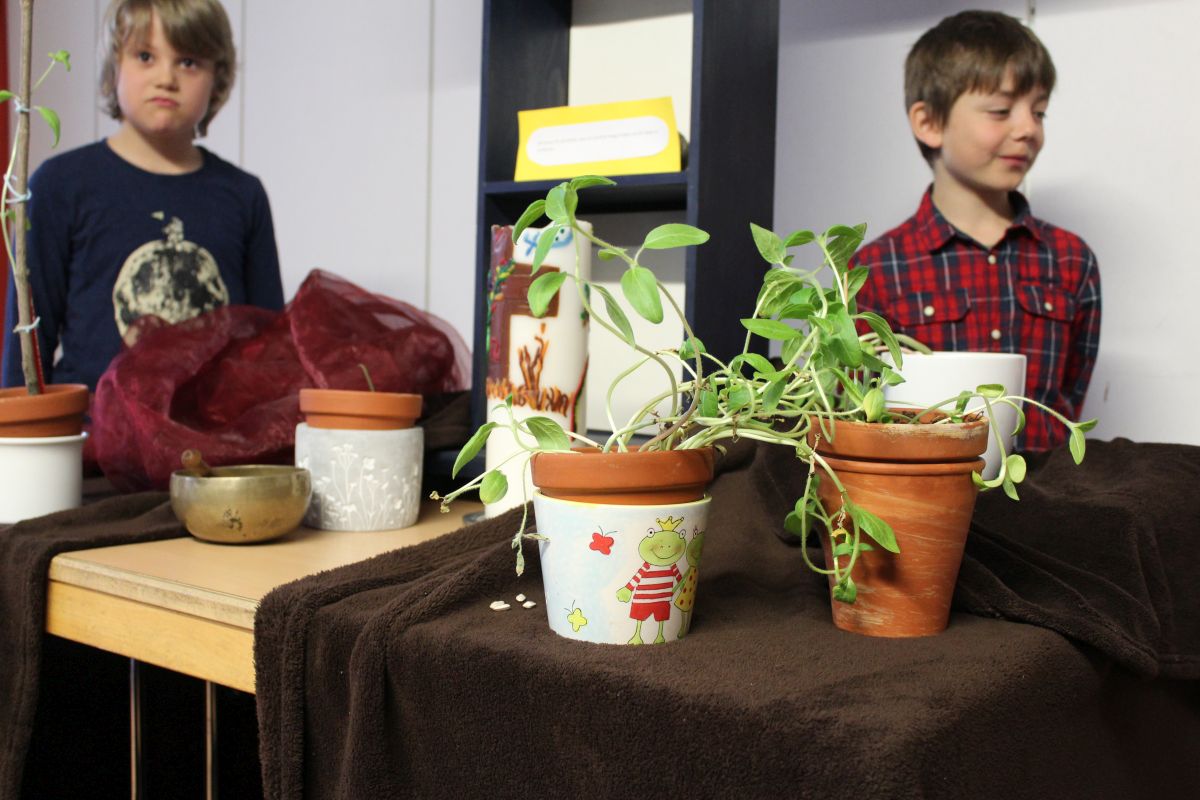 Zum Ende der Andacht wurden auch die Töpfe mit den Pflanzen nach vorn gebracht, die aus den Samen der Karandacht entstanden waren.