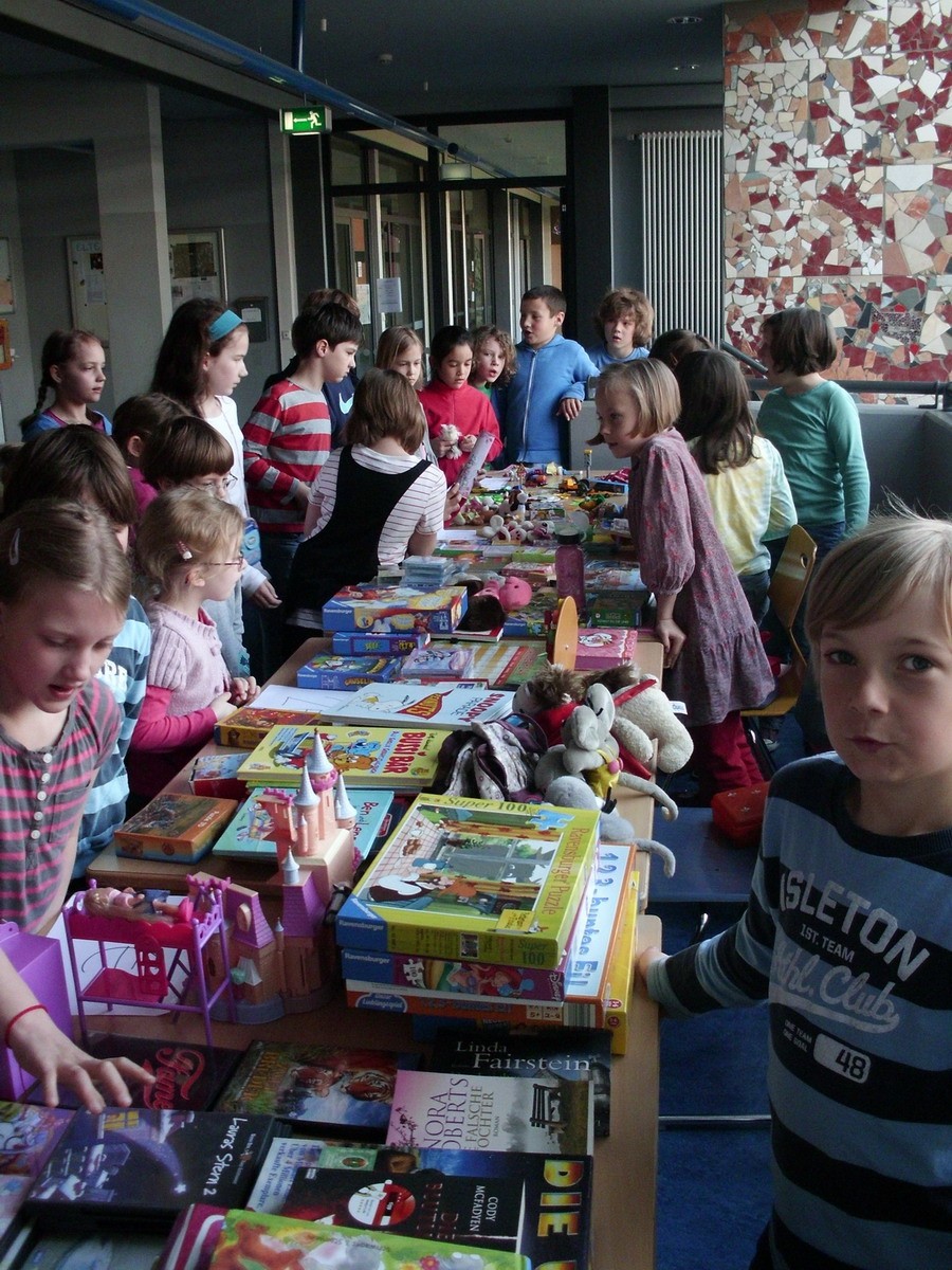 Es wurden aber auch besondere Spenden-Aktionen ausgedacht, zum Beispiel der Spendenflohmarkt einer Klasse während der Hofpausen. Die Kinder sammelten zuerst Spielzeug und Bücher von zuhause und verkauften es im Flohmarkt an andere Kinder weiter.