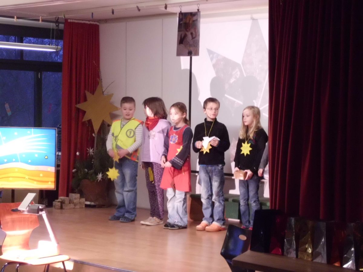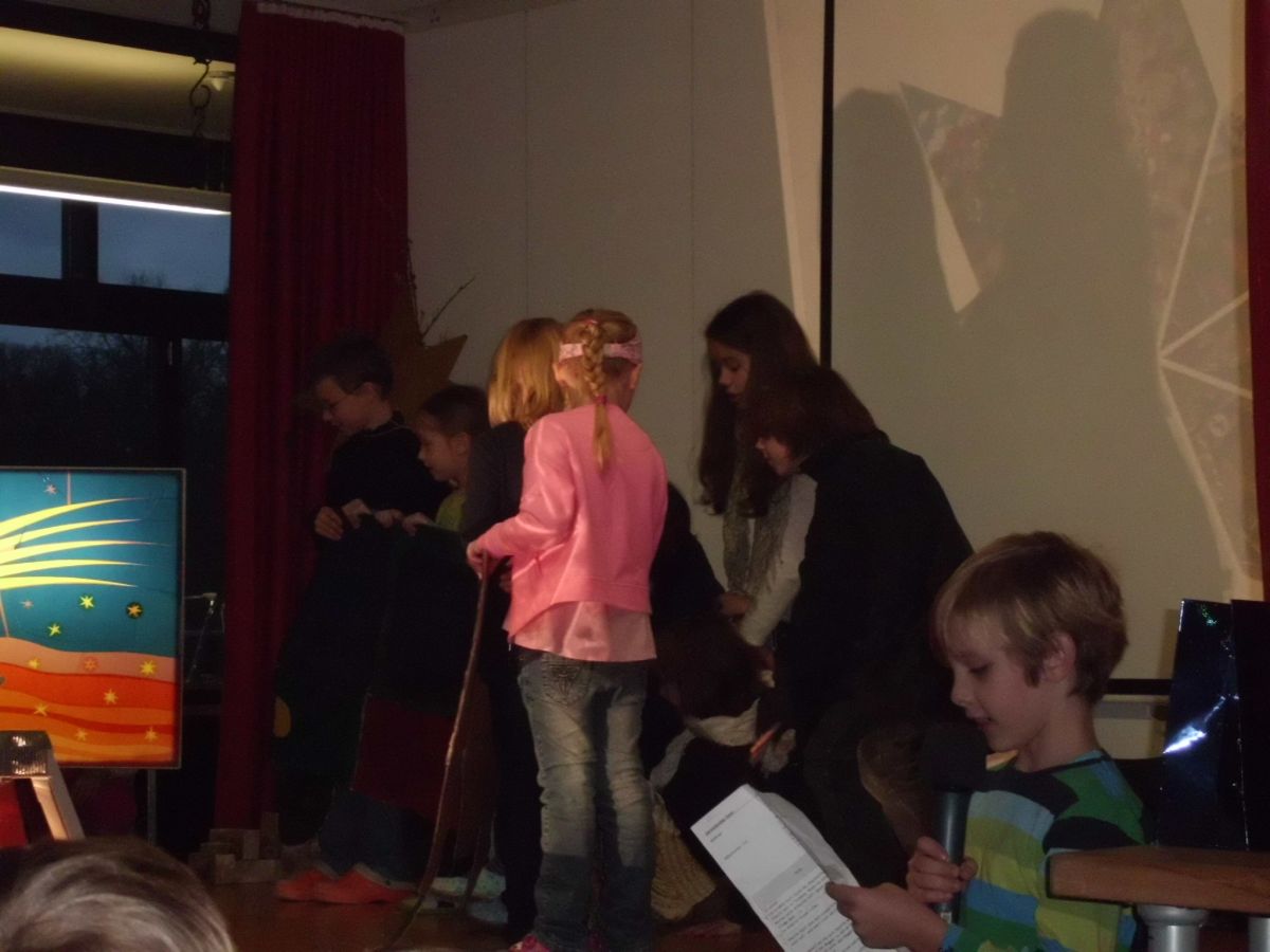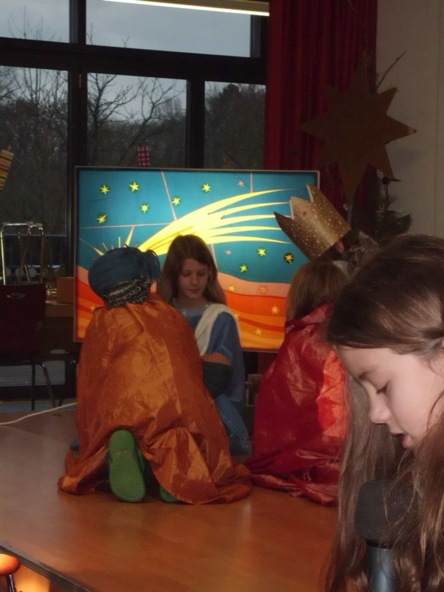 Die Kinder zeigten anhand anschaulicher Spielszenen die Realität und die Armut anderer Kinder in Afrika und wiesen somit auf die diesjährige Spendenaktion der Sternsinger hin. Außerdem stellten sie die Ankunft im Stall bei Maria dar und brachten ihre Geschenke (mit echtem Weihrauch!)