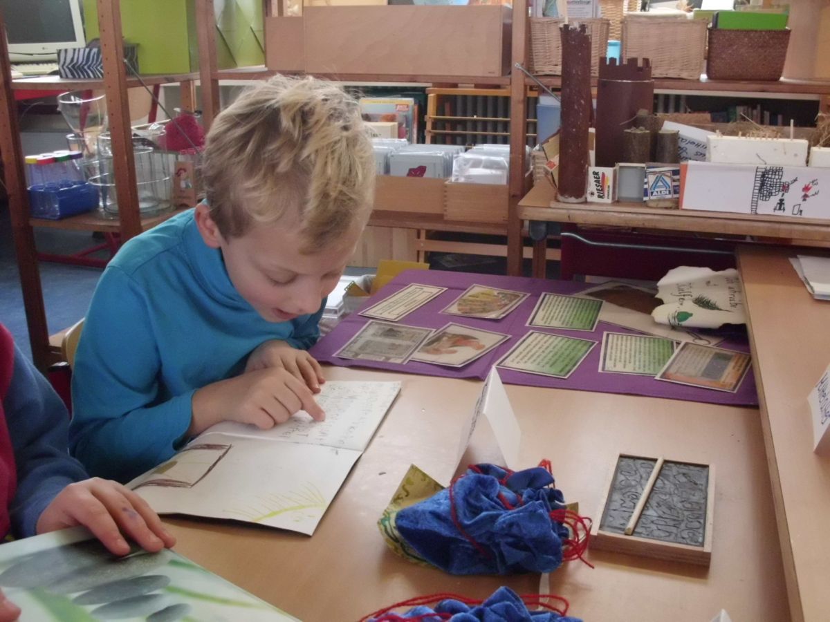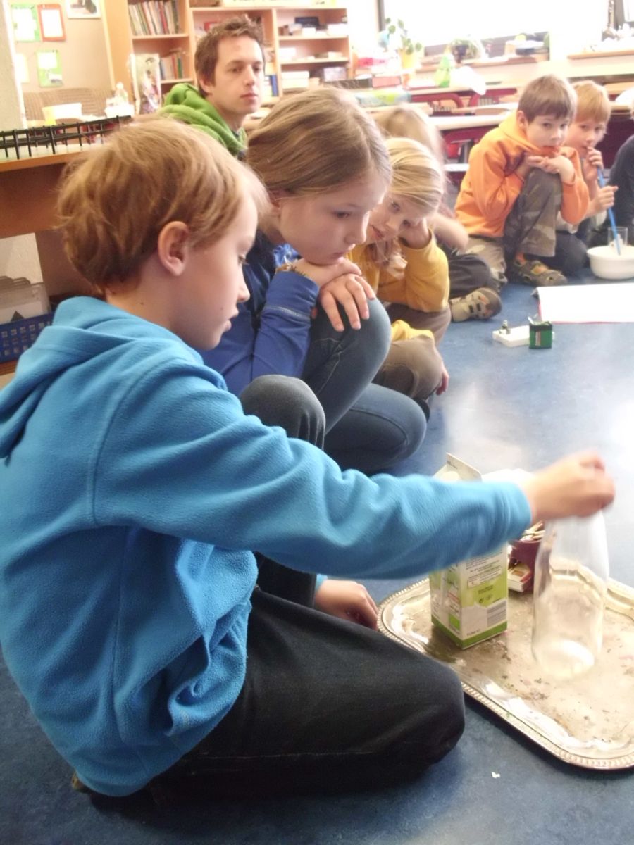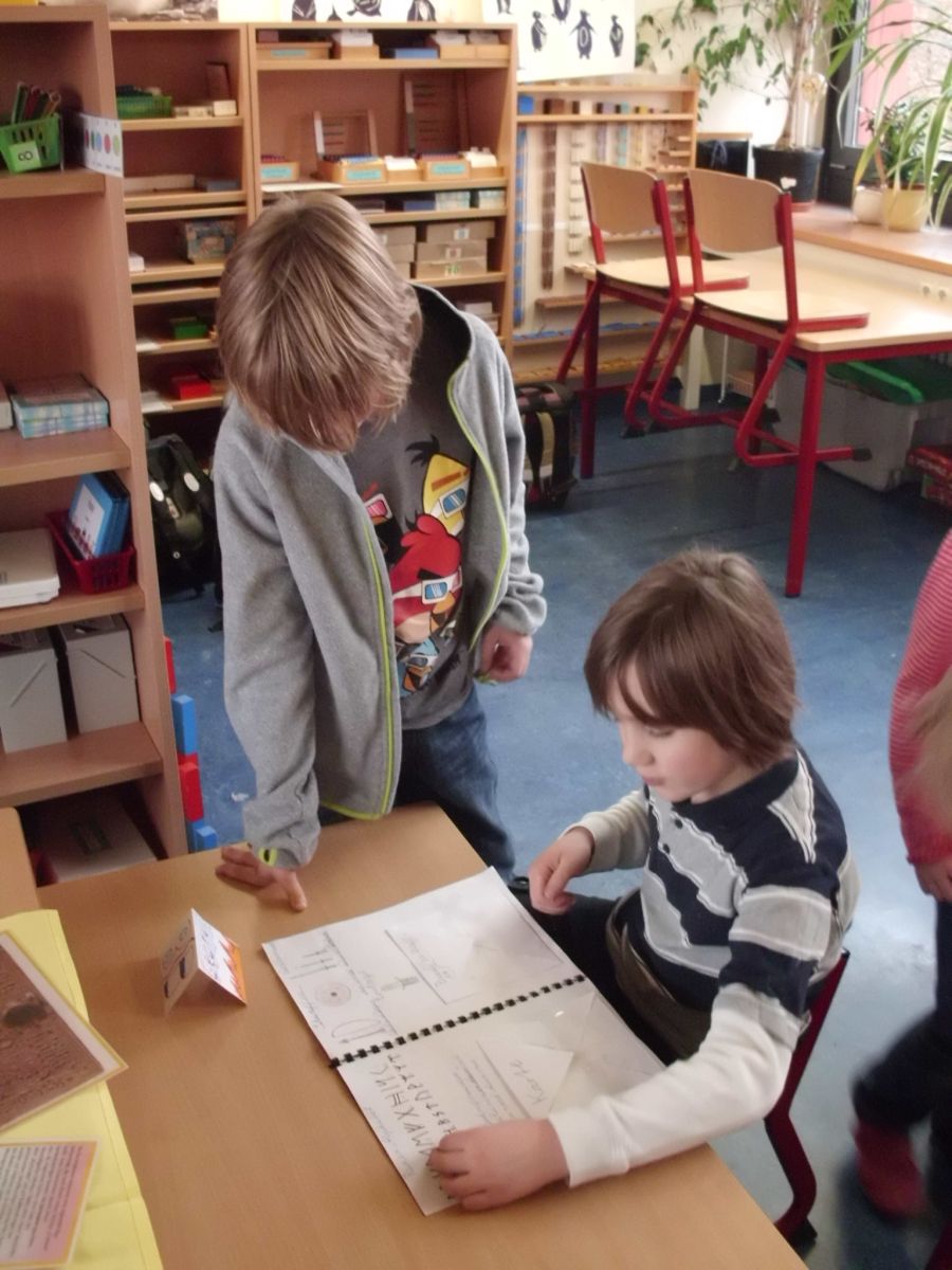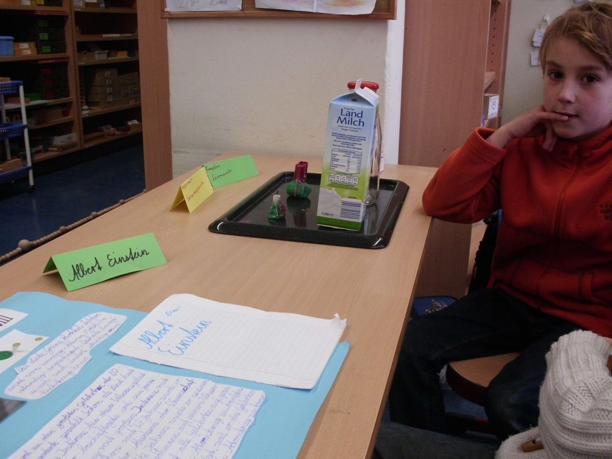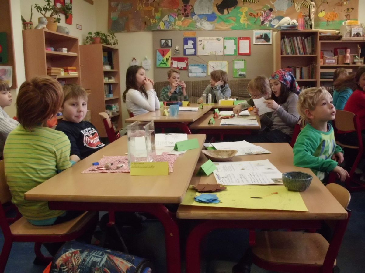In den einzelnen Klassen finden die unterschiedlichsten Projekte statt. Allen gemeinsam ist, dass die Kinder sich wie selbstverständlich mit Material beschäftigen, Nachforschungen anstellen, Hypothesen aufstellen, Experimente anstellen und Plakate herstellen.
