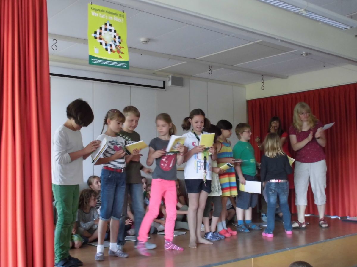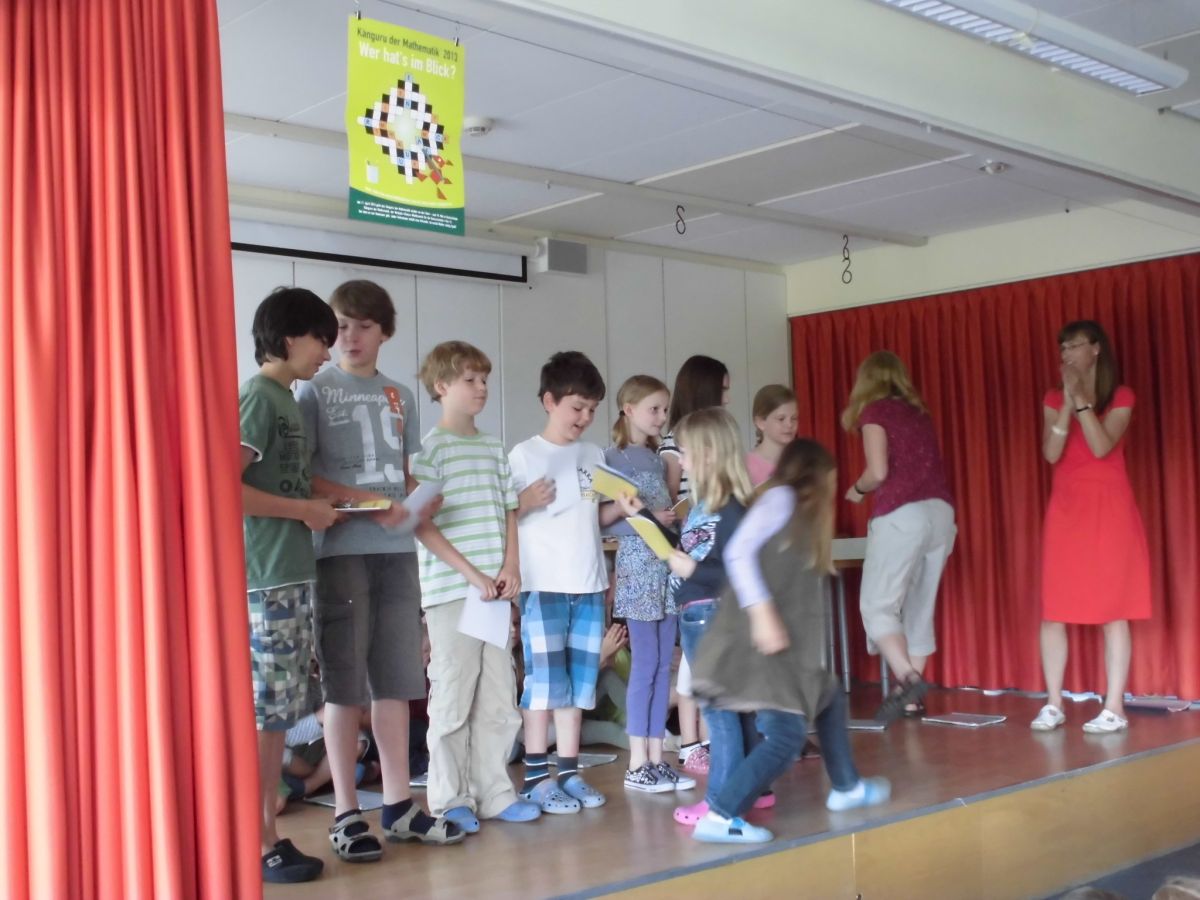 Auszuzeichen gab es einiges: mehrere 2. Preise wurden an Kinder der dritten und vierten Klasse vergeben. Dazu das T-Shirt für den größten Känguru-Sprung (d.h. die meisten richtig gelösten Aufgaben ohne Unterbrechung) und natürlich eine Urkunde für jeden Teilnehmer sowie ein Knobelspiel und das Heft mit allen diesjährigen Aufgaben aller Klassen.
