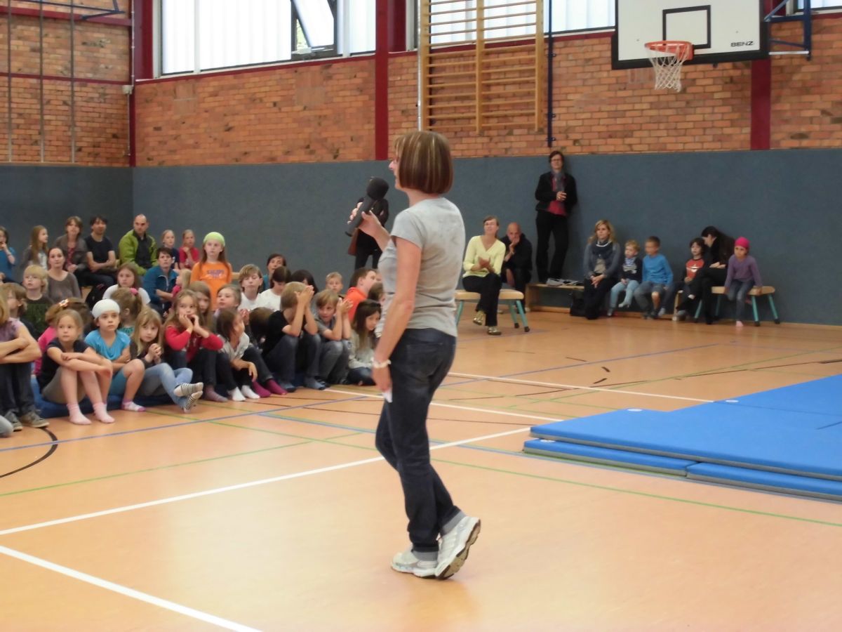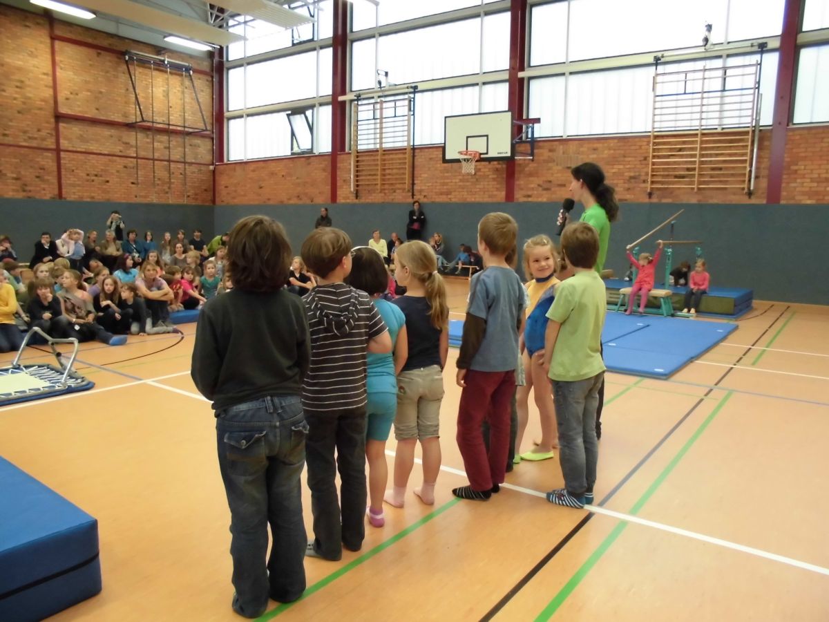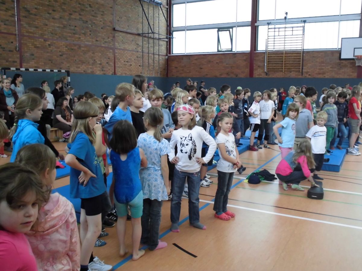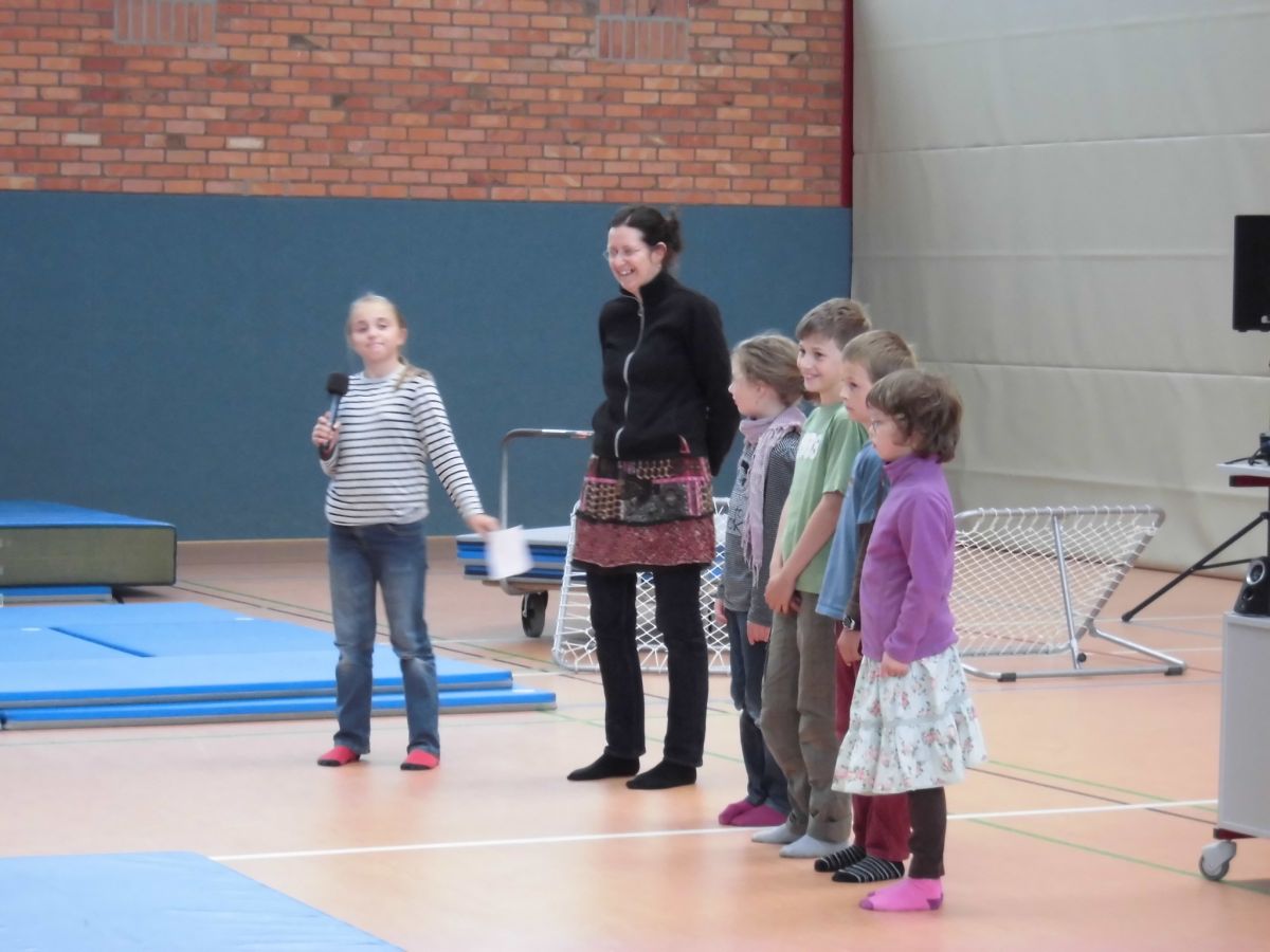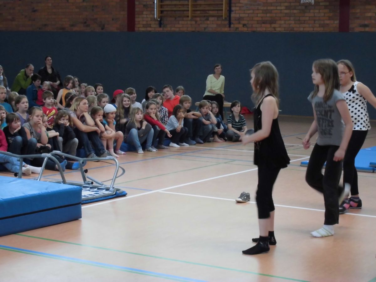 Es folgten die Tänzer, die Fußball-AG, Selbstverteidigung, KIB (Kinder in Bewegung), Kinesologie mit Claudia M. aus dem Hort. Schließlich zeigten die Turnmädels unter Inka aus dem Hort, was sie draufhatten (sogar Salto!), Frau Schuster stellte ihre Judo-Jungs und ihren Sport vor und die letzte AG in der Turnhalle war Rafin (Radio, Film, Internet).