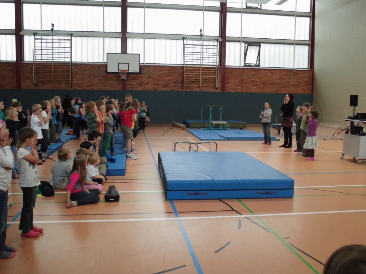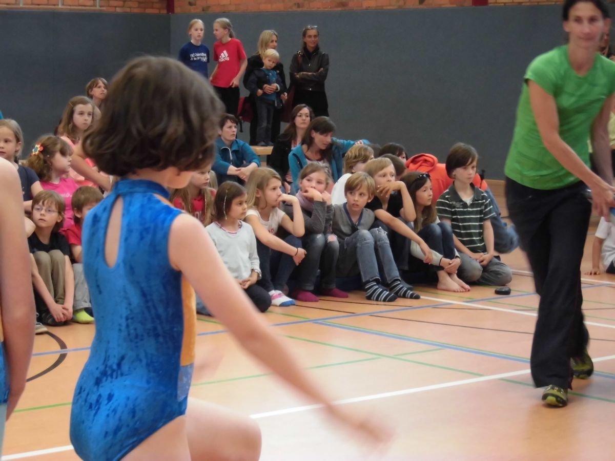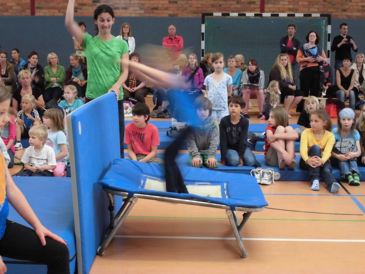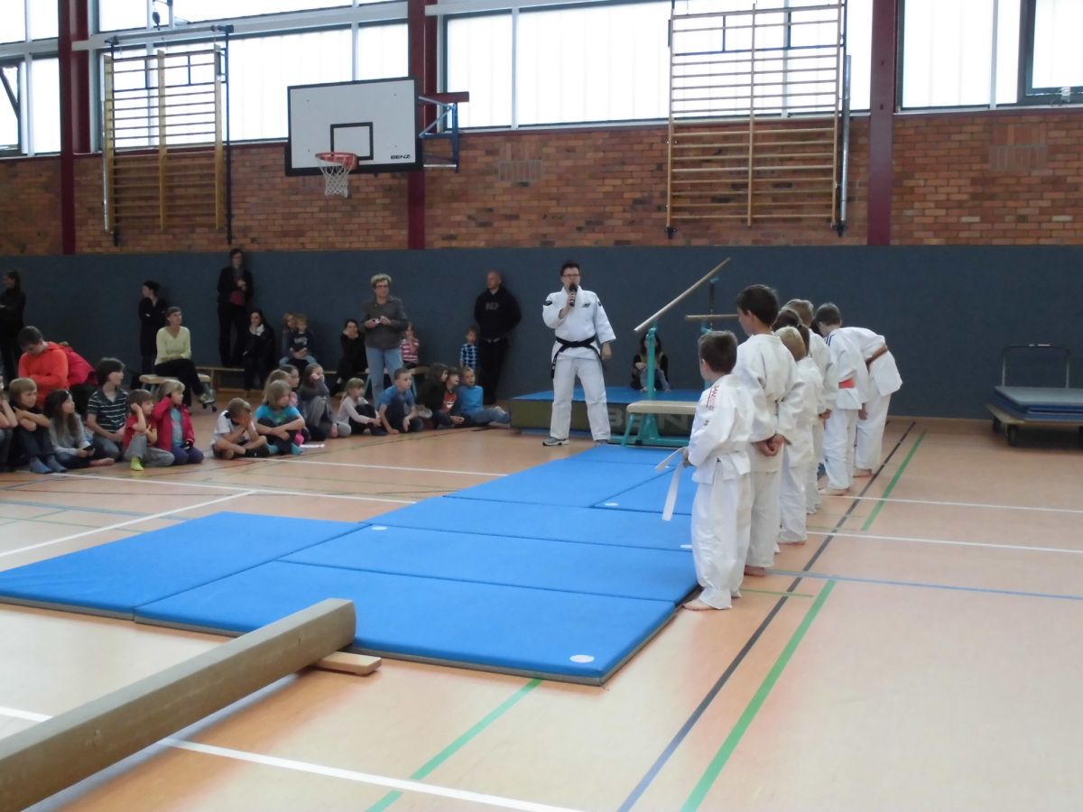 Es folgten die Tänzer, die Fußball-AG, Selbstverteidigung, KIB (Kinder in Bewegung), Kinesologie mit Claudia M. aus dem Hort. Schließlich zeigten die Turnmädels unter Inka aus dem Hort, was sie draufhatten (sogar Salto!), Frau Schuster stellte ihre Judo-Jungs und ihren Sport vor und die letzte AG in der Turnhalle war Rafin (Radio, Film, Internet).
